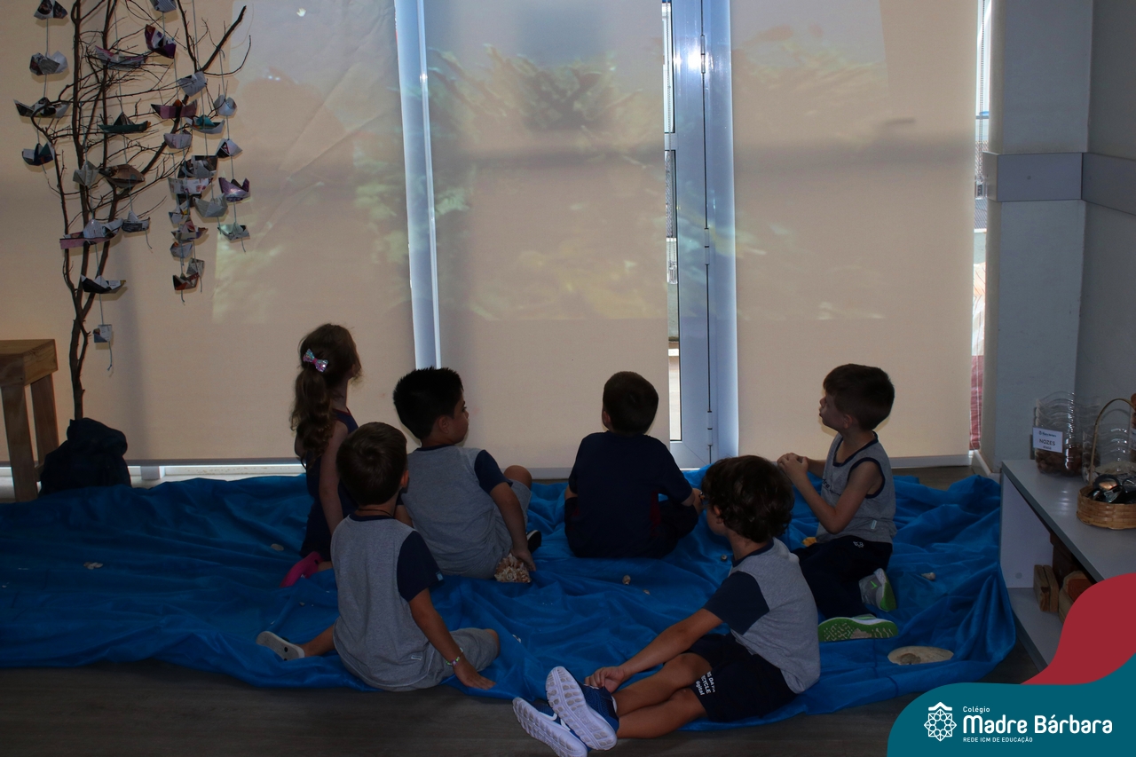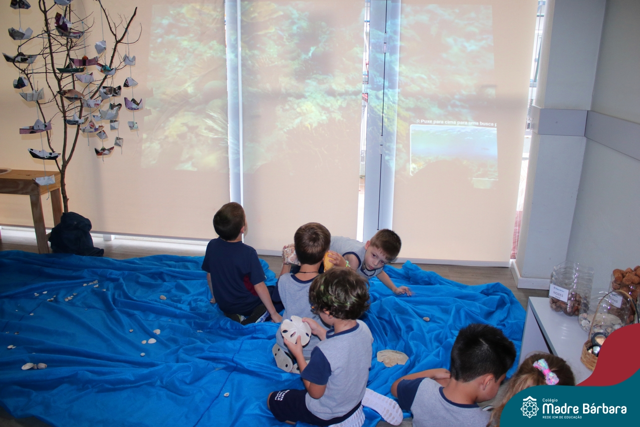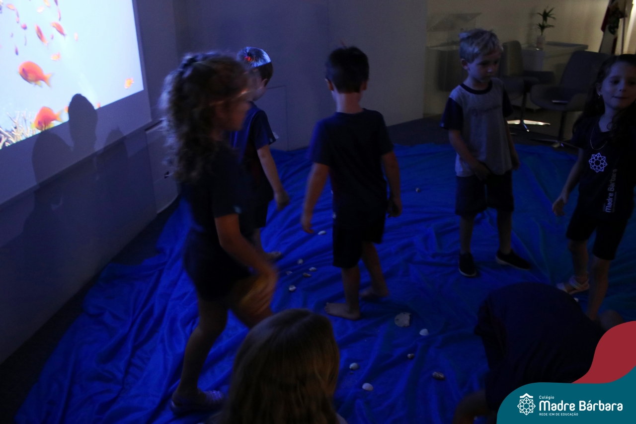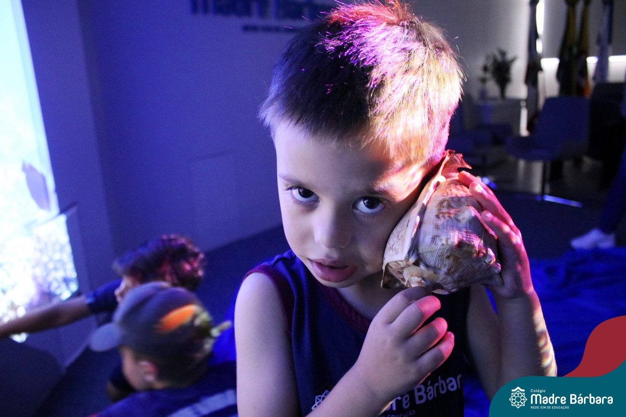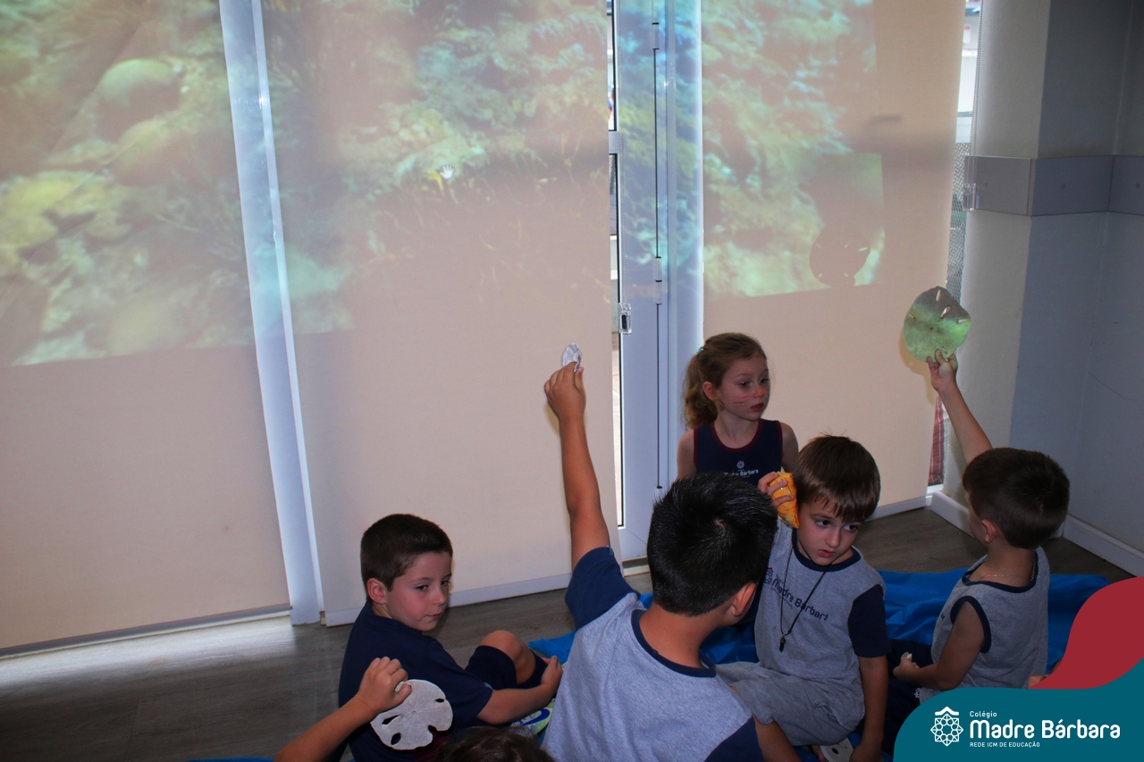 As crianças do Nível 5D foram convidadas a experienciar, sentir e ouvir os encantos do mar a partir do interesse que surgiu após algumas vivências do projeto de acolhida.