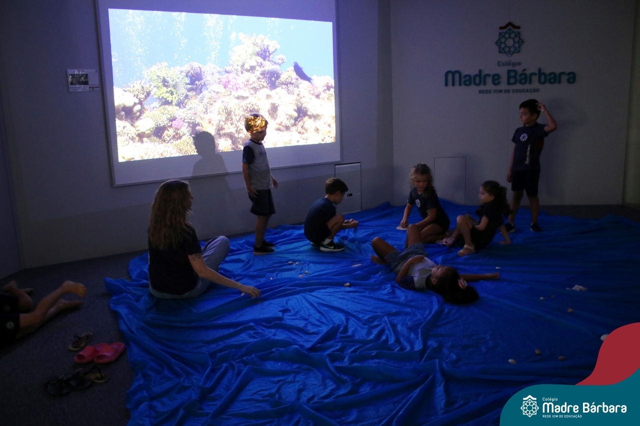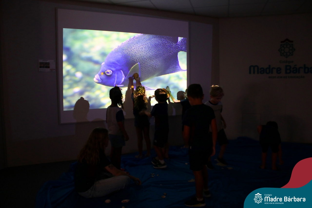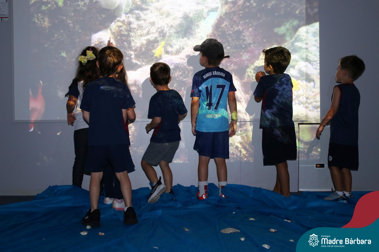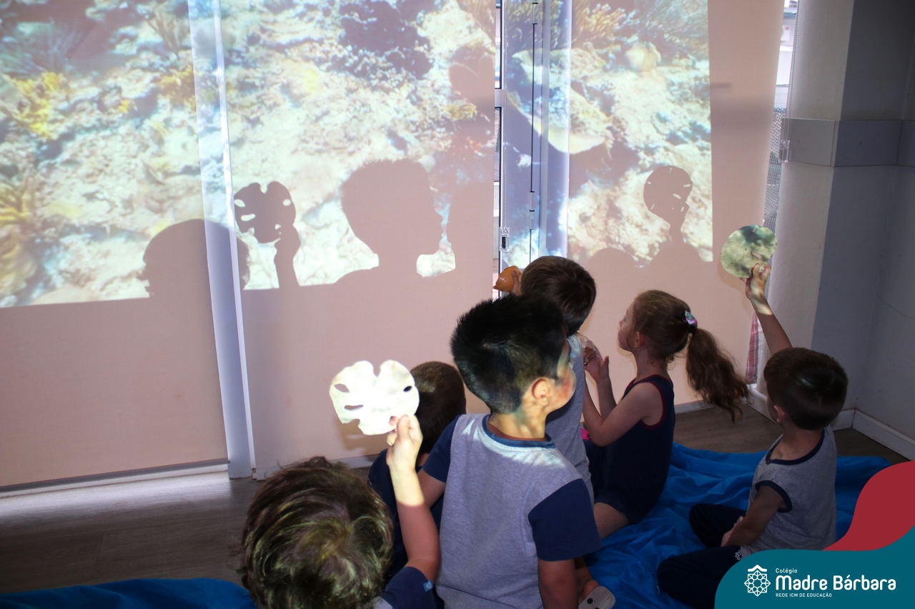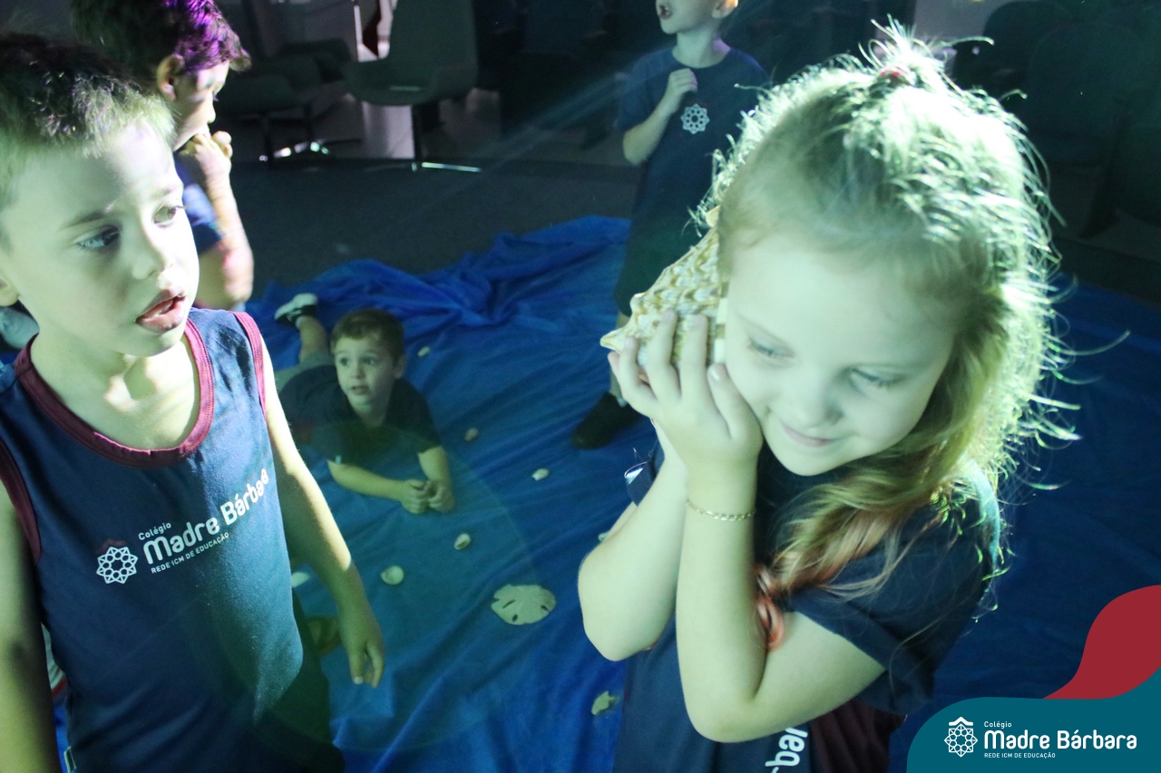 As crianças do Nível 5D foram convidadas a experienciar, sentir e ouvir os encantos do mar a partir do interesse que surgiu após algumas vivências do projeto de acolhida.