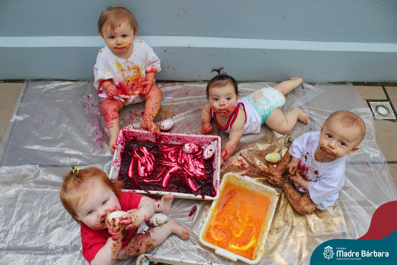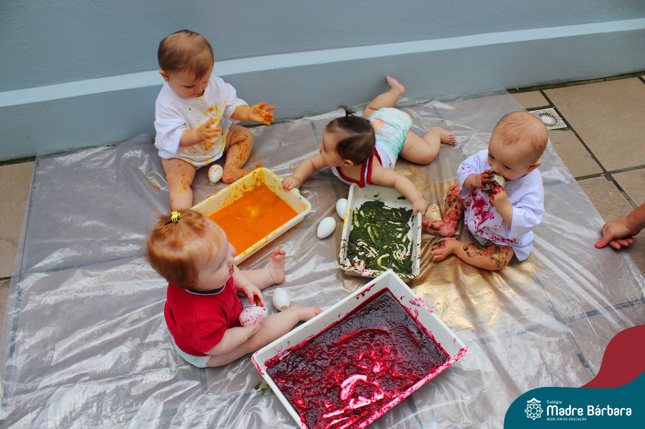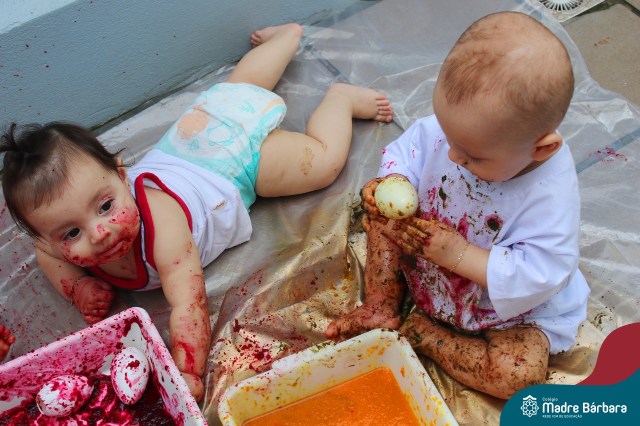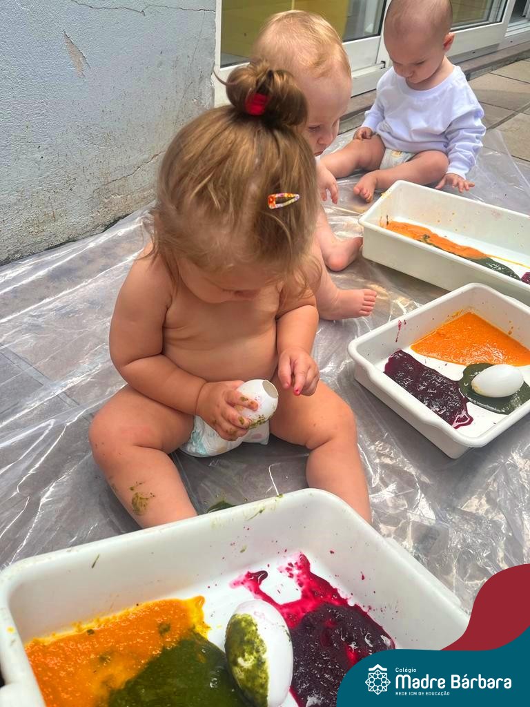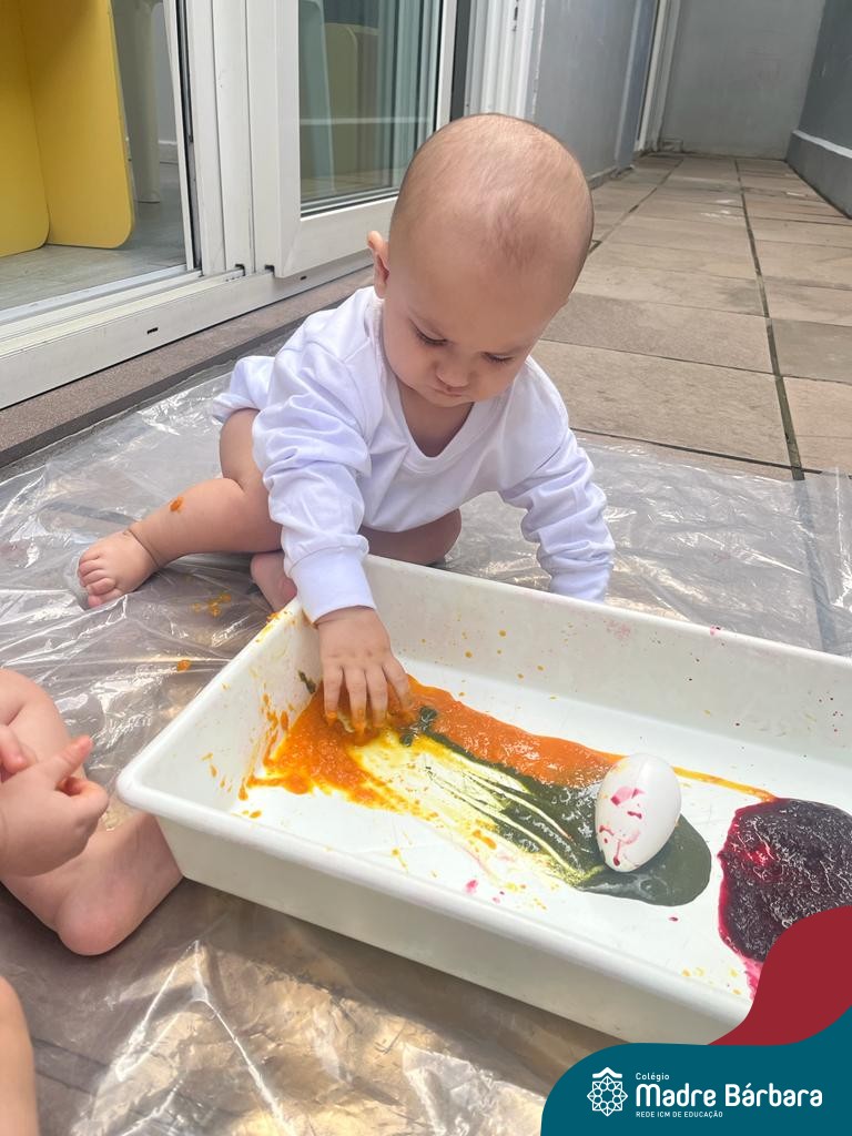 Os bebês do Nível 1A ficaram responsáveis pela pintura das casquinhas dos ovos que estão decorando a árvore em frente à sala. A produção contou com muita alegria, integração, contato, textura e uma delícia de sabores! Com “tinta natural”, os bebês puderam explorar as cores e experimentar a tinta de cenoura, beterraba e de erva-mate.