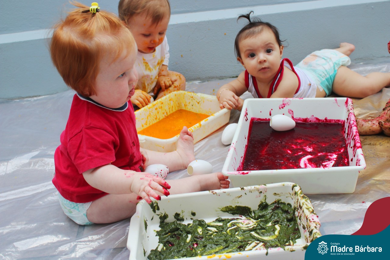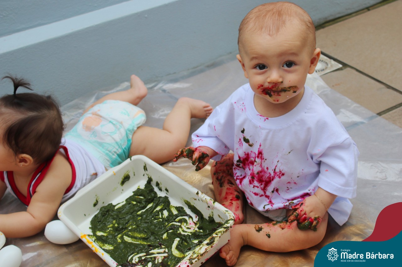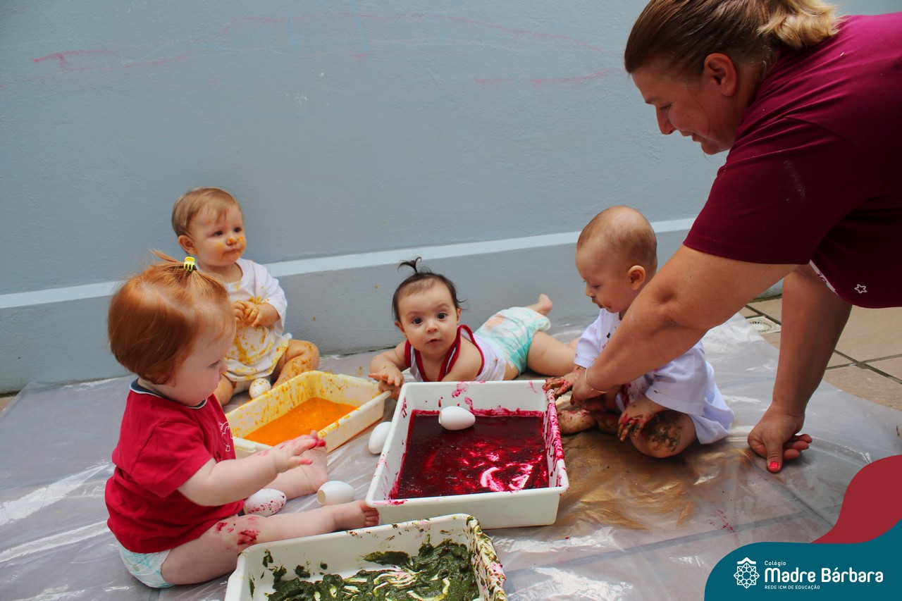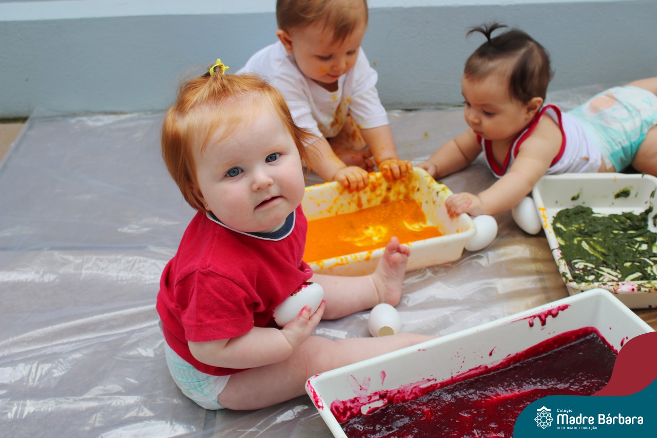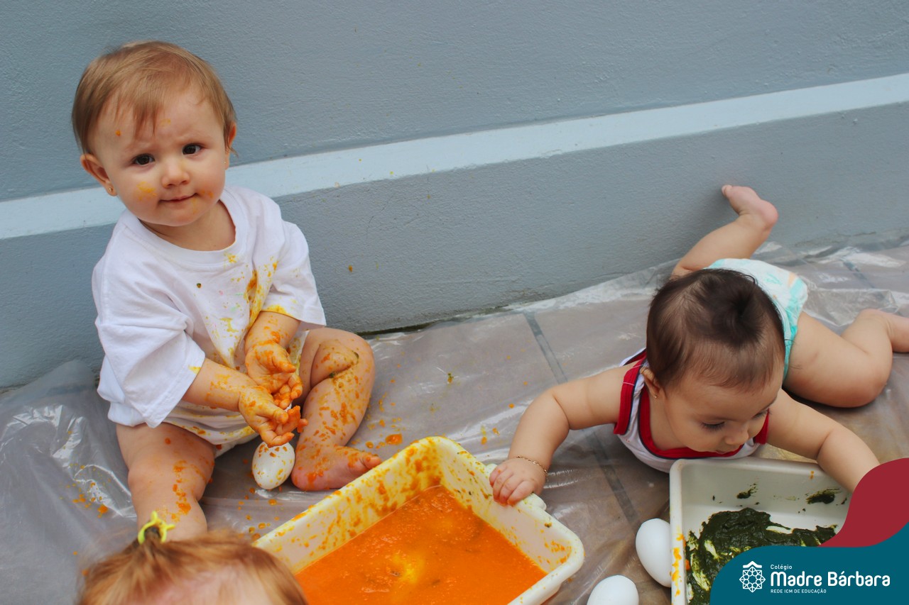 Os bebês do Nível 1A ficaram responsáveis pela pintura das casquinhas dos ovos que estão decorando a árvore em frente à sala. A produção contou com muita alegria, integração, contato, textura e uma delícia de sabores! Com “tinta natural”, os bebês puderam explorar as cores e experimentar a tinta de cenoura, beterraba e de erva-mate.