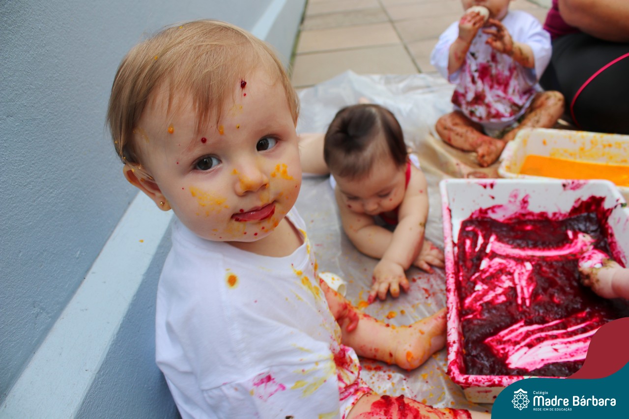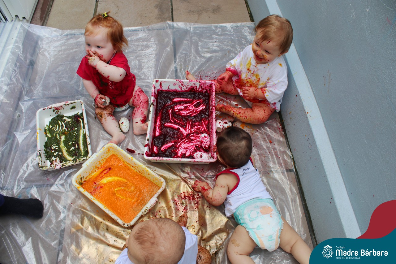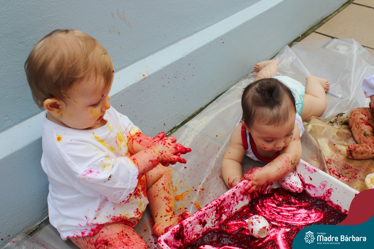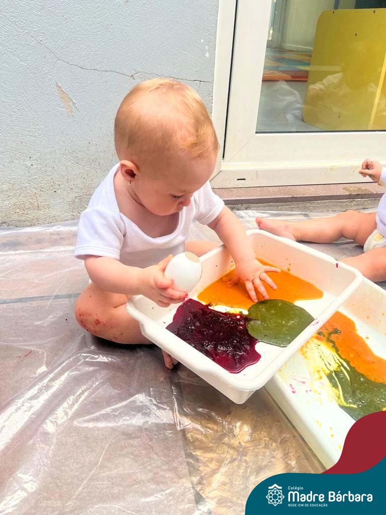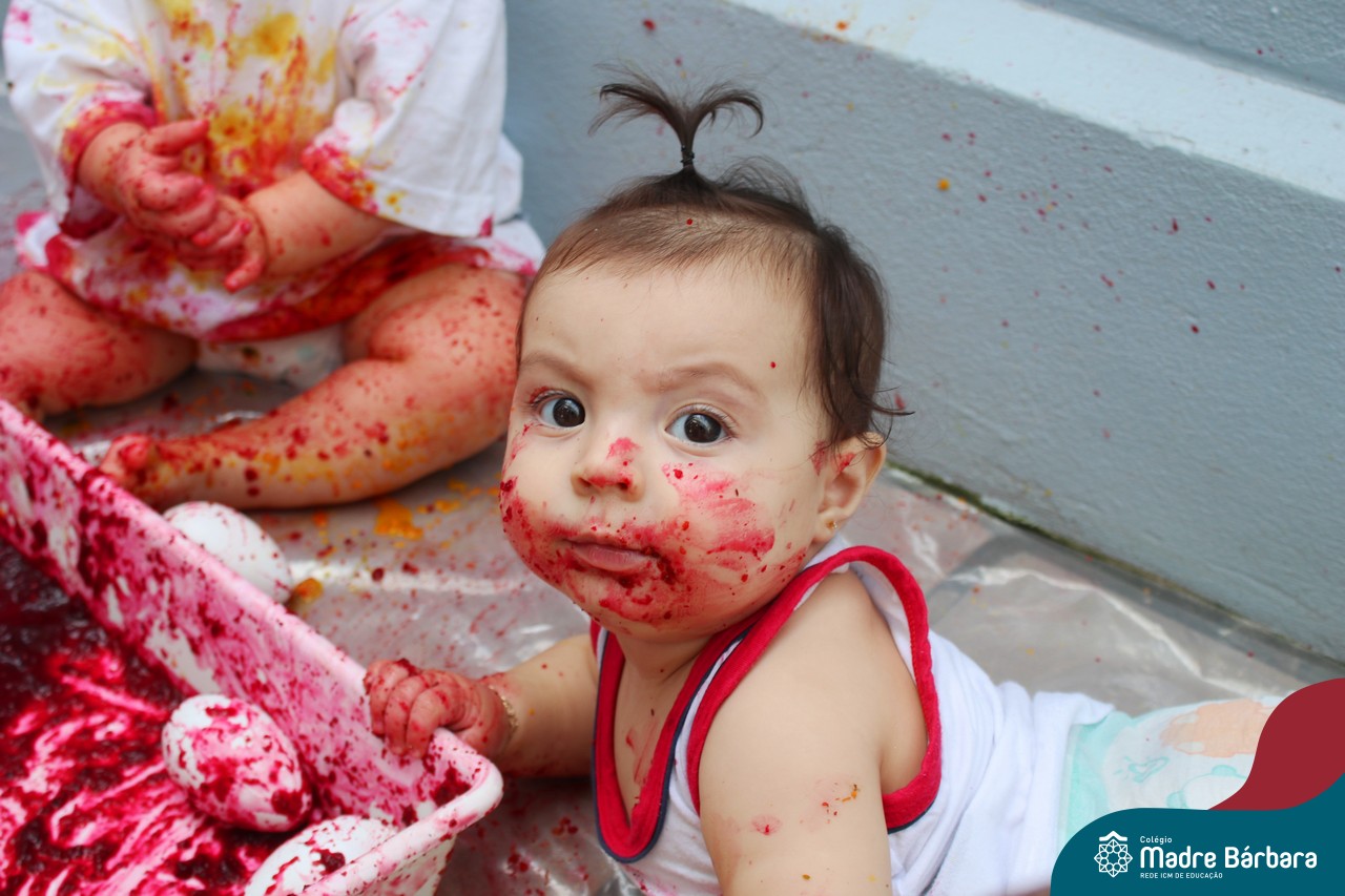Os bebês do Nível 1A ficaram responsáveis pela pintura das casquinhas dos ovos que estão decorando a árvore em frente à sala. A produção contou com muita alegria, integração, contato, textura e uma delícia de sabores! Com “tinta natural”, os bebês puderam explorar as cores e experimentar a tinta de cenoura, beterraba e de erva-mate.