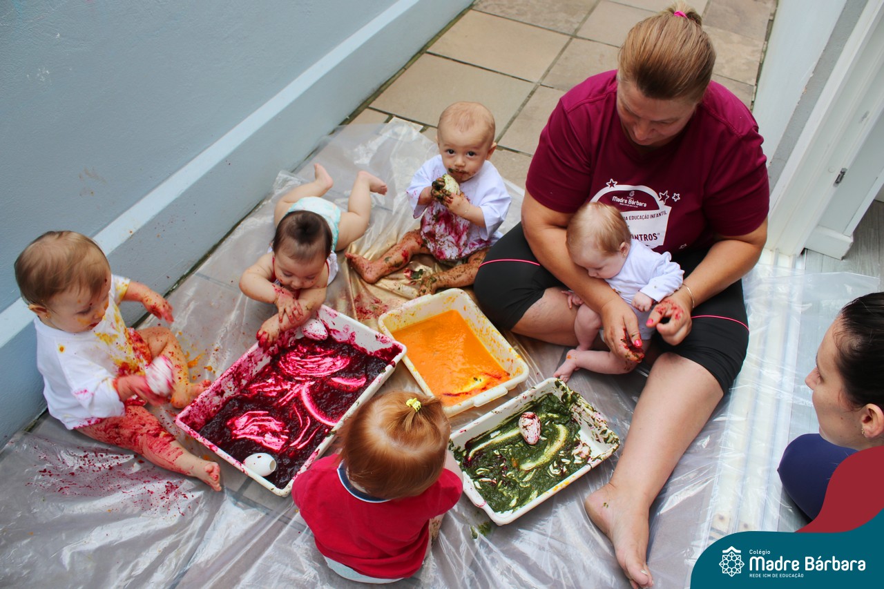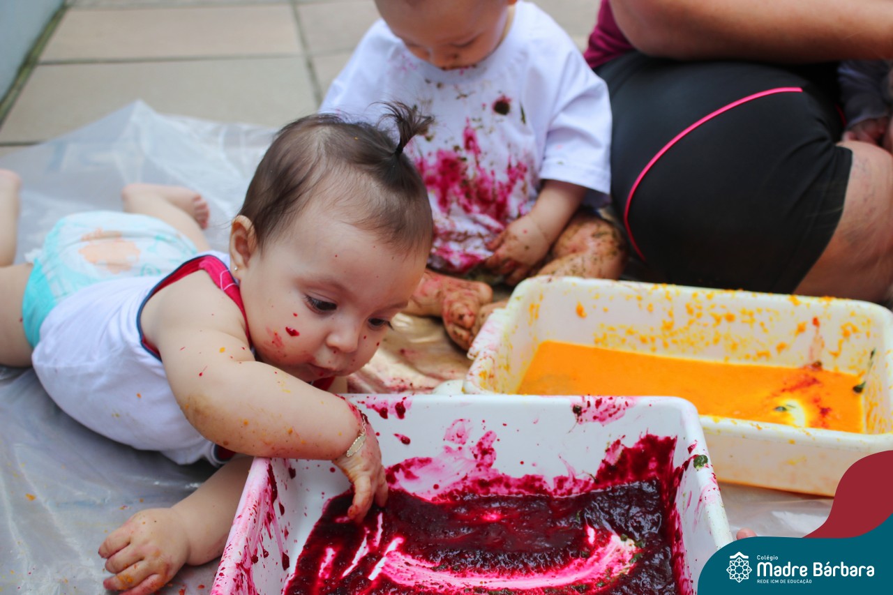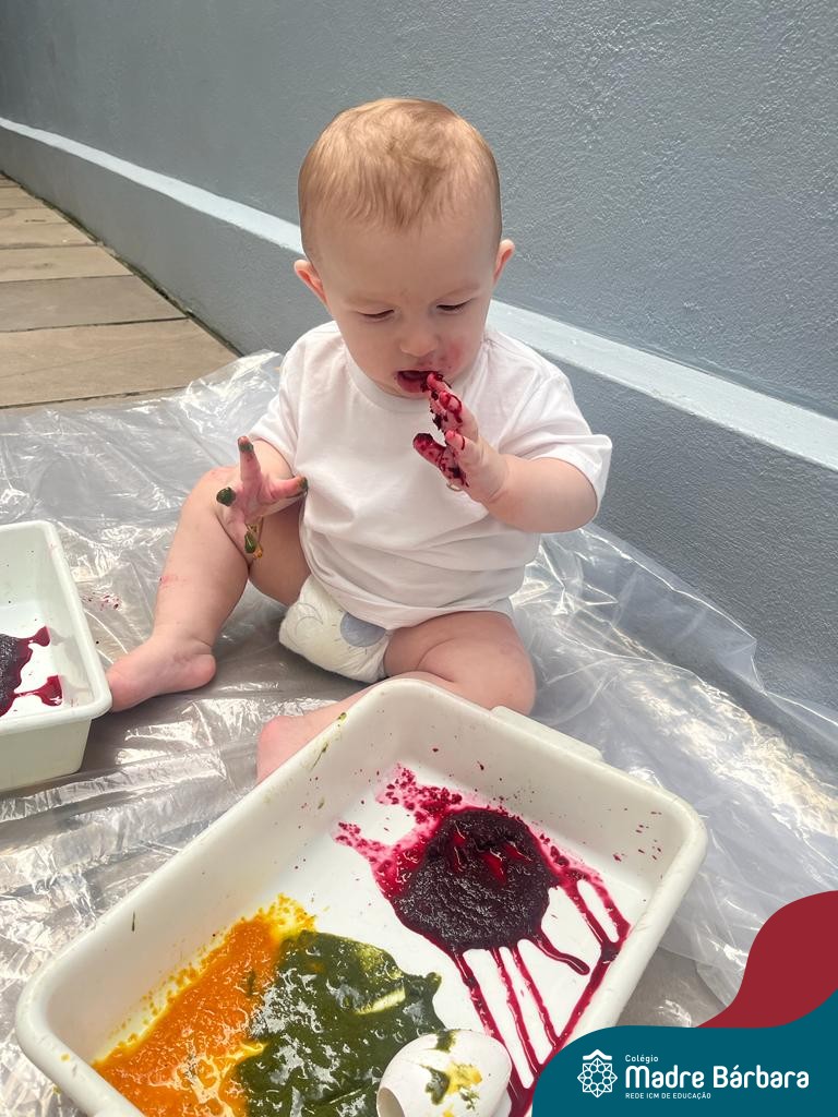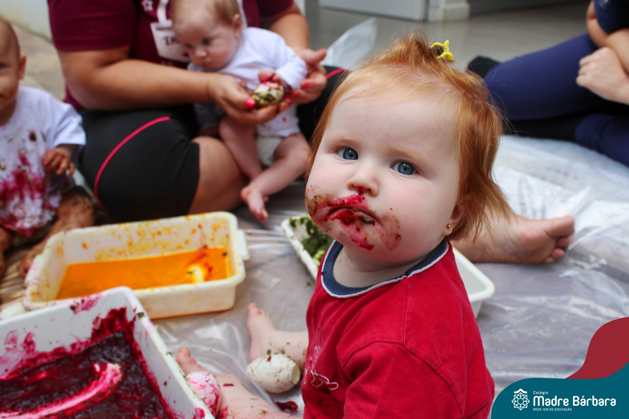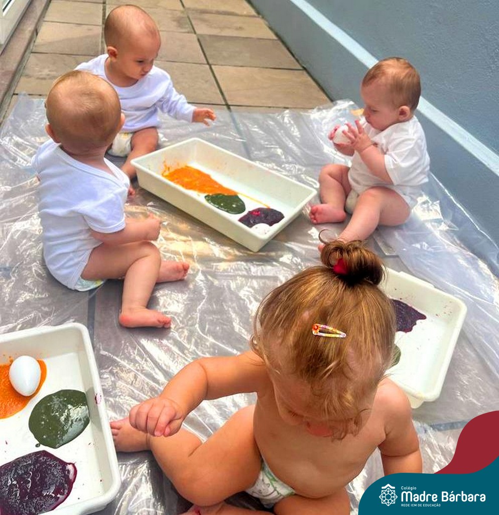 Os bebês do Nível 1A ficaram responsáveis pela pintura das casquinhas dos ovos que estão decorando a árvore em frente à sala. A produção contou com muita alegria, integração, contato, textura e uma delícia de sabores! Com “tinta natural”, os bebês puderam explorar as cores e experimentar a tinta de cenoura, beterraba e de erva-mate.