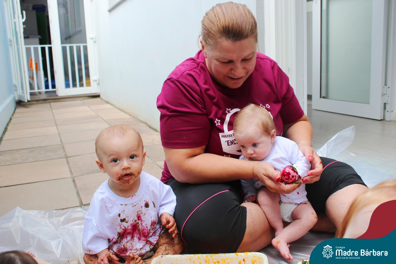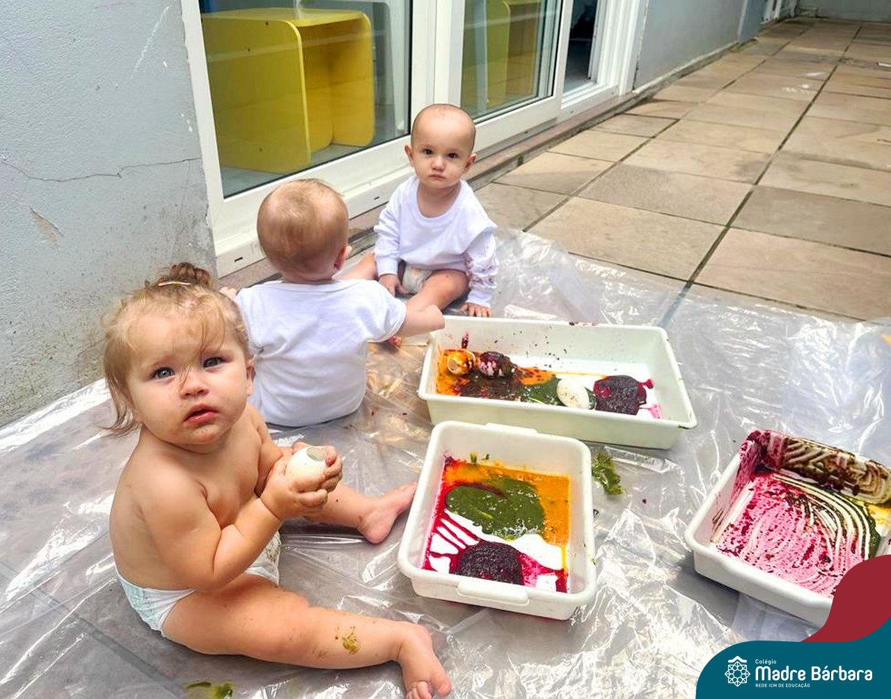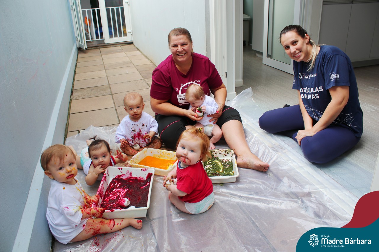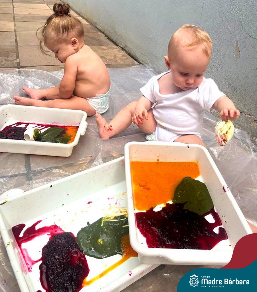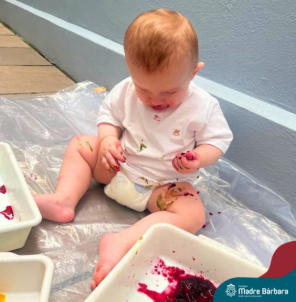 Os bebês do Nível 1A ficaram responsáveis pela pintura das casquinhas dos ovos que estão decorando a árvore em frente à sala. A produção contou com muita alegria, integração, contato, textura e uma delícia de sabores! Com “tinta natural”, os bebês puderam explorar as cores e experimentar a tinta de cenoura, beterraba e de erva-mate.