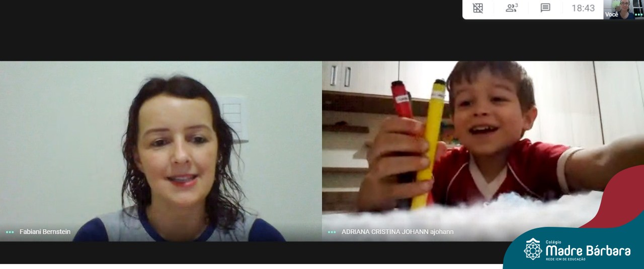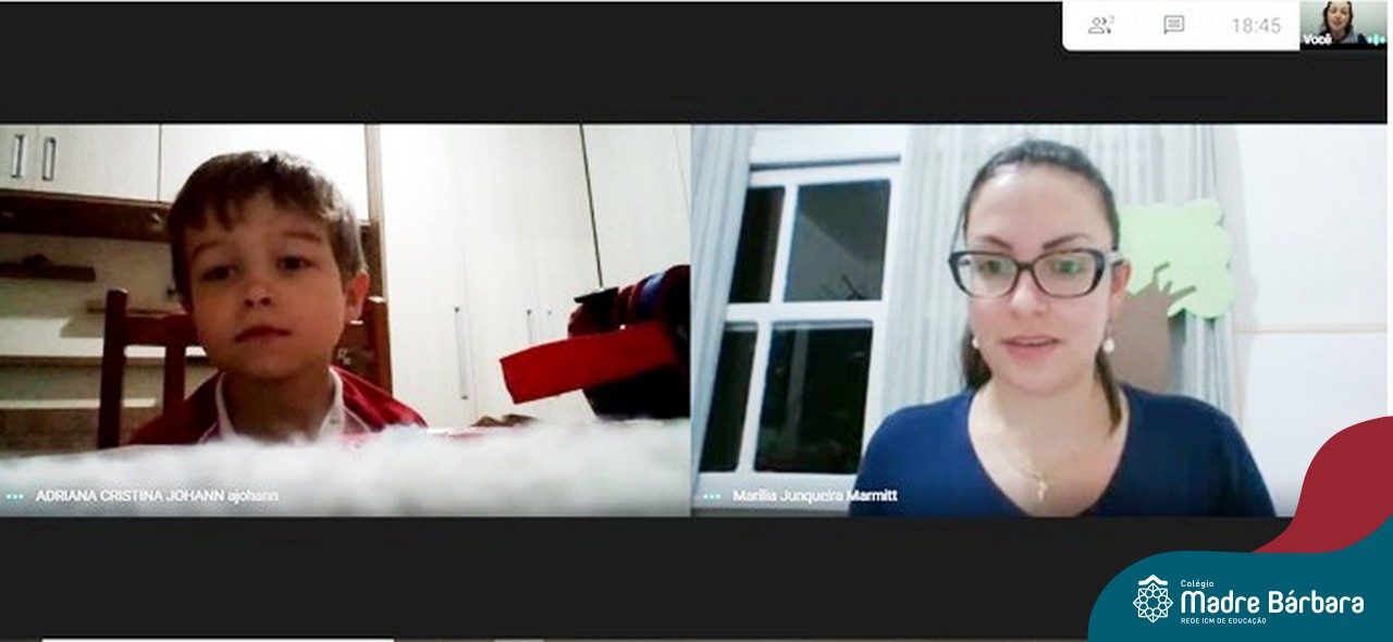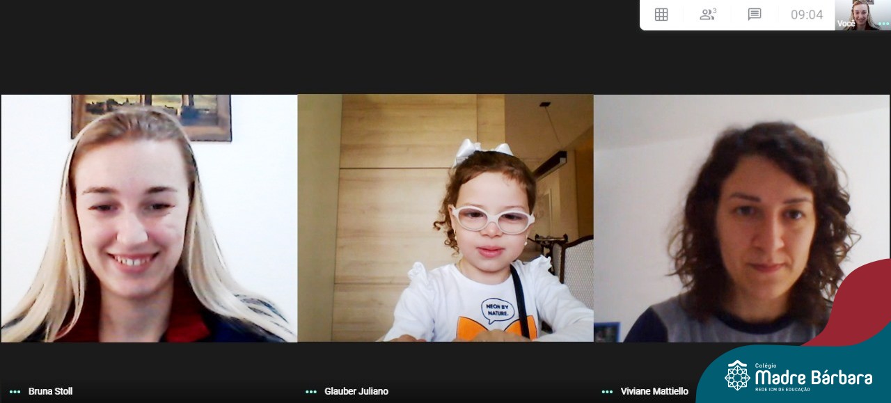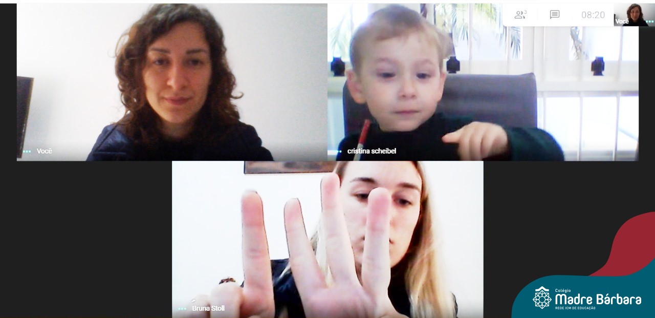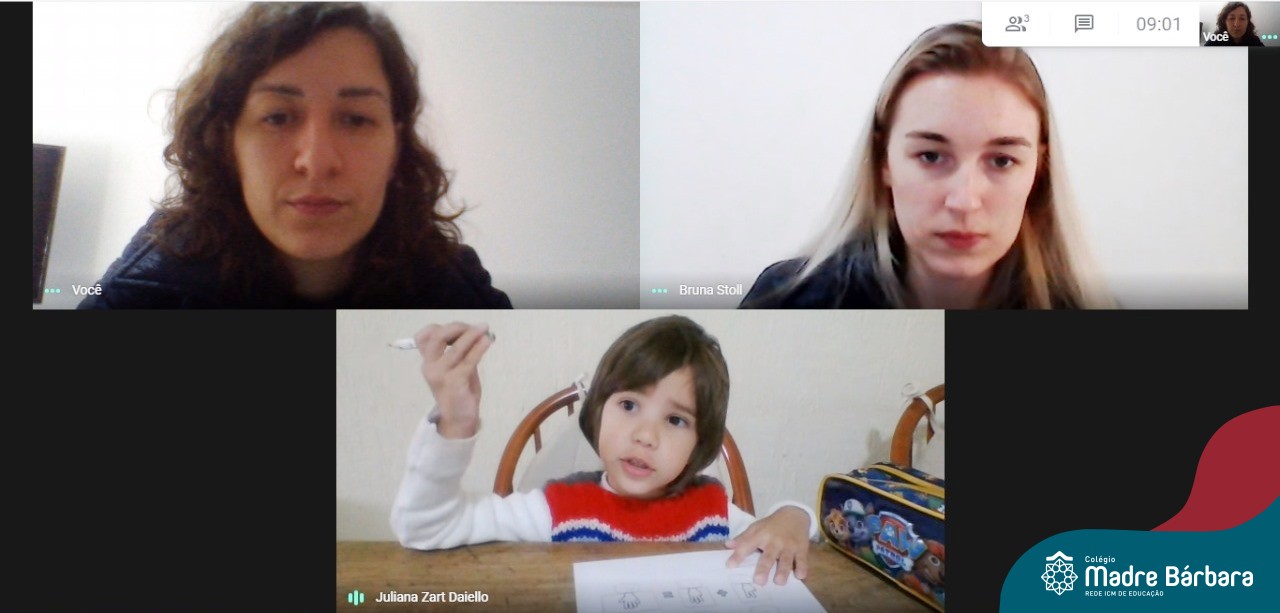 Os Níveis 4 e 5 da Educação Infantil, estão vivenciando na última semana de cada mês, encontros muitos especiais, as “Videochamadas Individuais” através da plataforma do Google Meet. Nestes encontros, as professoras desenvolvem situações de aprendizagem que corroboram ao desenvolvimento integral da criança, sendo possível acompanhá-las de forma individual, bem como, possibilitando o fortalecimento dos vínculos afetivos. Nesta semana o Nível 4 trabalhou a linguagem lógico-matemática através de situações lúdicas com os números. Já o Nível 5 oportunizou vivências muito significativas com a linguagem da escrita ao utilizarem o caderno. Nas demais semanas do mês as videochamas são organizadas em grupos de até 6 crianças.