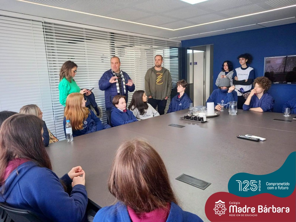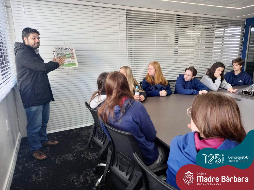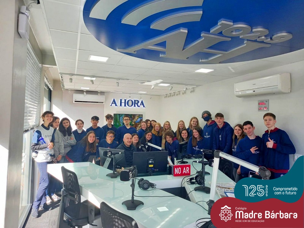 Na manhã desta quarta-feira, dia 15.06, os alunos do 1º ano do Ensino Médio que participam do Itinerário Formativo de Comunicação e Mídias Digitais realizaram uma visita ao Grupo A Hora. Na ocasião, puderam conhecer o funcionamento do grupo e dialogaram com representantes da equipe de edição do jornal impresso, com comunicadores da rádio e também com representantes que cuidam das mídias. Os estudantes conheceram como é o trabalho em um jornal e rádio do século XXI, a rotina do jornalista, além de seleção de notícias e pautas.
