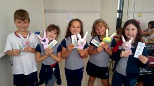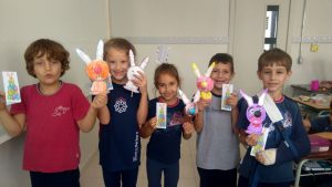 A Turma 22 se divertiu nesta quinta-feira recebendo a visita especial do Coelhinho da Páscoa. A professora Gabriele Sabke conta que nesta semana os alunos foram incentivados a pensar no verdadeiro sentido da data comemorativa e realizaram atividades diversificadas explorando o assunto em questão. Foram dias muito reflexivos e produtivos.