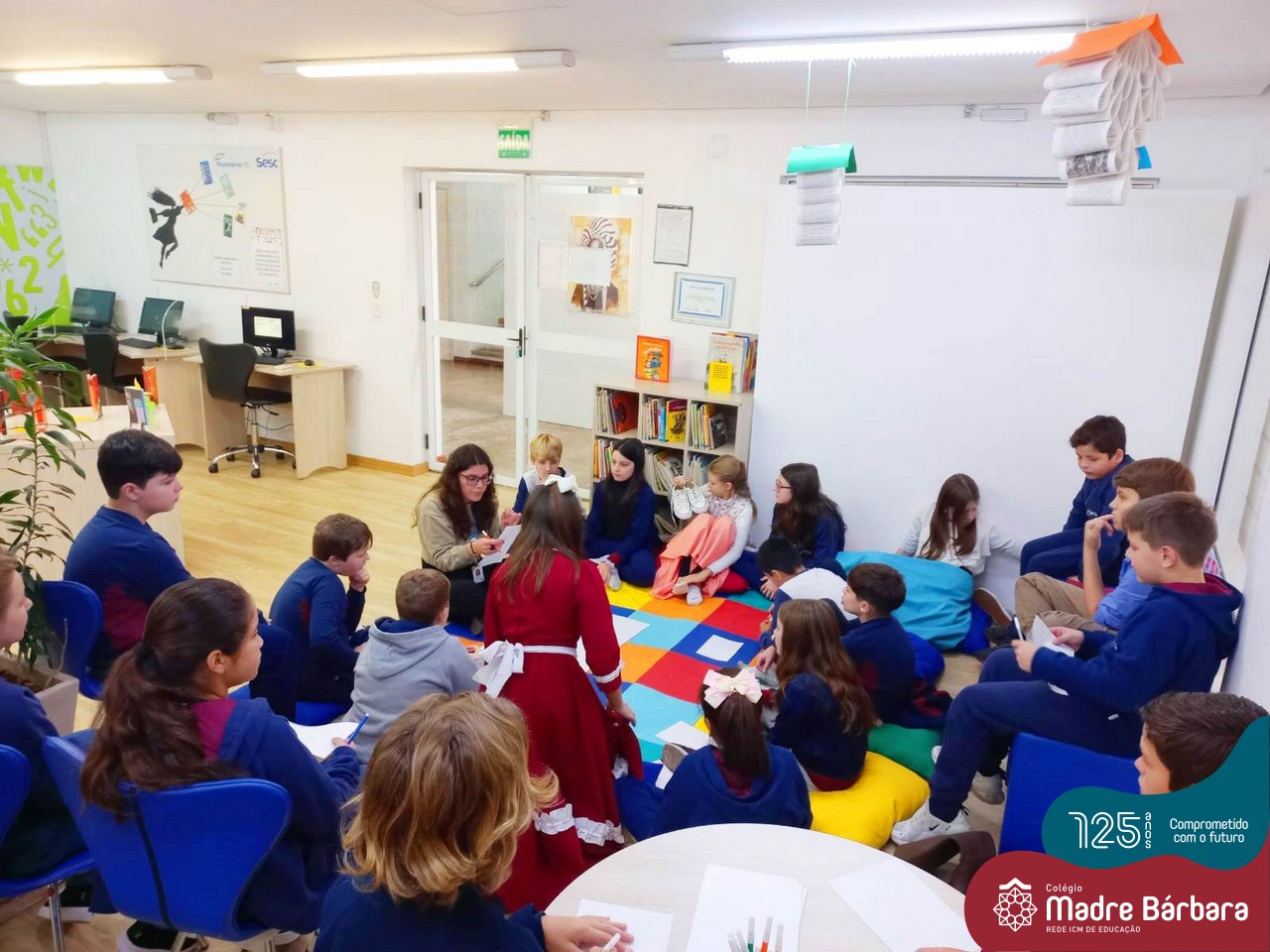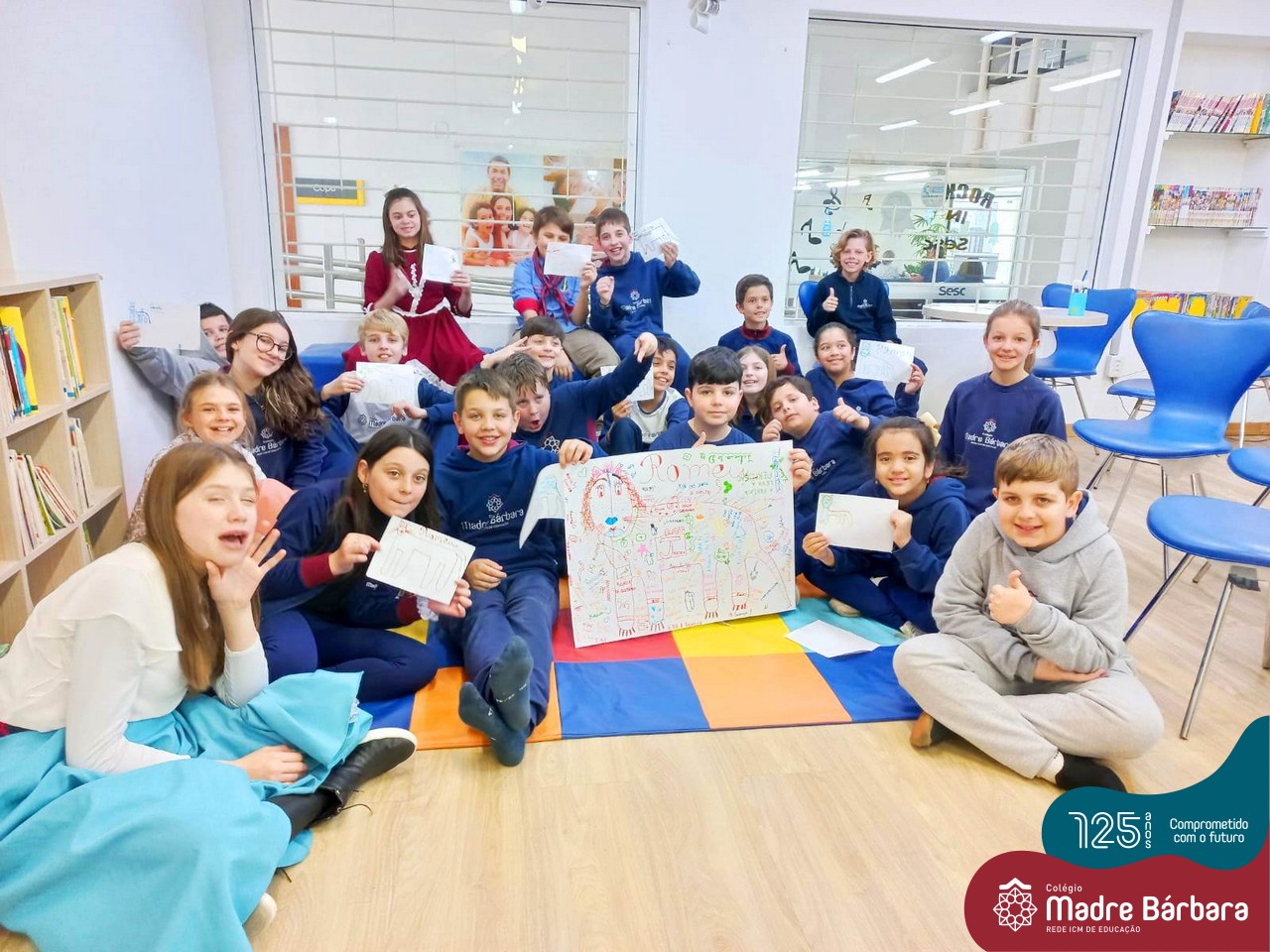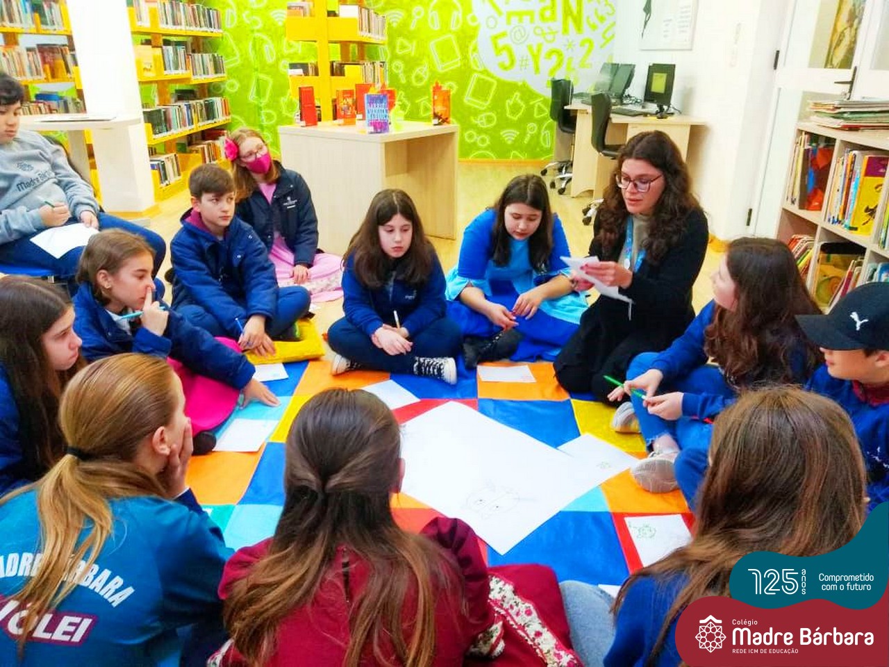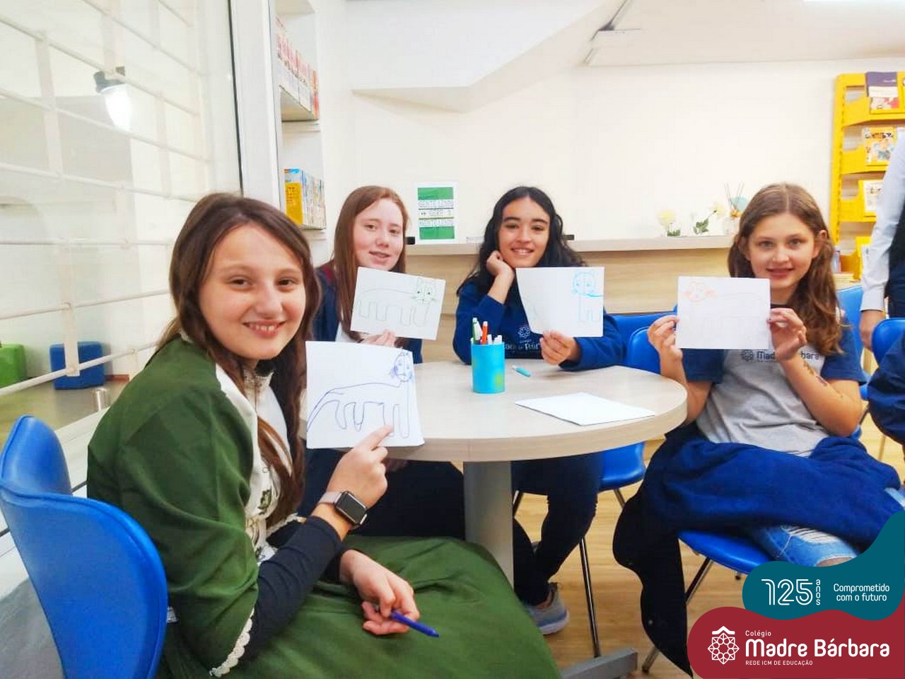 Os estudantes também participaram da hora do conto: “Contos Desenhados”, de Per Gustavsson com a bibliotecária Ketlin. Neste momento, conforme acompanhavam a história iam desenhando.