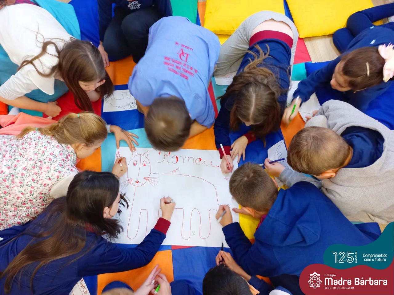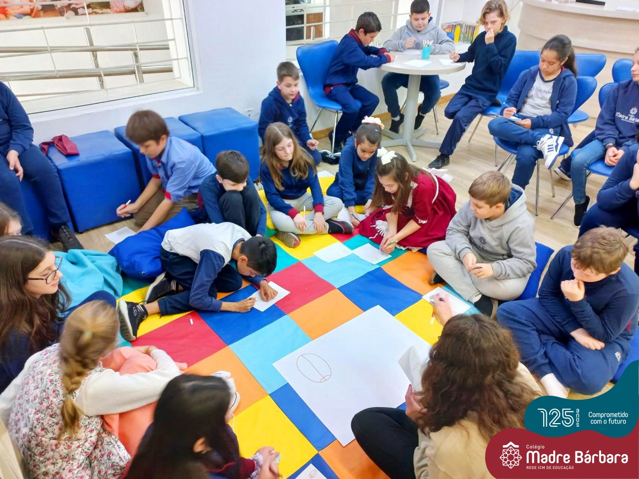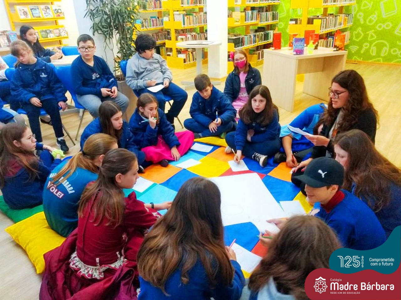 Os estudantes também participaram da hora do conto: “Contos Desenhados”, de Per Gustavsson com a bibliotecária Ketlin. Neste momento, conforme acompanhavam a história iam desenhando.