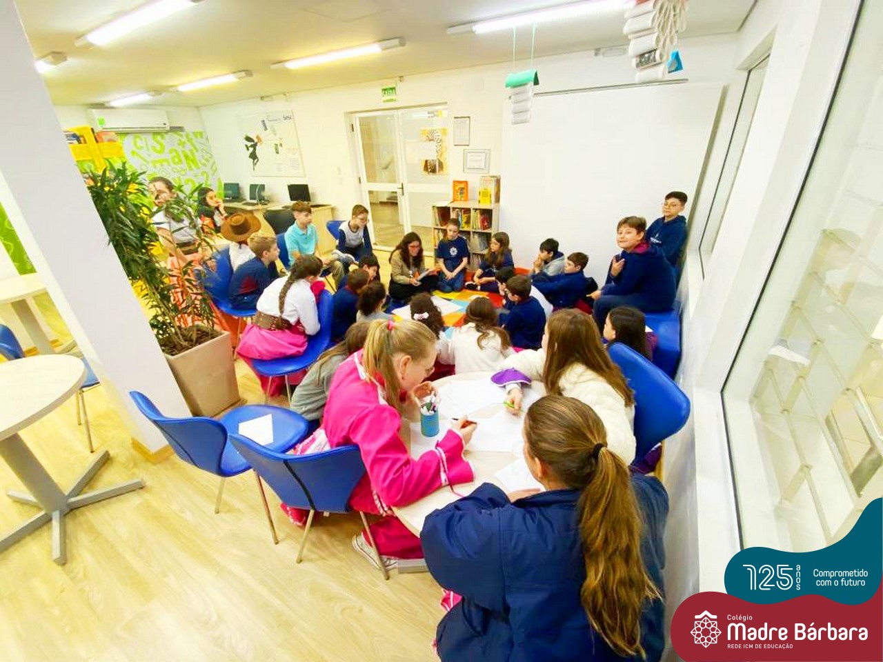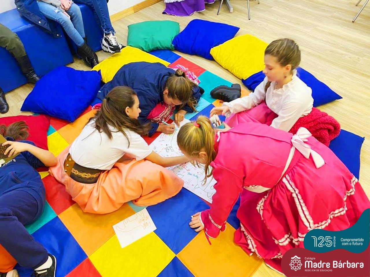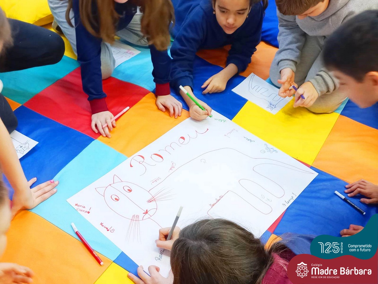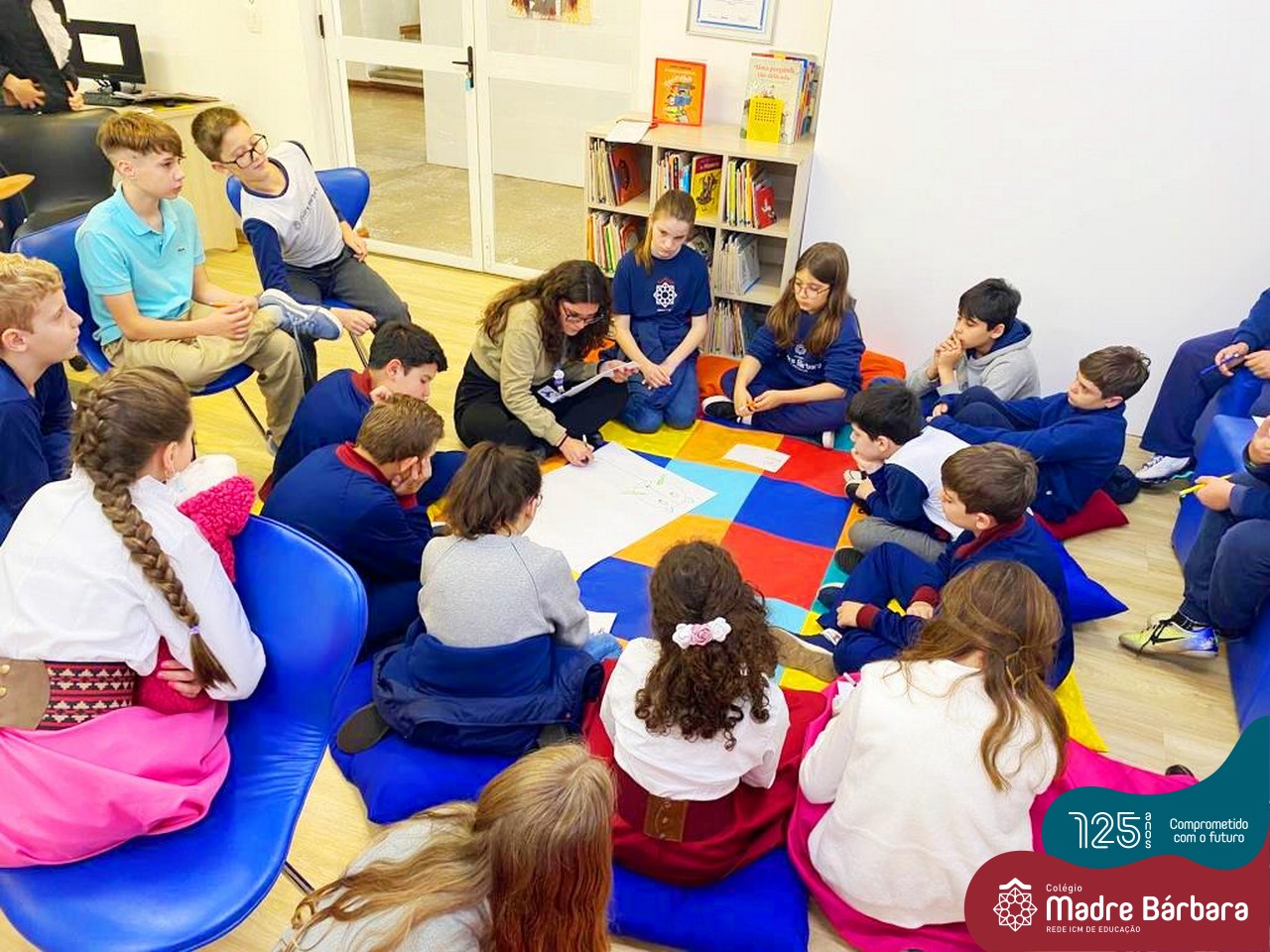 Os estudantes também participaram da hora do conto: “Contos Desenhados”, de Per Gustavsson com a bibliotecária Ketlin. Neste momento, conforme acompanhavam a história iam desenhando.