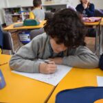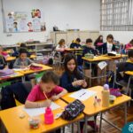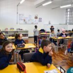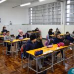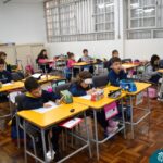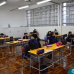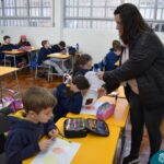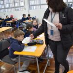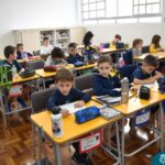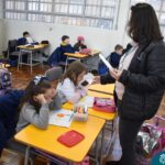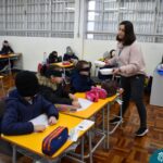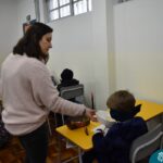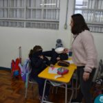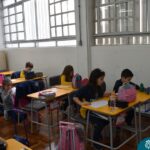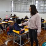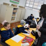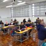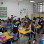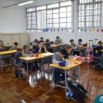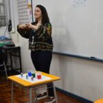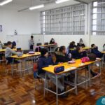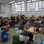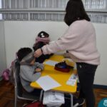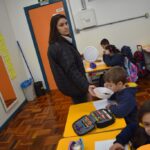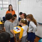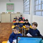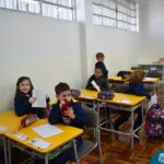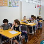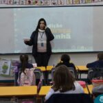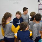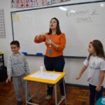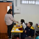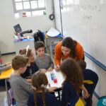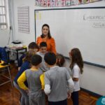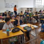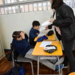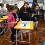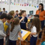 Ainda vendados, os alunos tocaram nos colegas e tentaram adivinhar quem eram, utilizando palavras em inglês sobre características físicas aprendidas em aula, e identificando se eram “boy” ou “girl”.