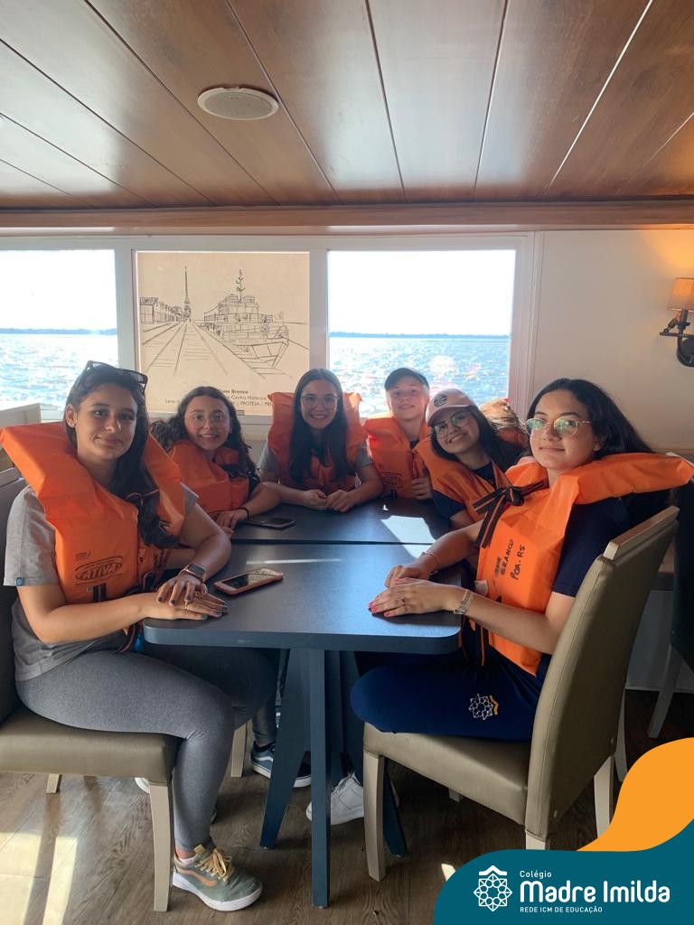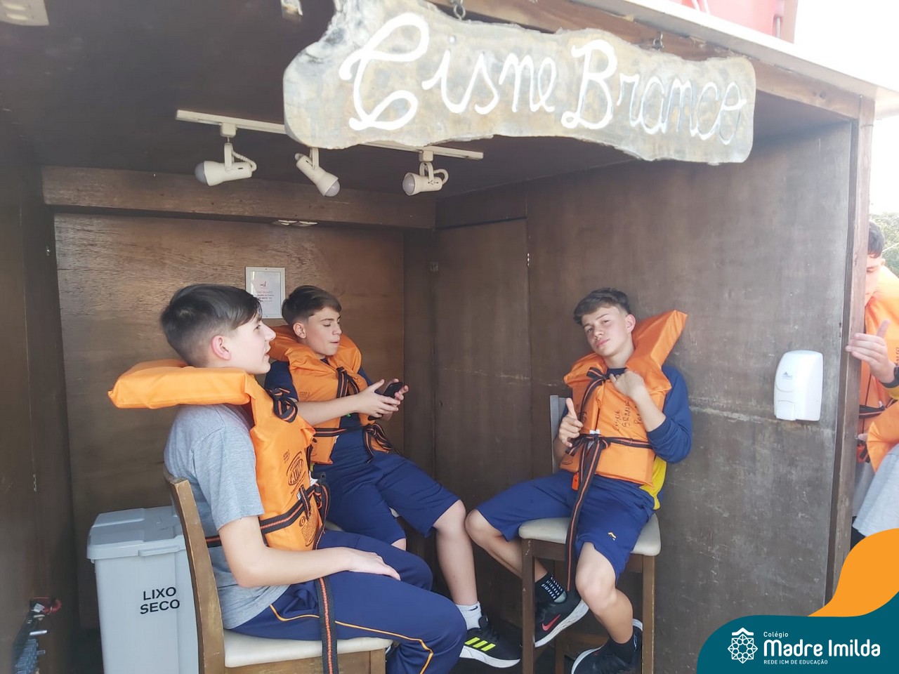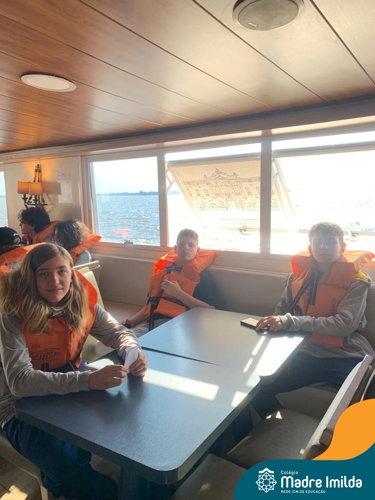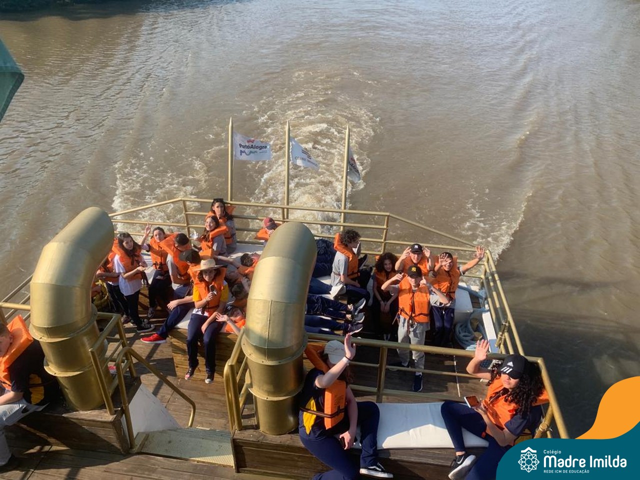 A programação não parou por aí! A próxima parada foi no Cais do Porto, onde o grupo embarcou em uma experiência única: um passeio de barco pelo majestoso Guaíba. A bordo do Passeio de Barco Cisne Branco, nossos alunos desfrutaram de uma vista espetacular da cidade, da paisagem ribeirinha e do pôr do sol enquanto navegavam nas águas tranquilas do rio.