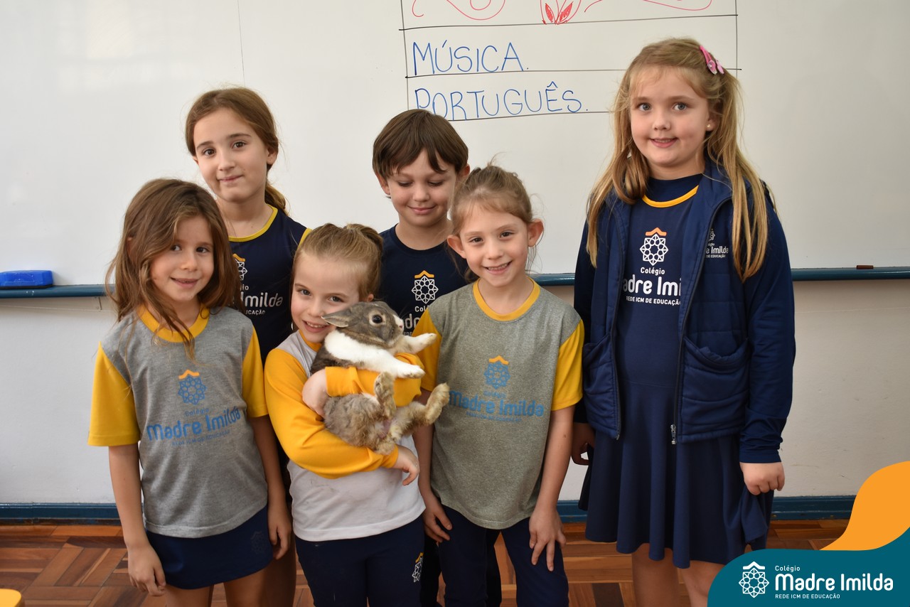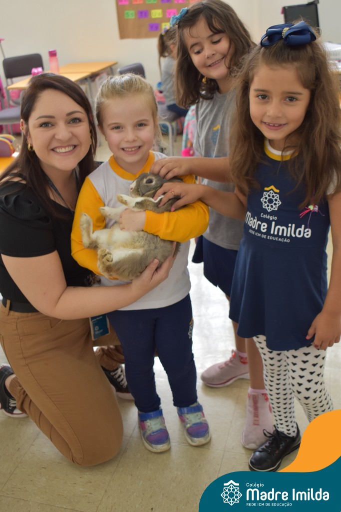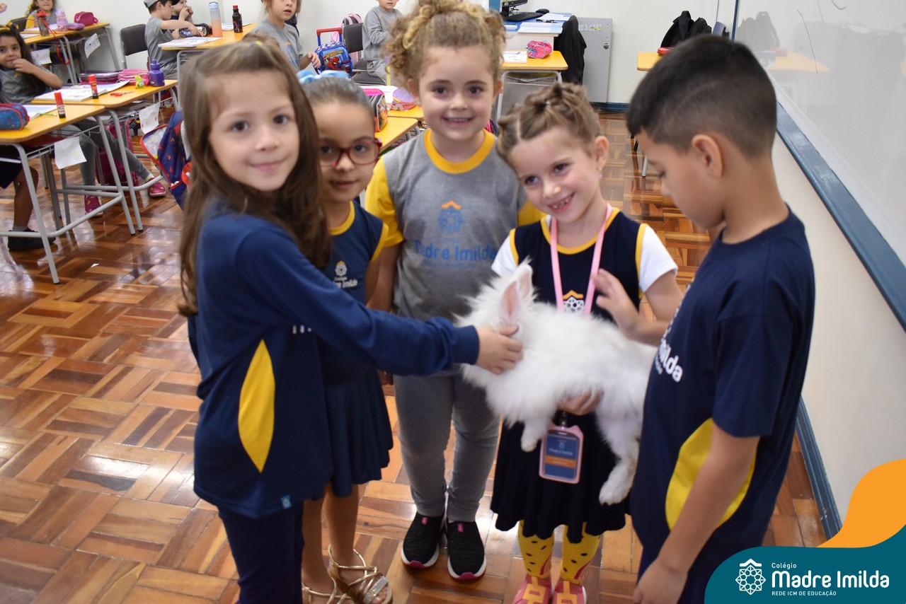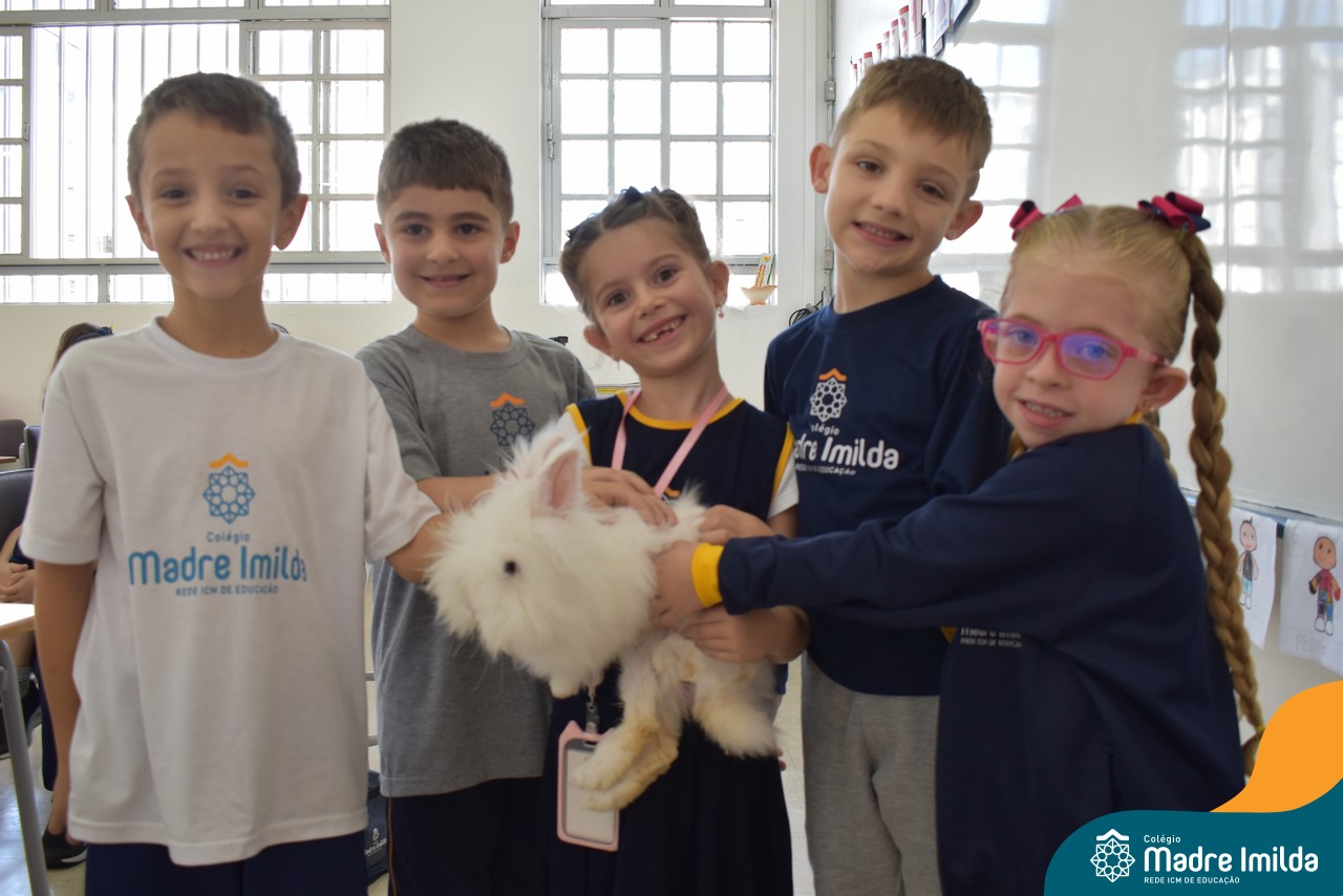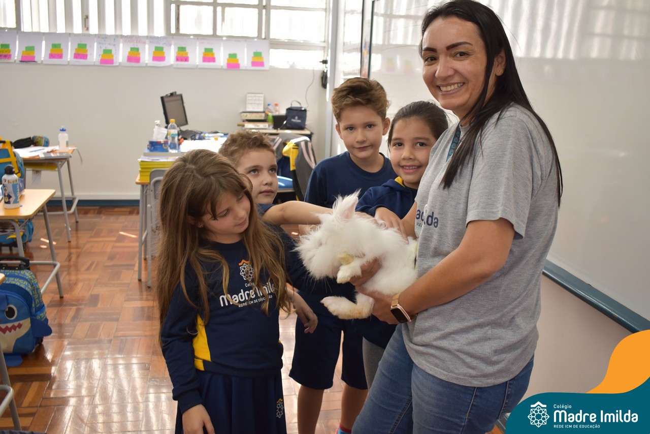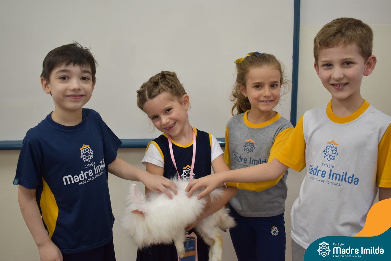 No clima festivo da Páscoa, os estudantes do 1º ano do Colégio Madre Imilda foram surpreendidos com uma visita muito especial: os adoráveis coelhos de estimação Buny e Toco! Esta experiência única foi proporcionada pelas alunas Helena Megiolaro Machado e Mariah Gazzola Dalle Laste.