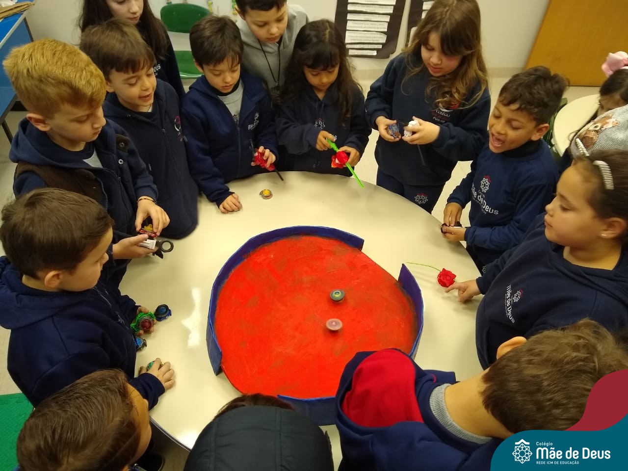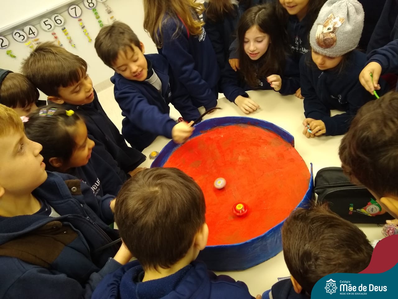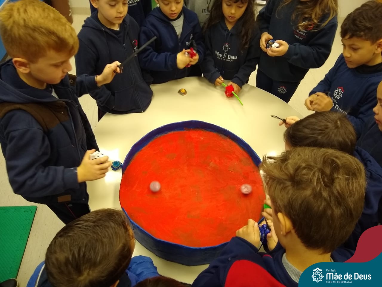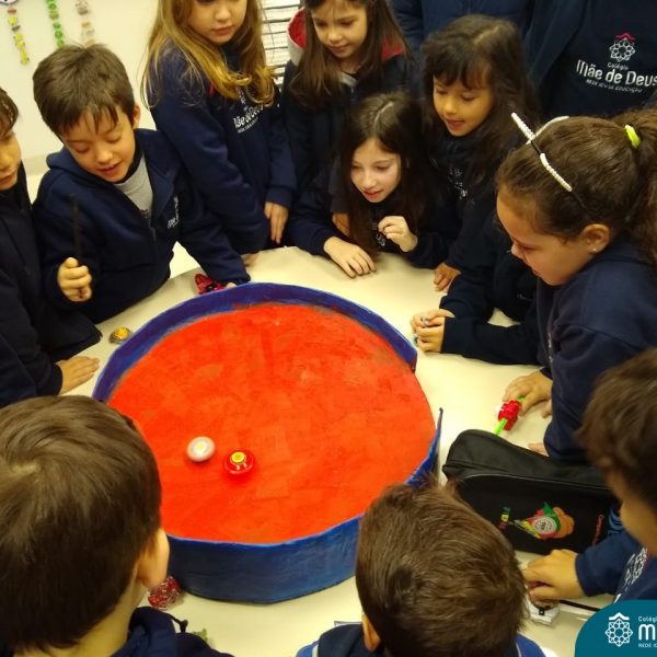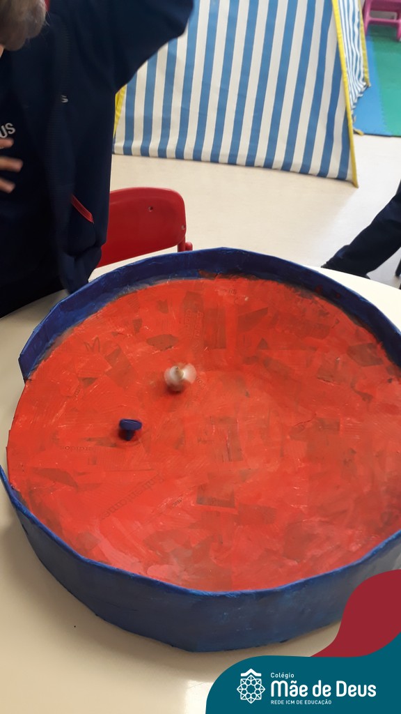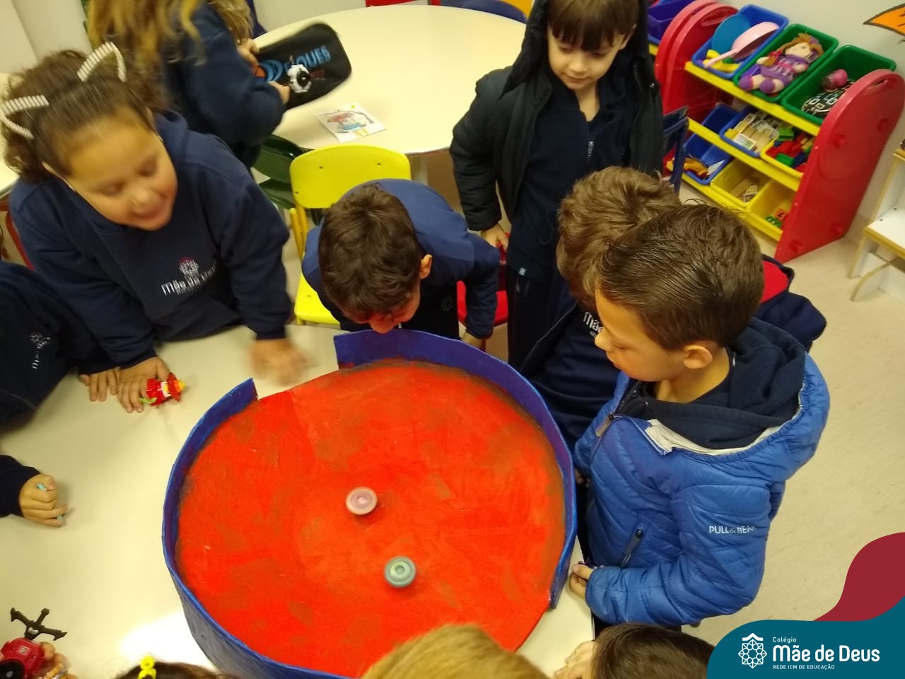 Os grupos 2 e 3 do TuiMD confeccionaram uma ¨Arena de beyblade.¨ Após terminar o brinquedo houve a inauguração. Relembraram sobre o respeito de cada um na hora de batalhar com seus colegas e que a reciclagem e a reutilização de objetos são muito importantes, por isso, é essencial um consumo consciente.