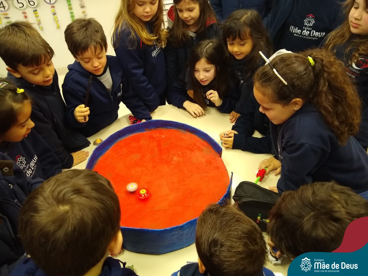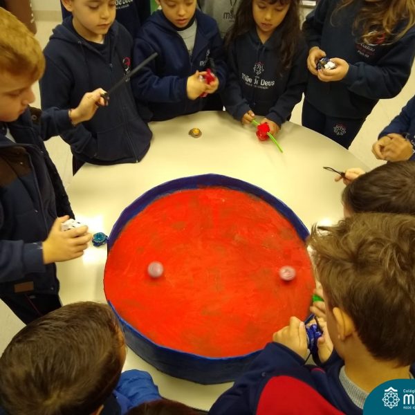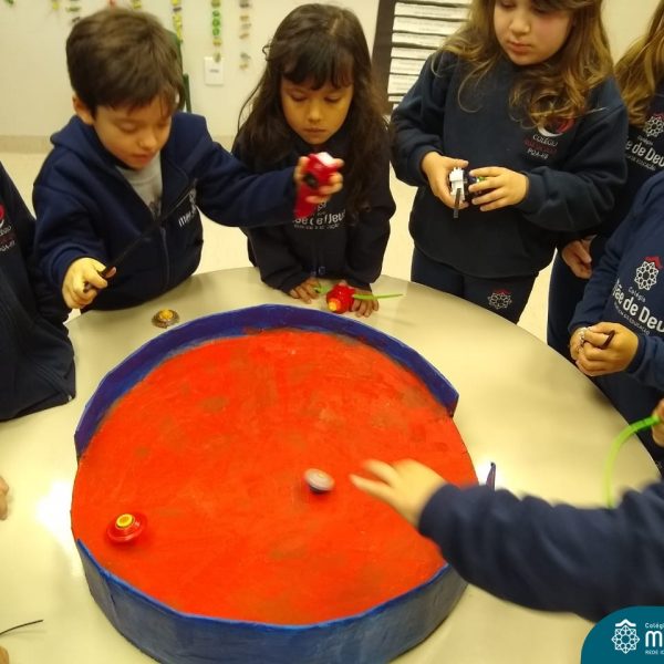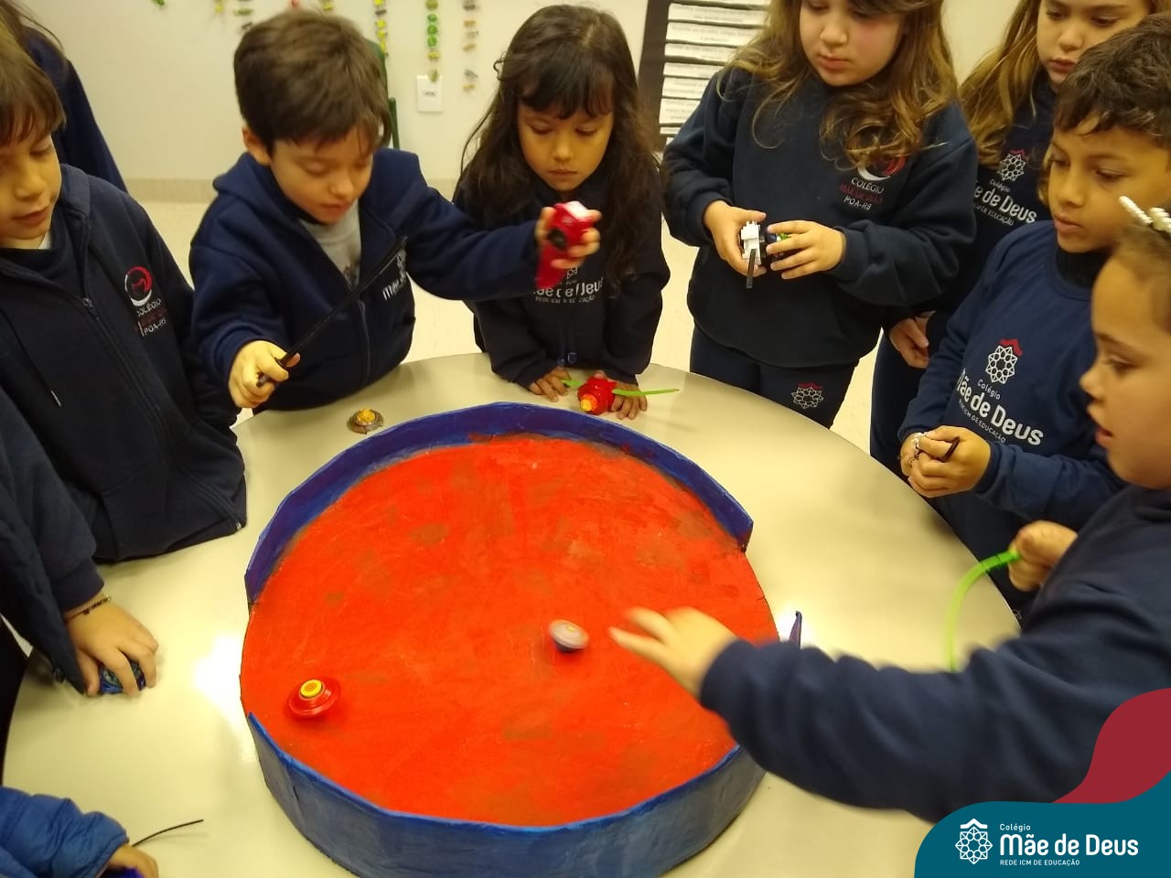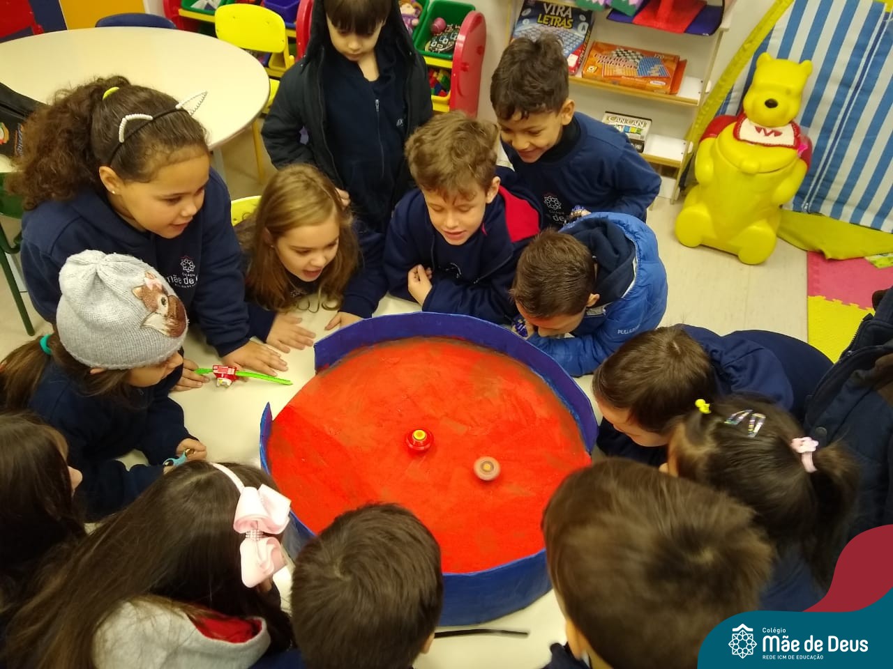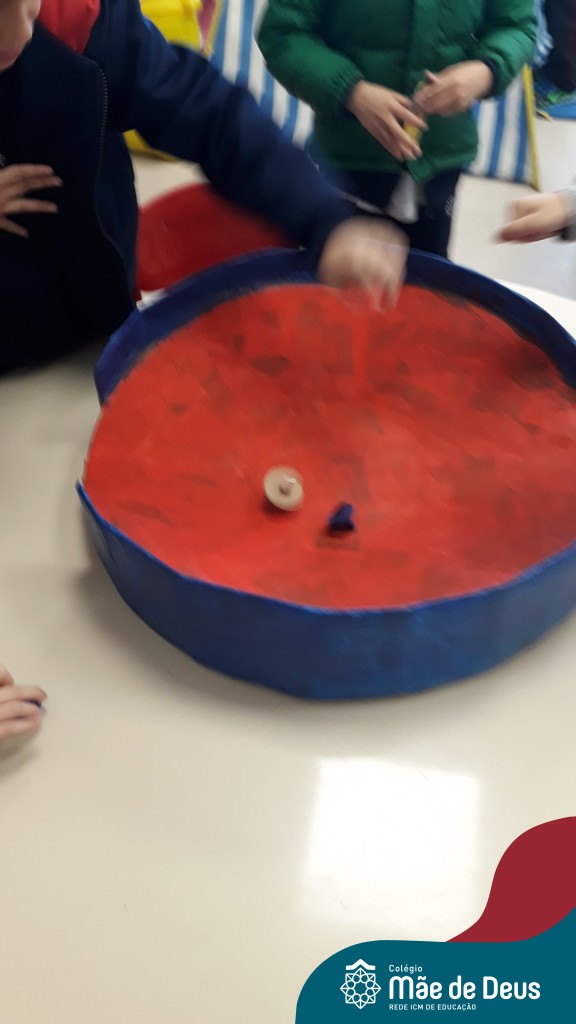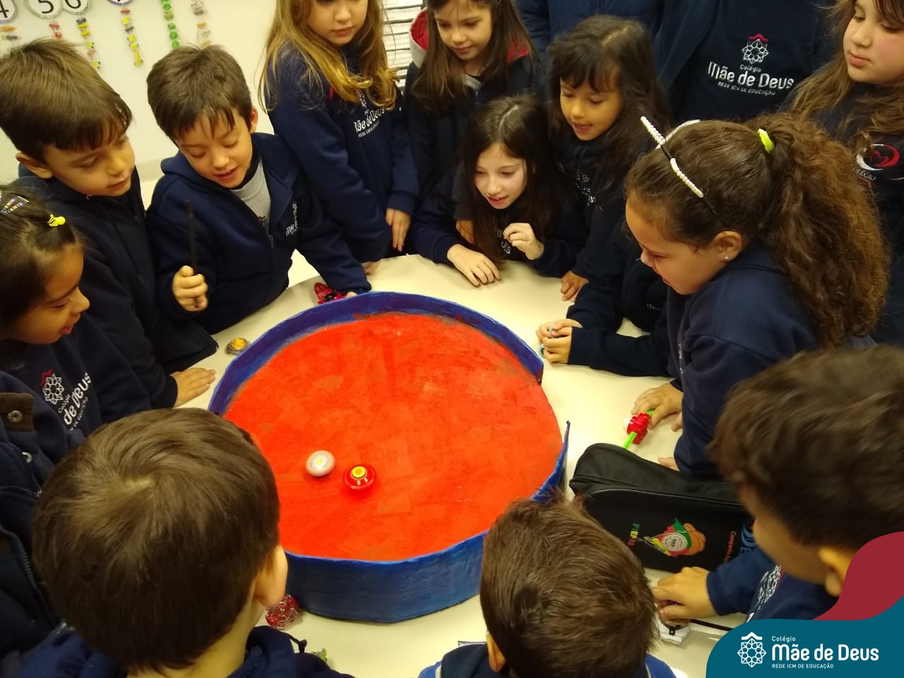 Os grupos 2 e 3 do TuiMD confeccionaram uma ¨Arena de beyblade.¨ Após terminar o brinquedo houve a inauguração. Relembraram sobre o respeito de cada um na hora de batalhar com seus colegas e que a reciclagem e a reutilização de objetos são muito importantes, por isso, é essencial um consumo consciente.