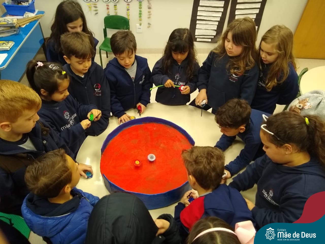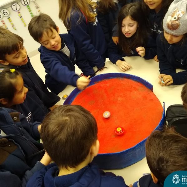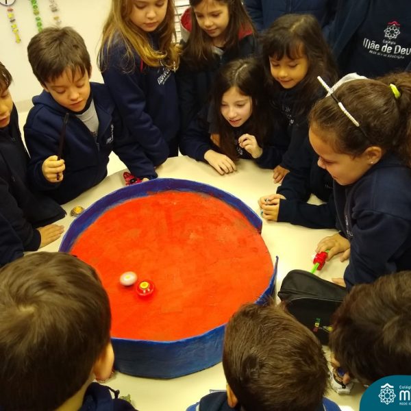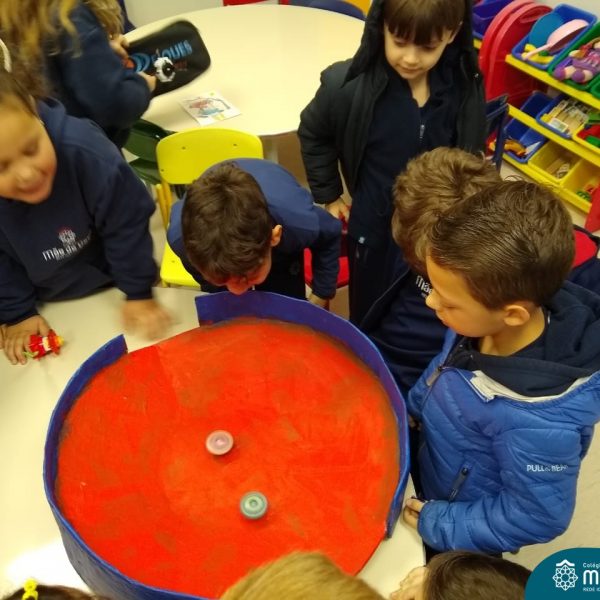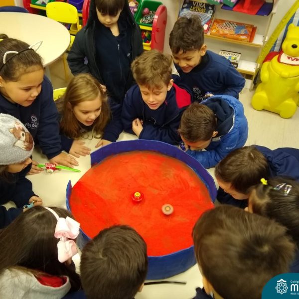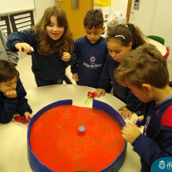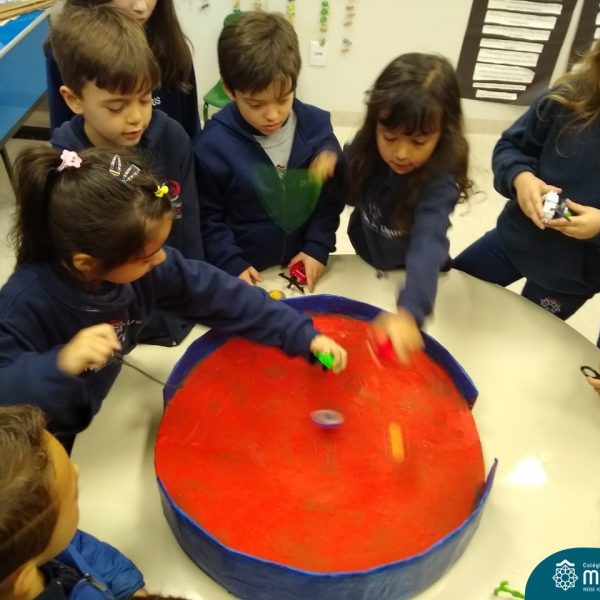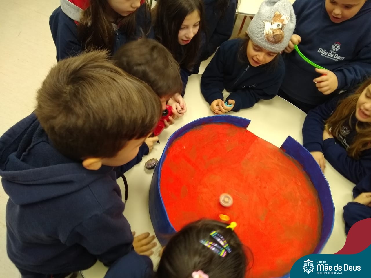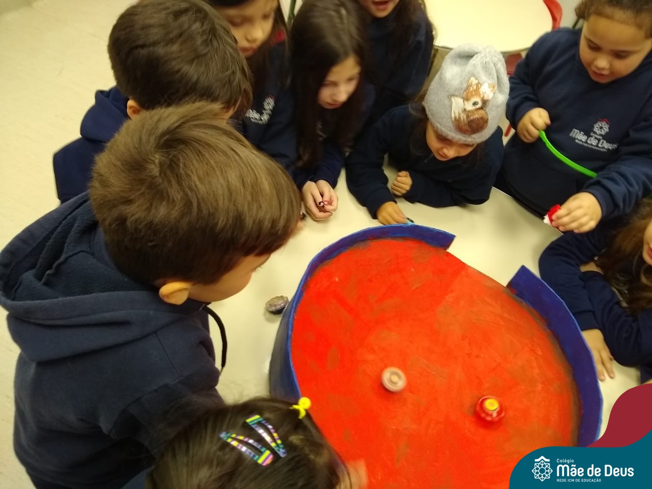 Os grupos 2 e 3 do TuiMD confeccionaram uma ¨Arena de beyblade.¨ Após terminar o brinquedo houve a inauguração. Relembraram sobre o respeito de cada um na hora de batalhar com seus colegas e que a reciclagem e a reutilização de objetos são muito importantes, por isso, é essencial um consumo consciente.
