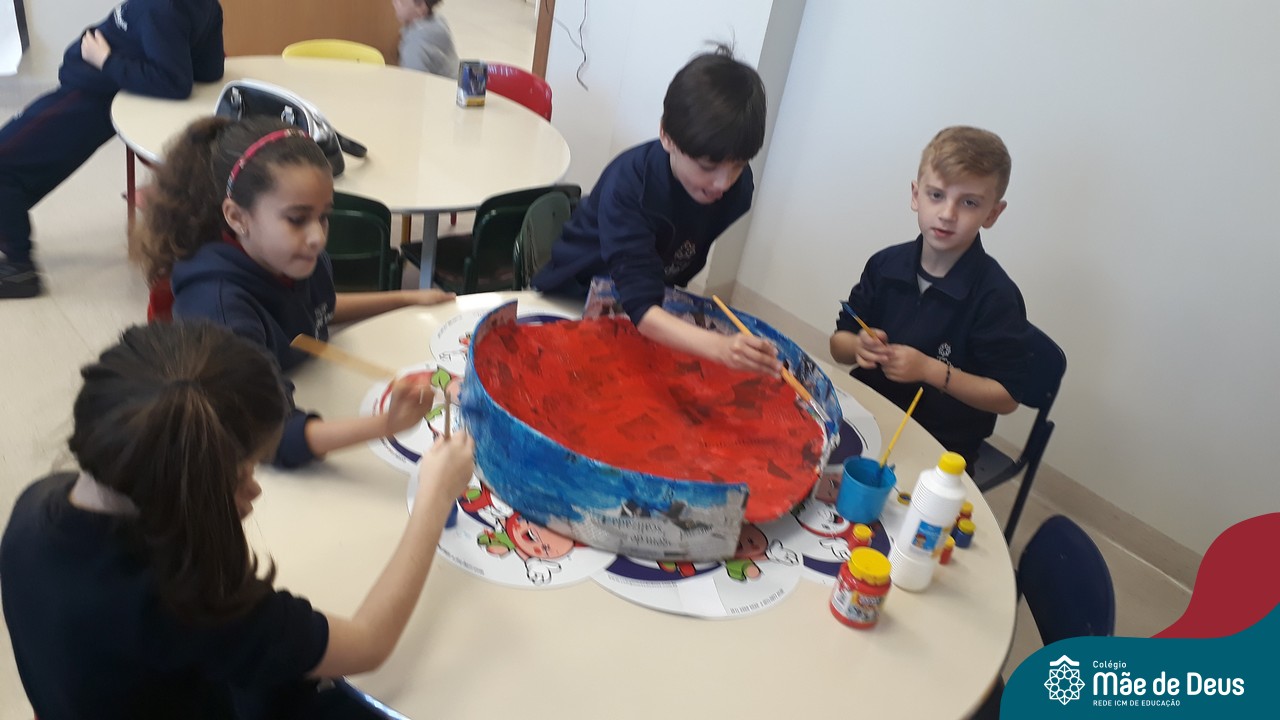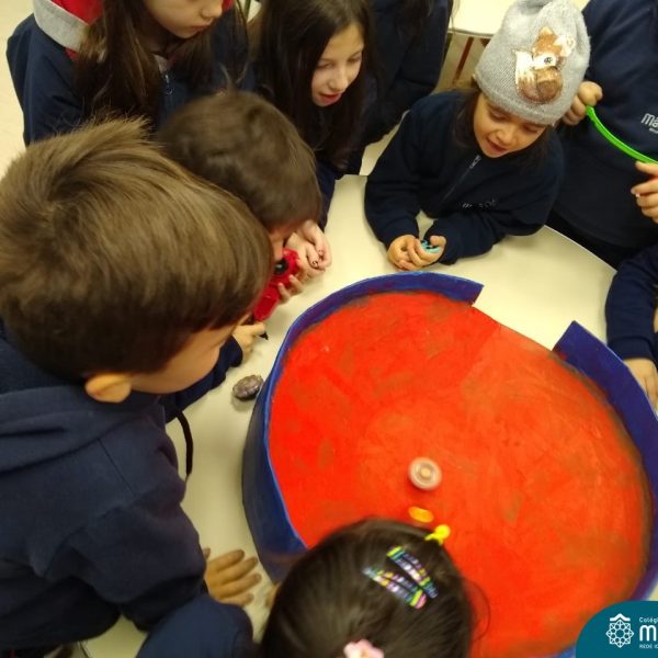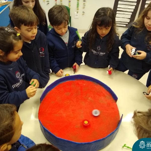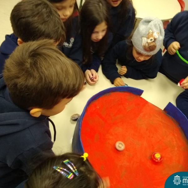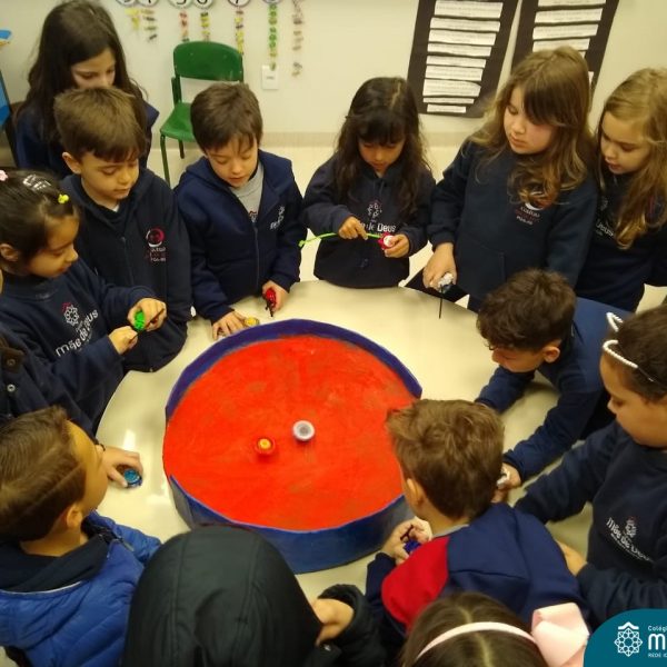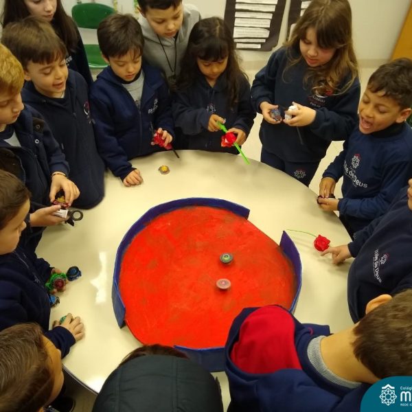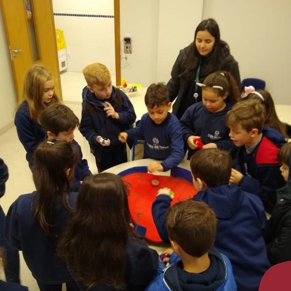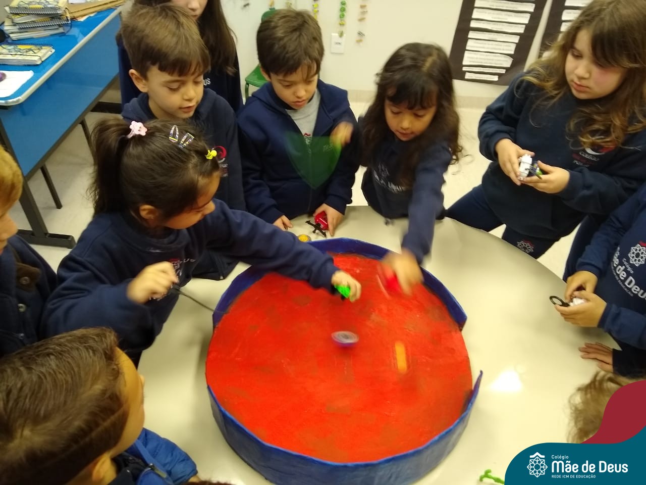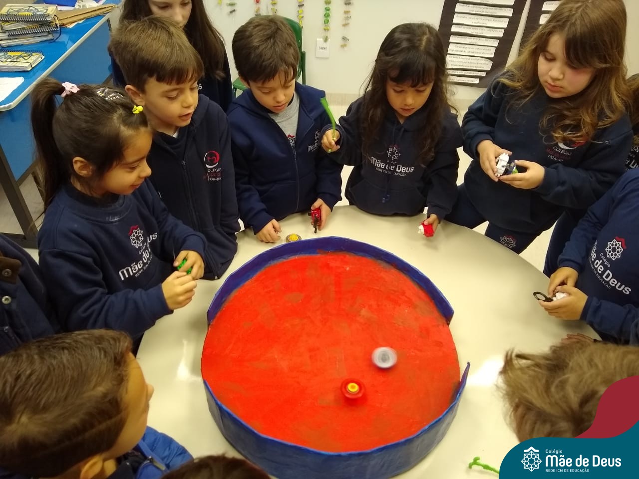 Os grupos 2 e 3 do TuiMD confeccionaram uma ¨Arena de beyblade.¨ Após terminar o brinquedo houve a inauguração. Relembraram sobre o respeito de cada um na hora de batalhar com seus colegas e que a reciclagem e a reutilização de objetos são muito importantes, por isso, é essencial um consumo consciente.