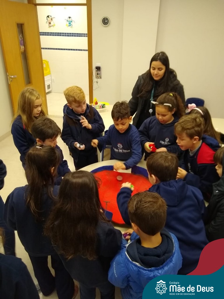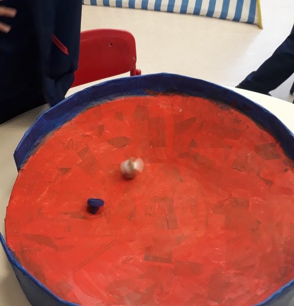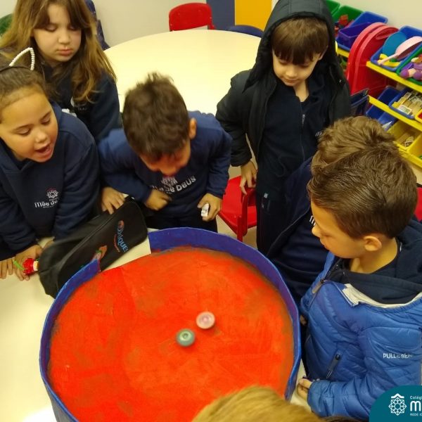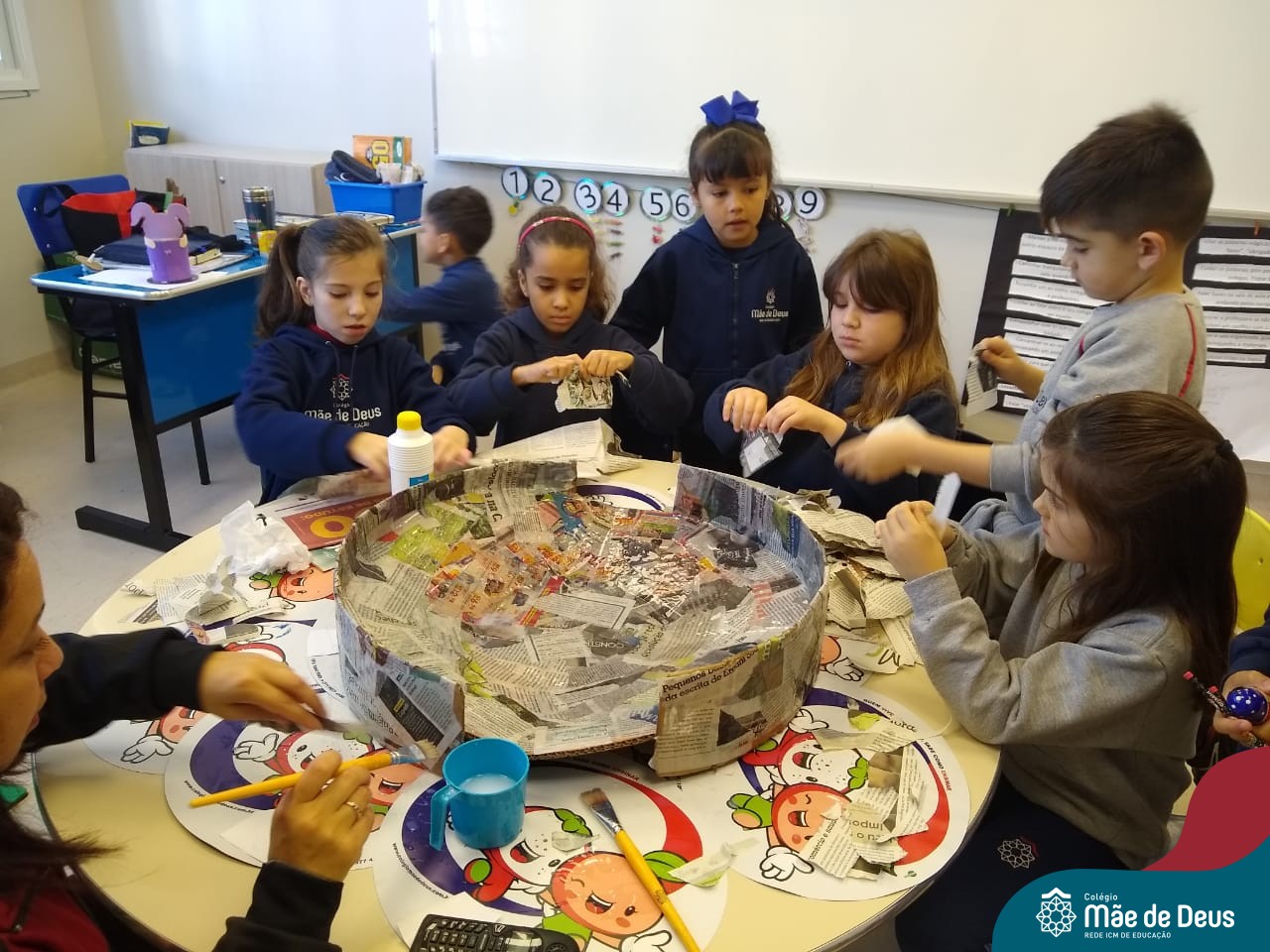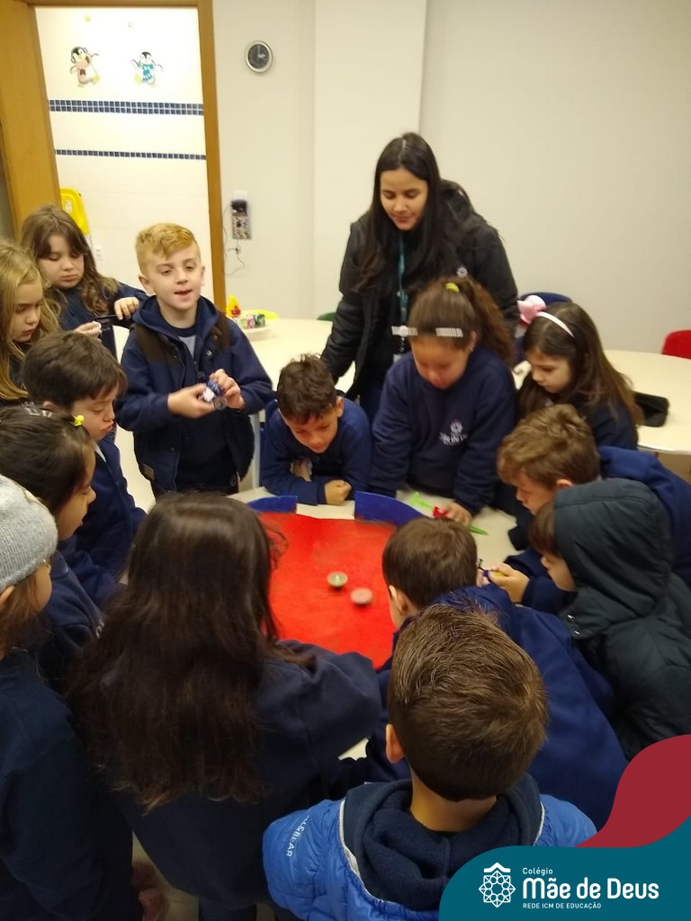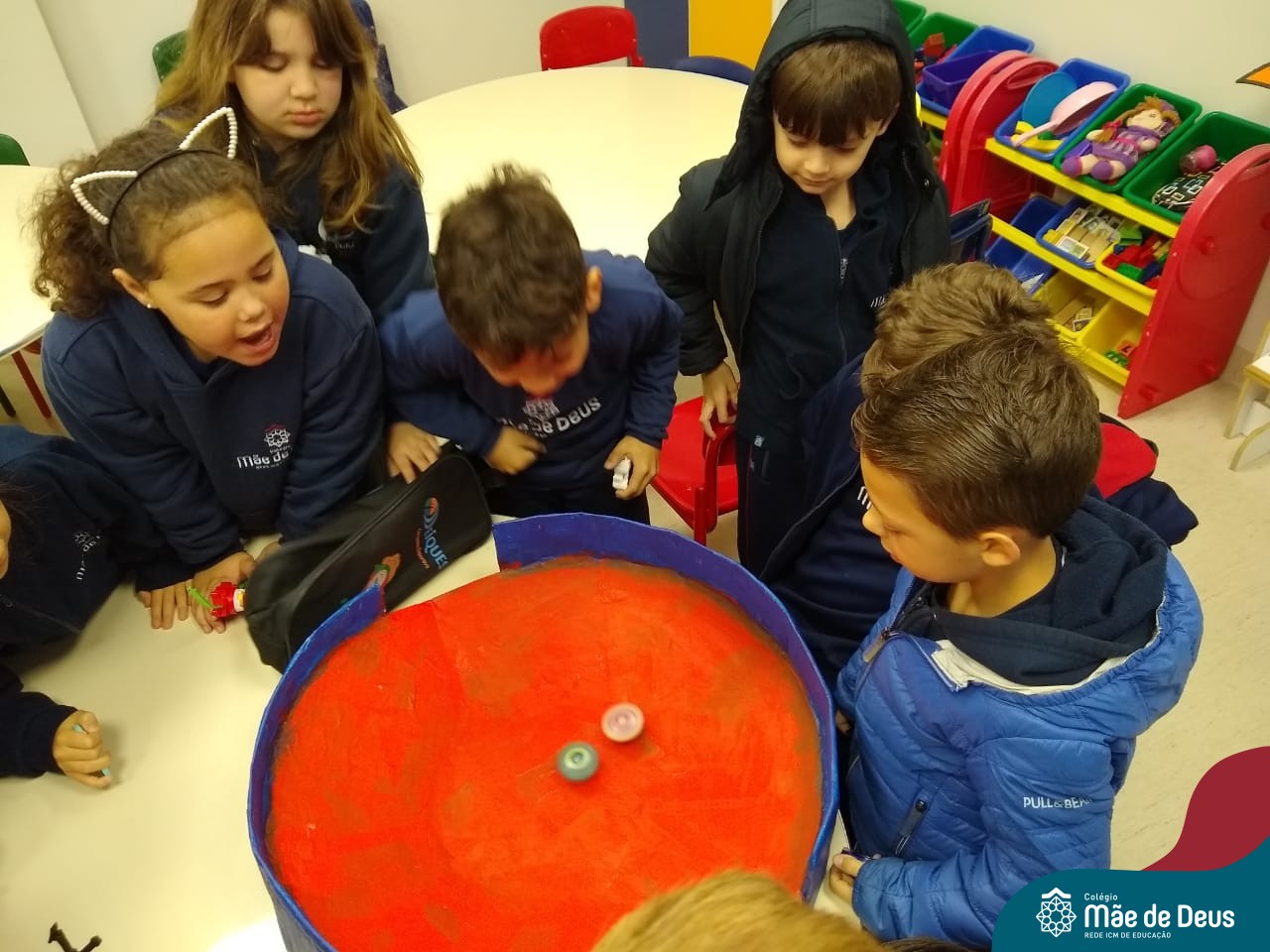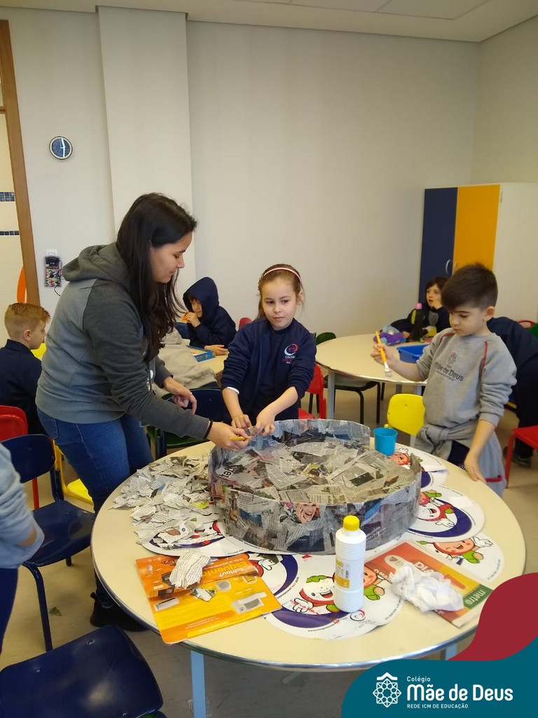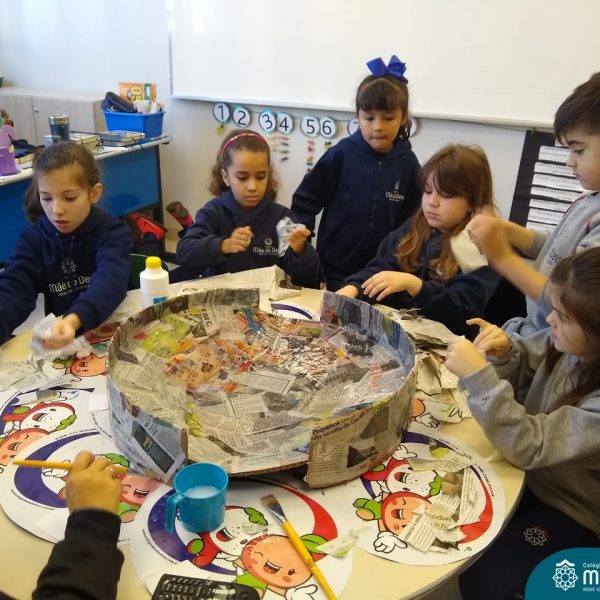 Os grupos 2 e 3 do TuiMD confeccionaram uma ¨Arena de beyblade.¨ Após terminar o brinquedo houve a inauguração. Relembraram sobre o respeito de cada um na hora de batalhar com seus colegas e que a reciclagem e a reutilização de objetos são muito importantes, por isso, é essencial um consumo consciente.