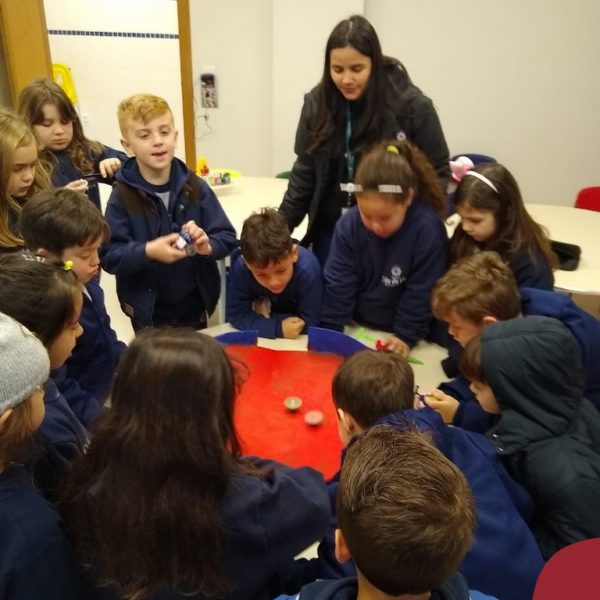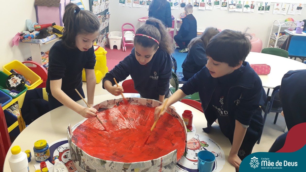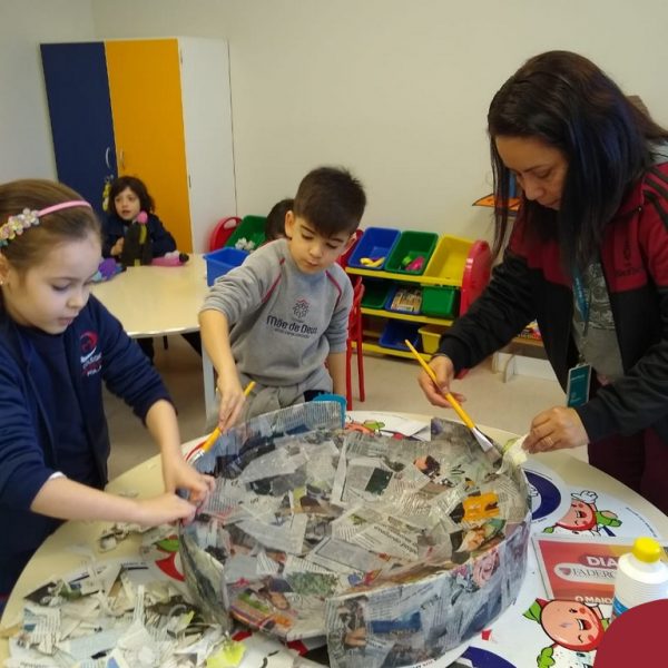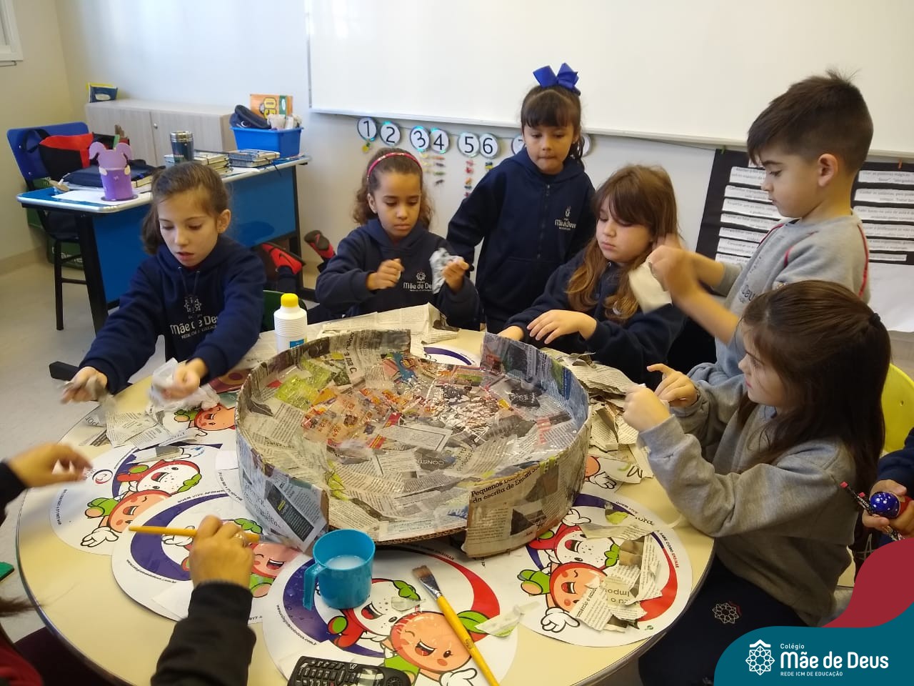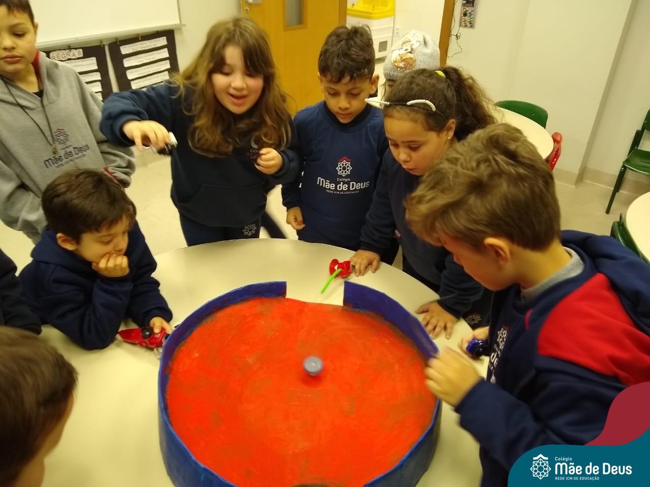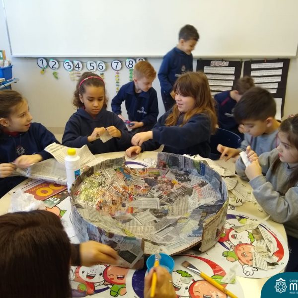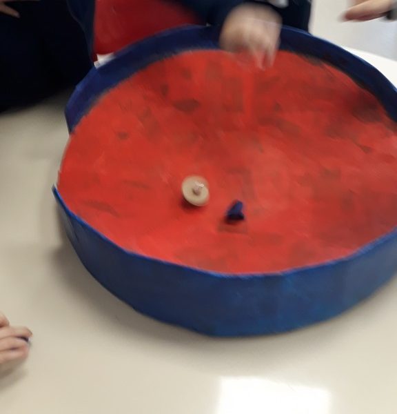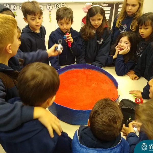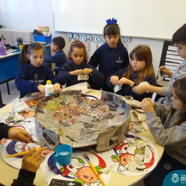 Os grupos 2 e 3 do TuiMD confeccionaram uma ¨Arena de beyblade.¨ Após terminar o brinquedo houve a inauguração. Relembraram sobre o respeito de cada um na hora de batalhar com seus colegas e que a reciclagem e a reutilização de objetos são muito importantes, por isso, é essencial um consumo consciente.
