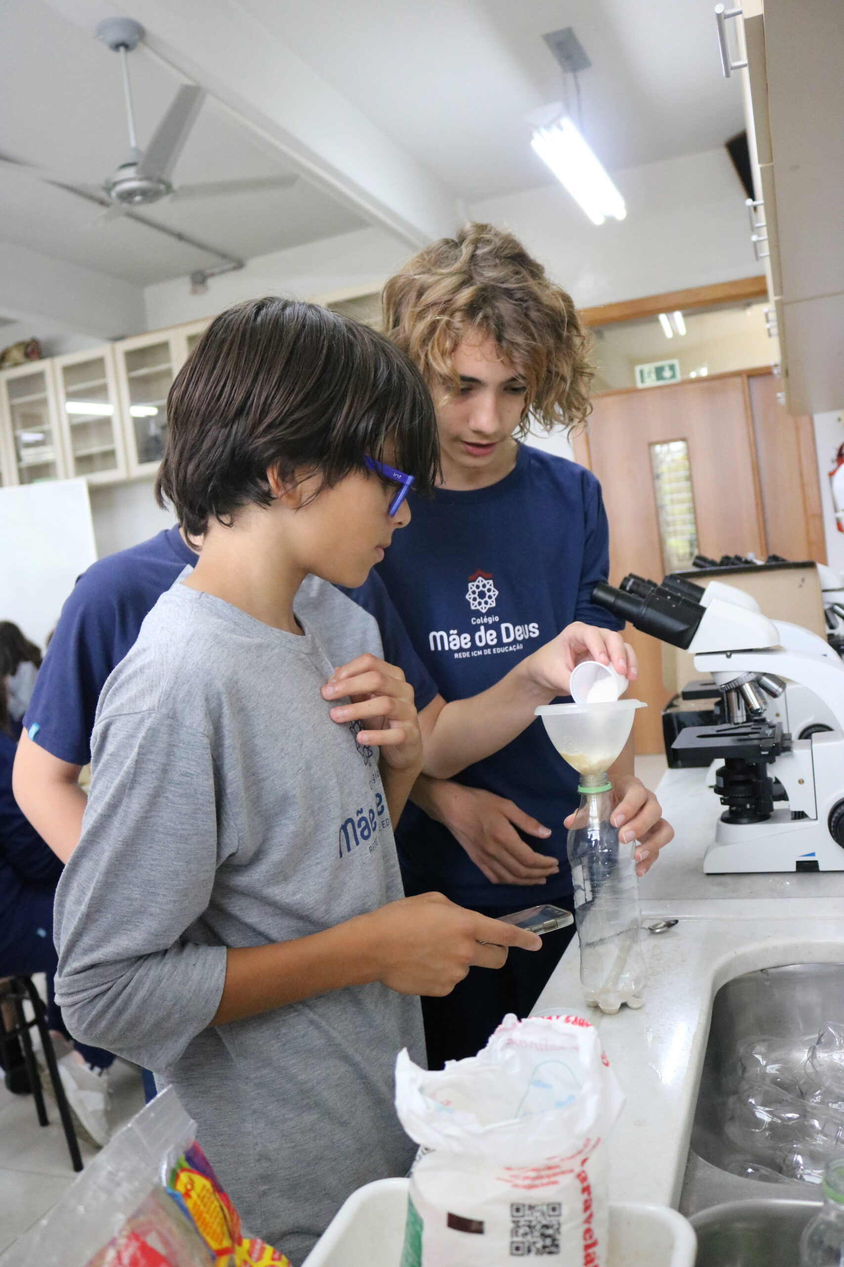 Os alunos do 7º Ano participaram de uma aula prática, no laboratório, com o objetivo de aplicar os conhecimentos adquiridos sobre bactérias e fungos. Durante essa atividade, eles tiveram a oportunidade de observar o processo de fermentação realizado por fungos e cultivar bactérias presentes no ambiente.