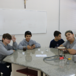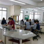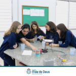 A atividade foi realizada no laboratório de física e química, com o objetivo de aplicar de forma prática os conceitos construídos em sala de aula.