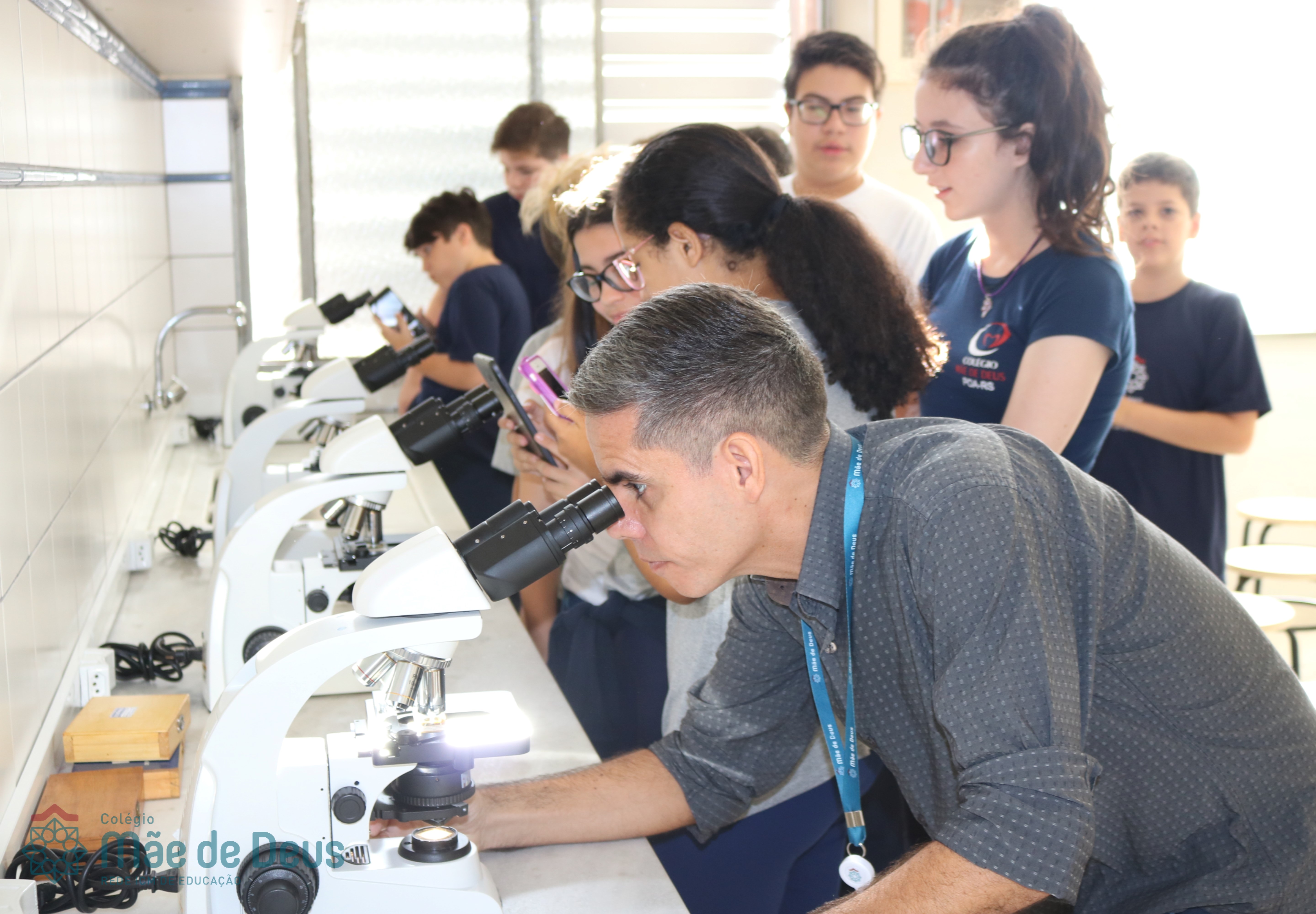 Para inaugurar o uso dos aparelhos, os estudantes do 7º ano, observaram células animais (mucosa bucal e pele) e vegetais (raiz de cebola) e estruturas adaptativas (aparelho bucal do mosquito) de algumas espécies em diferentes aumentos (40x, 100x e 400x), nas aulas de Ciências, sob a orientação do professor Paulo Prates. Esta proposta metodológica prática, tem por objetivo reforçar o conteúdo da teoria e garantir que o estudante possa aprender de diferentes formas.