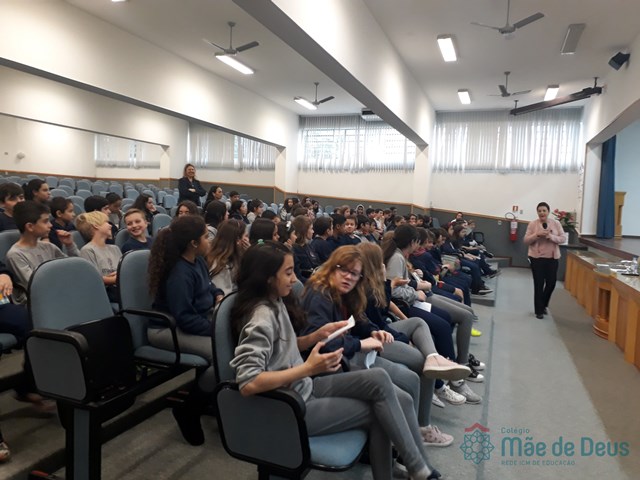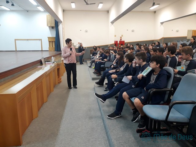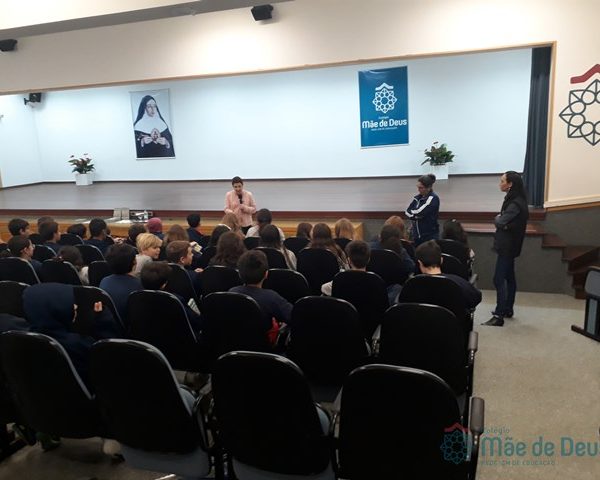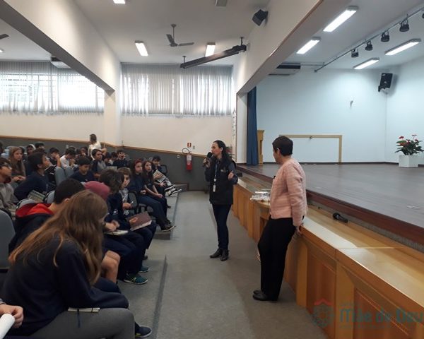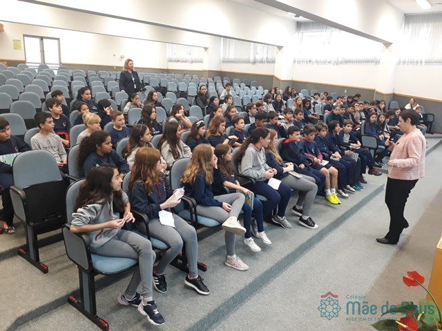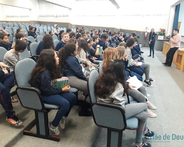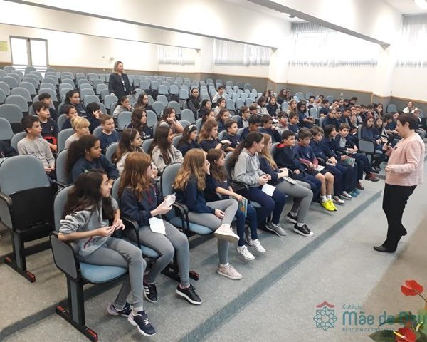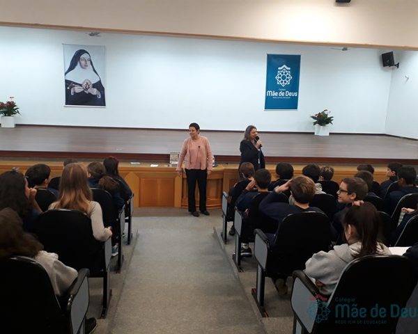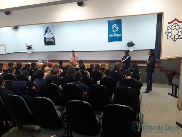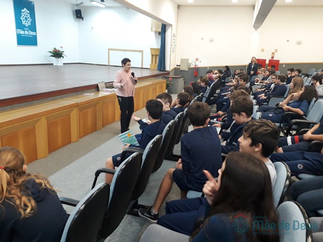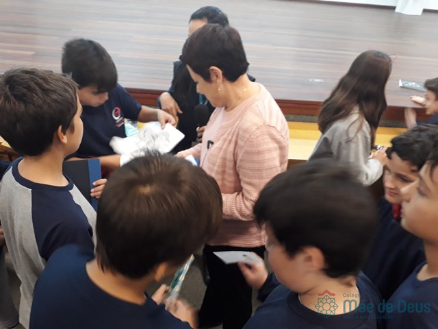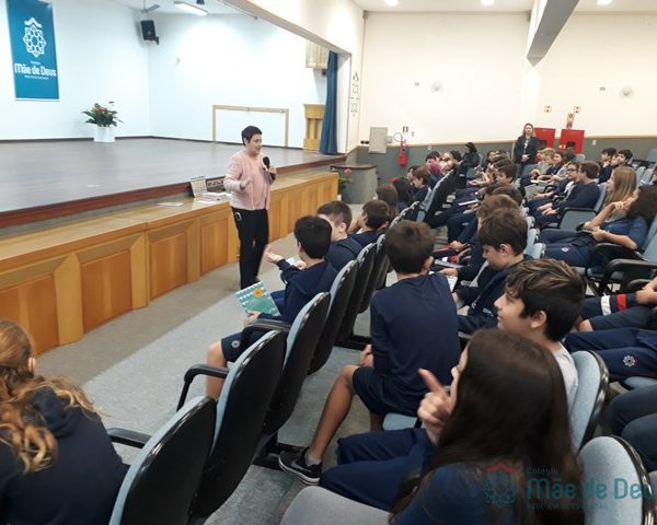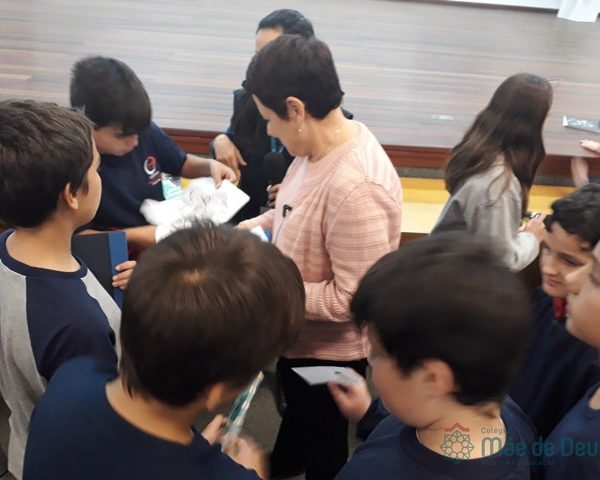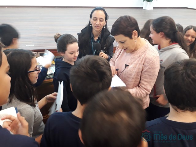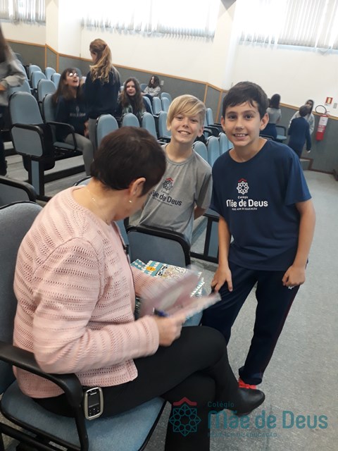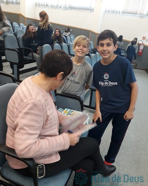 Como parte da programação da Feira Literária, as turmas do 6º ano receberam a visita da escritora e Vice Reitora da UFRGS Jane Tutikian. Os alunos tiveram a oportunidade de conversar com a autora do livro “Fica ficando” (leitura realizada no primeiro trimestre), estabelecendo trocas significativas entre o leitor e a escritora. Foi um bate-papo gostoso e divertido, pois, além de conhecê-la pessoalmente, os estudantes puderam fazer perguntas e participar de uma sessão de autógrafos.