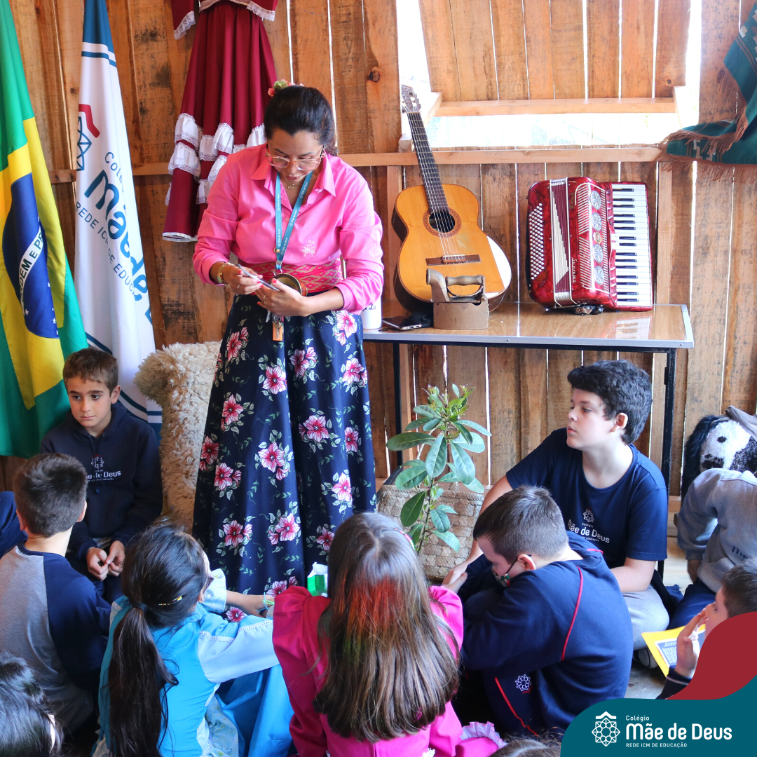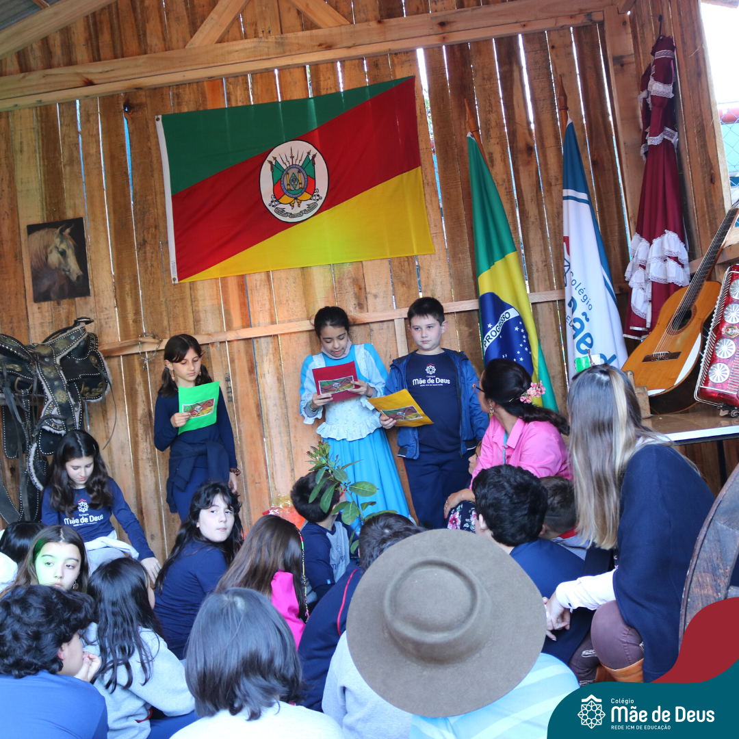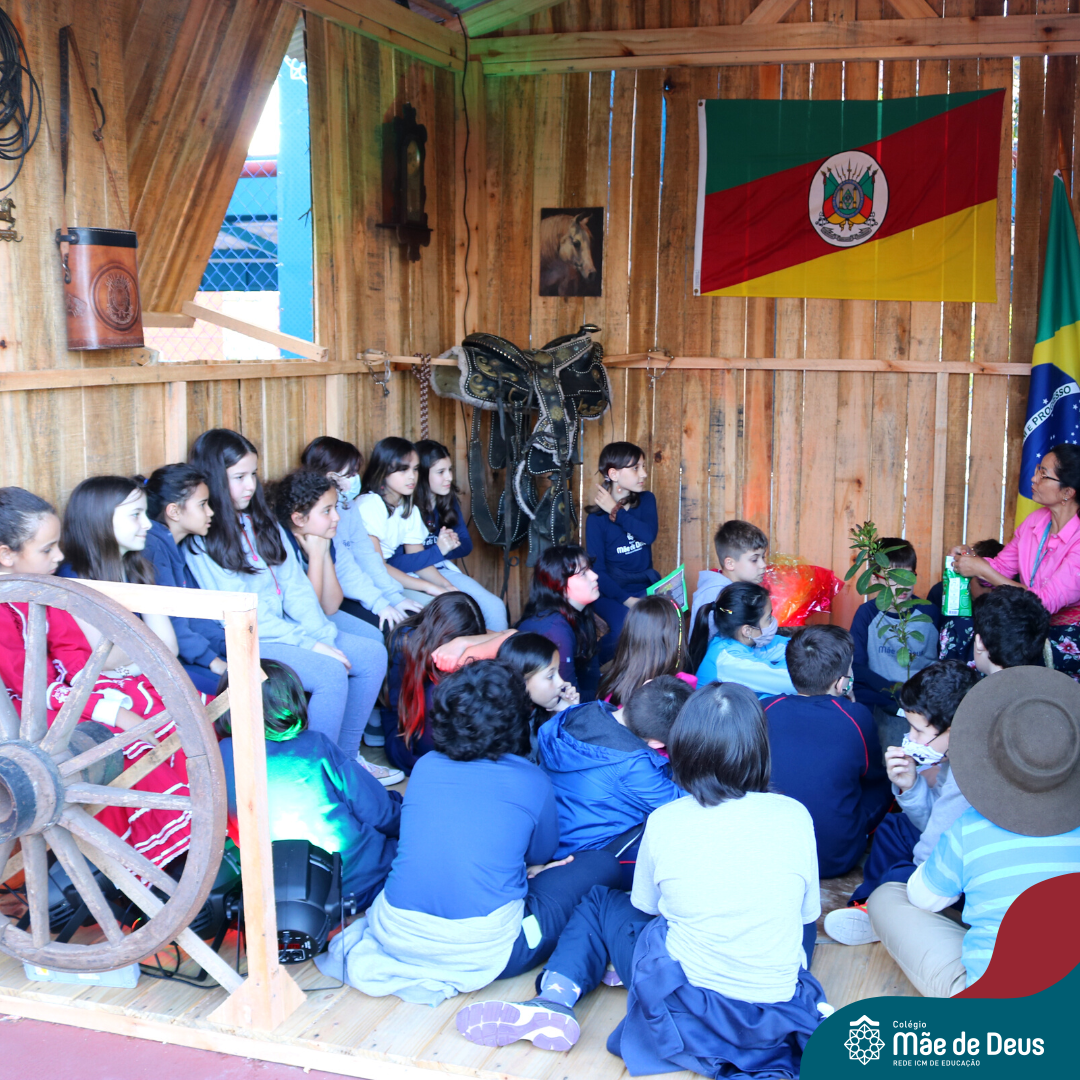 Durante a visita ao Piquete Mãe de Deus, na Semana Farroupilha, a turma 42 conversou sobre a erva-mate (Ilex Paraguariensis) e outras informações do chimarrão, bebida tradicional do povo gaúcho.