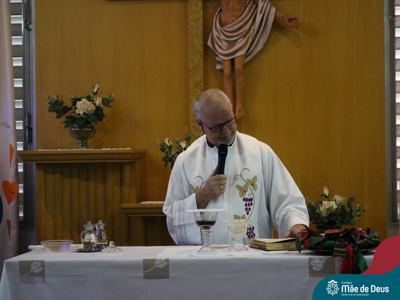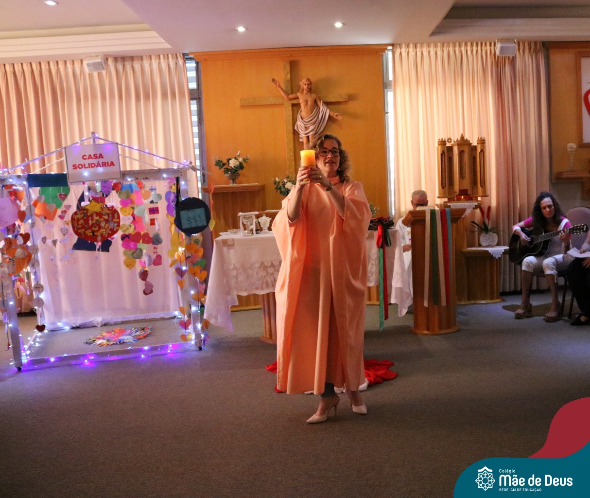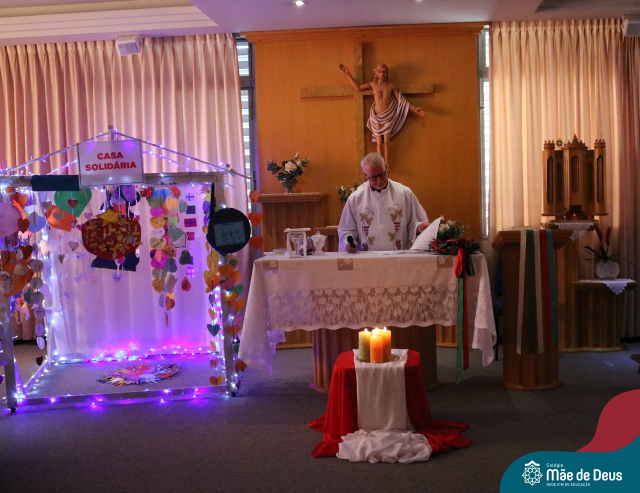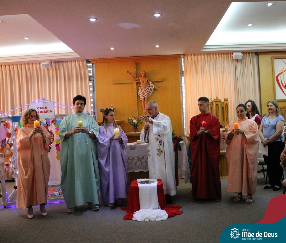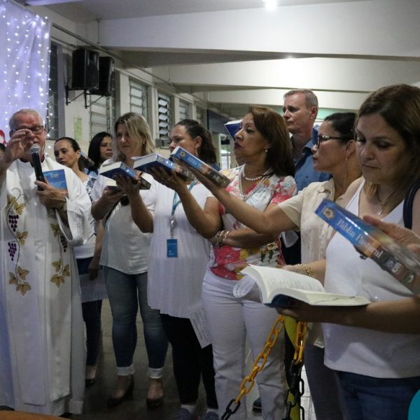 Foi com este espírito de acolhida alegre e generosa ao Deus Meninos que vem até nós, fazendo-se Luz, que no dia 11 de dezembro a comunidade dos educadores do Colégio Mãe de Deus celebrou a preparação para o Natal. Foi um momento de gratidão pelo ano vivido e pelas pessoas que são luz no nosso caminhar. A celebração foi presidida pelo Pe. Edson, que recordou as palavras do Papa Francisco, destacando 03 atitudes: para o passado gratidão, para o futuro esperança e para o presente paixão. A presença de uma família, representando a família de Nazaré,  recordou a fragilidade de Deus encarnado na humanidade e emocionou a todos. Os educadores também ofertaram , como gesto solidário de Natal, produtos de higiene pessoal, que serão doados ao Amparo Santa Cruz- Idosos. Cada um/a recebeu uma bíblia de presente de Natal e, após, confraternizou-se num clima de amizade e alegria.