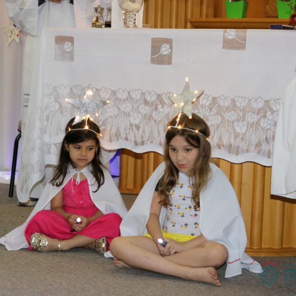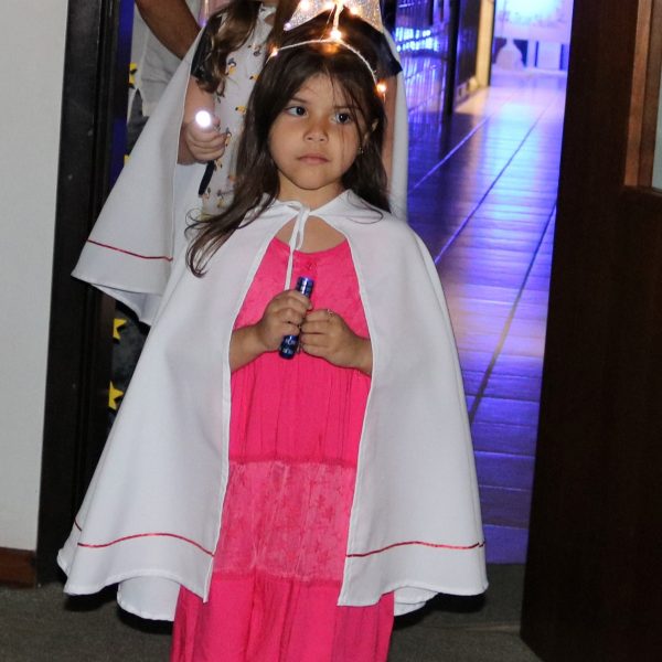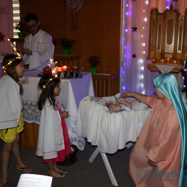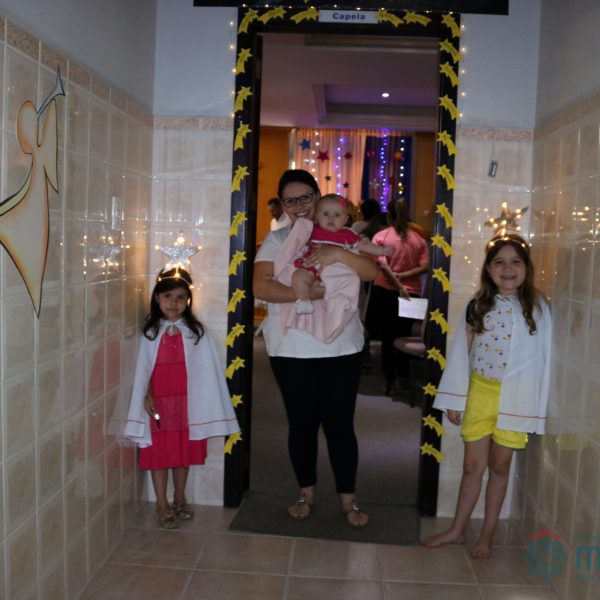 Iniciando a Celebração Eucarística, presidida pelo Pe. Ricardo da Silva, foram acolhidas duas crianças simbolizando a estrela do Natal que levaram o grupo até a capela, onde continuou-se a celebração.