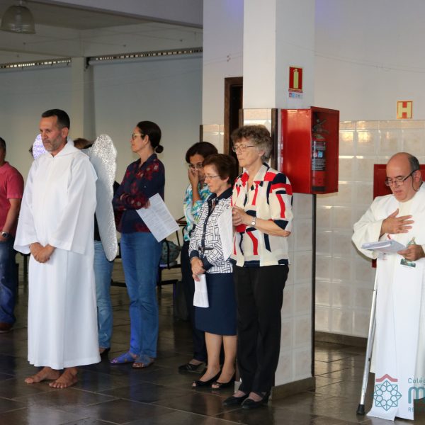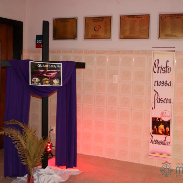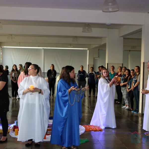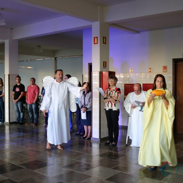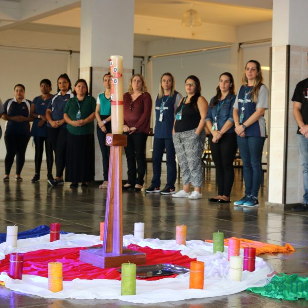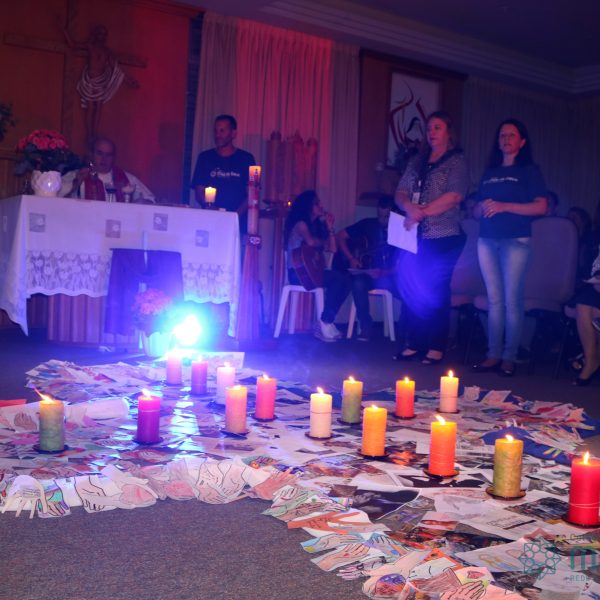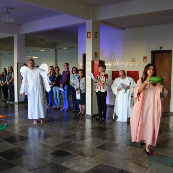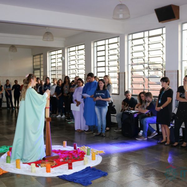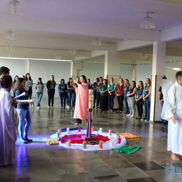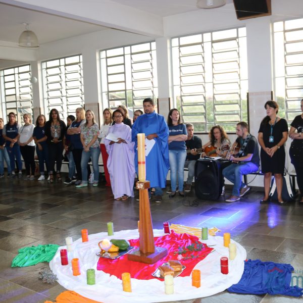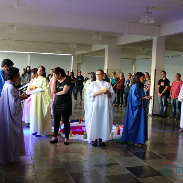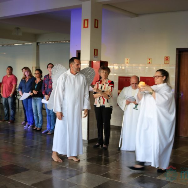 A celebração teve início no saguão 2 do Colégio, com símbolos e narração do Evangelho da Ressurreição, em que Maria Madalena anunciou que Jesus vive eternamente. Um dos momentos significativos, foi a partilha de sinais de ressurreição na vida de cada um de nós, realizada em pequenos grupos. Cada grupo acendeu uma vela no Círio Pascal e, em procissão, seguiu-se para a capela celebrando a Eucaristia.