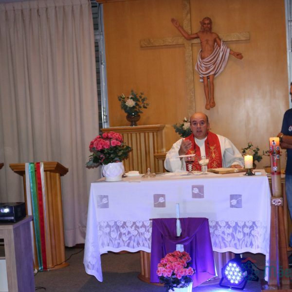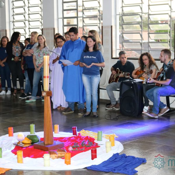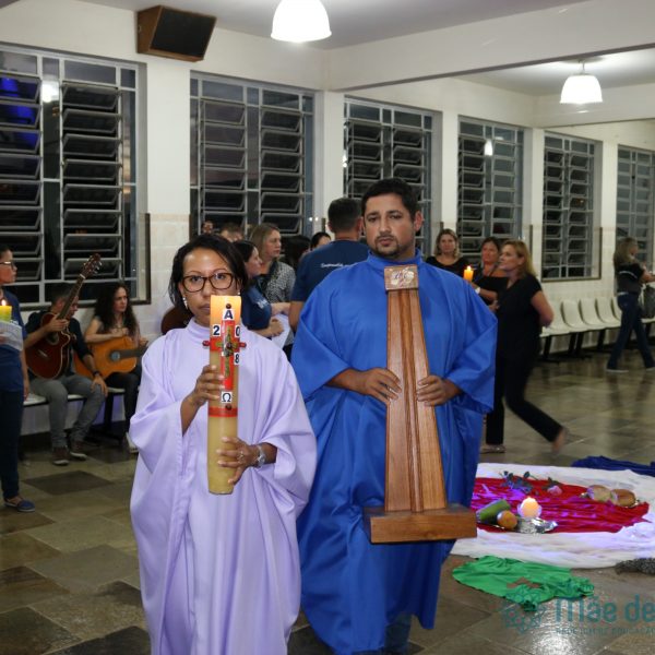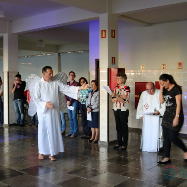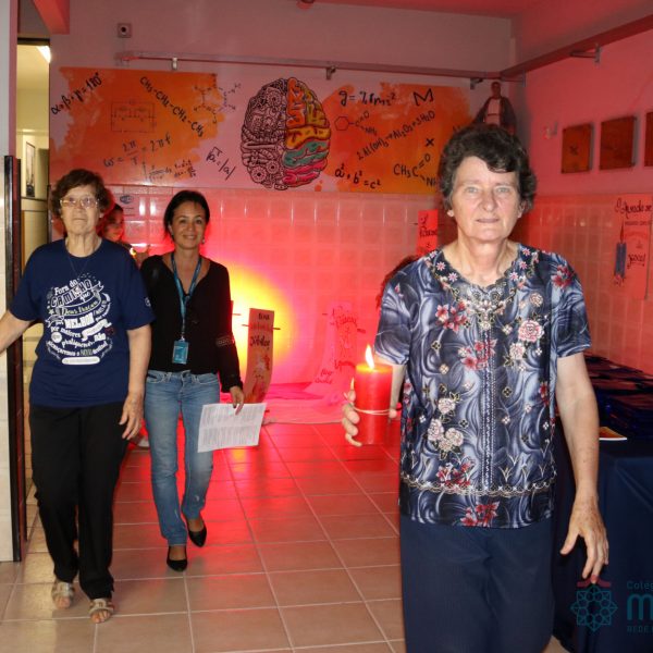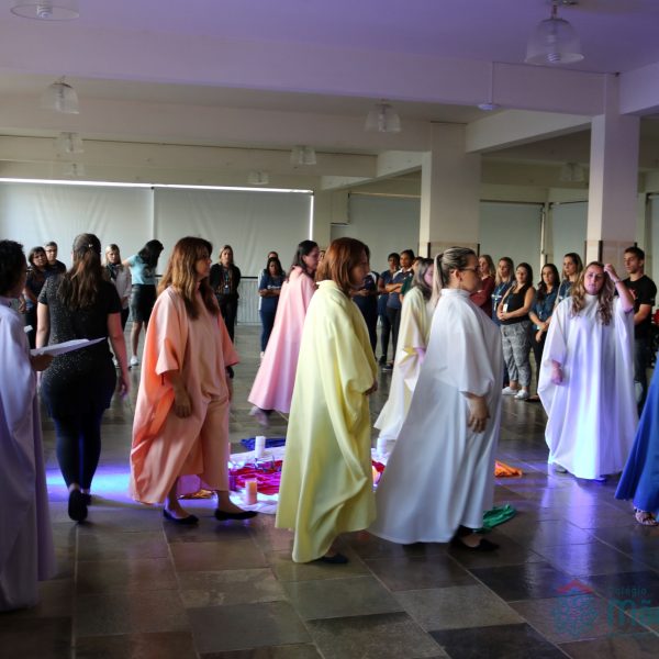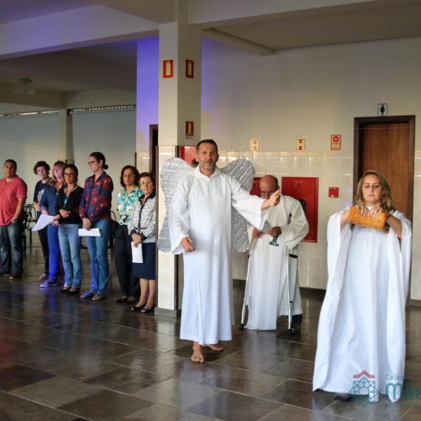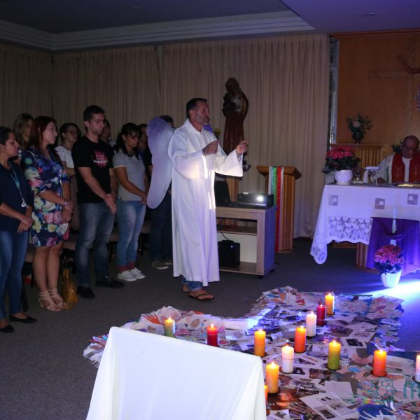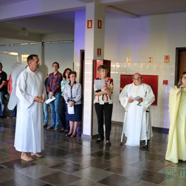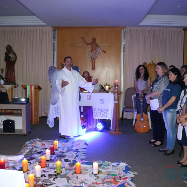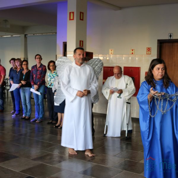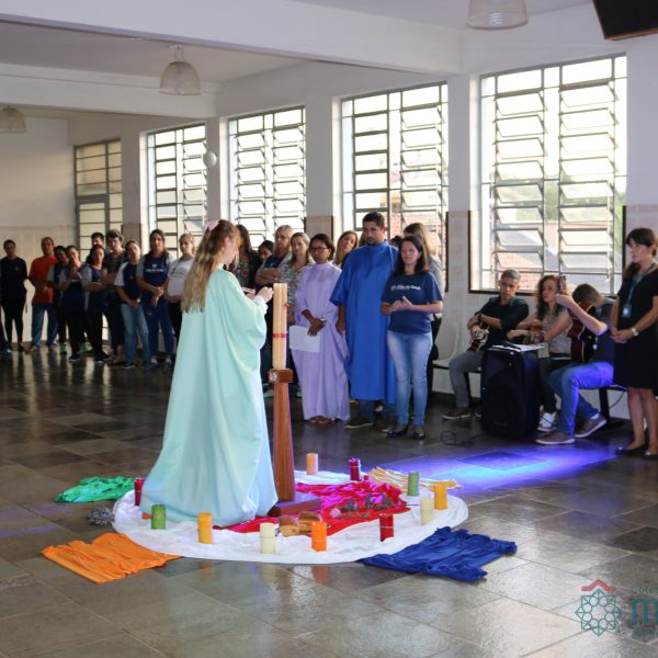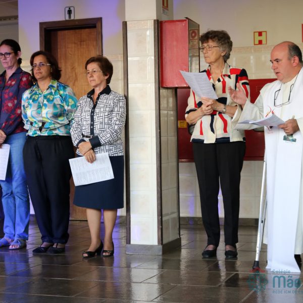 A celebração teve início no saguão 2 do Colégio, com símbolos e narração do Evangelho da Ressurreição, em que Maria Madalena anunciou que Jesus vive eternamente. Um dos momentos significativos, foi a partilha de sinais de ressurreição na vida de cada um de nós, realizada em pequenos grupos. Cada grupo acendeu uma vela no Círio Pascal e, em procissão, seguiu-se para a capela celebrando a Eucaristia.
