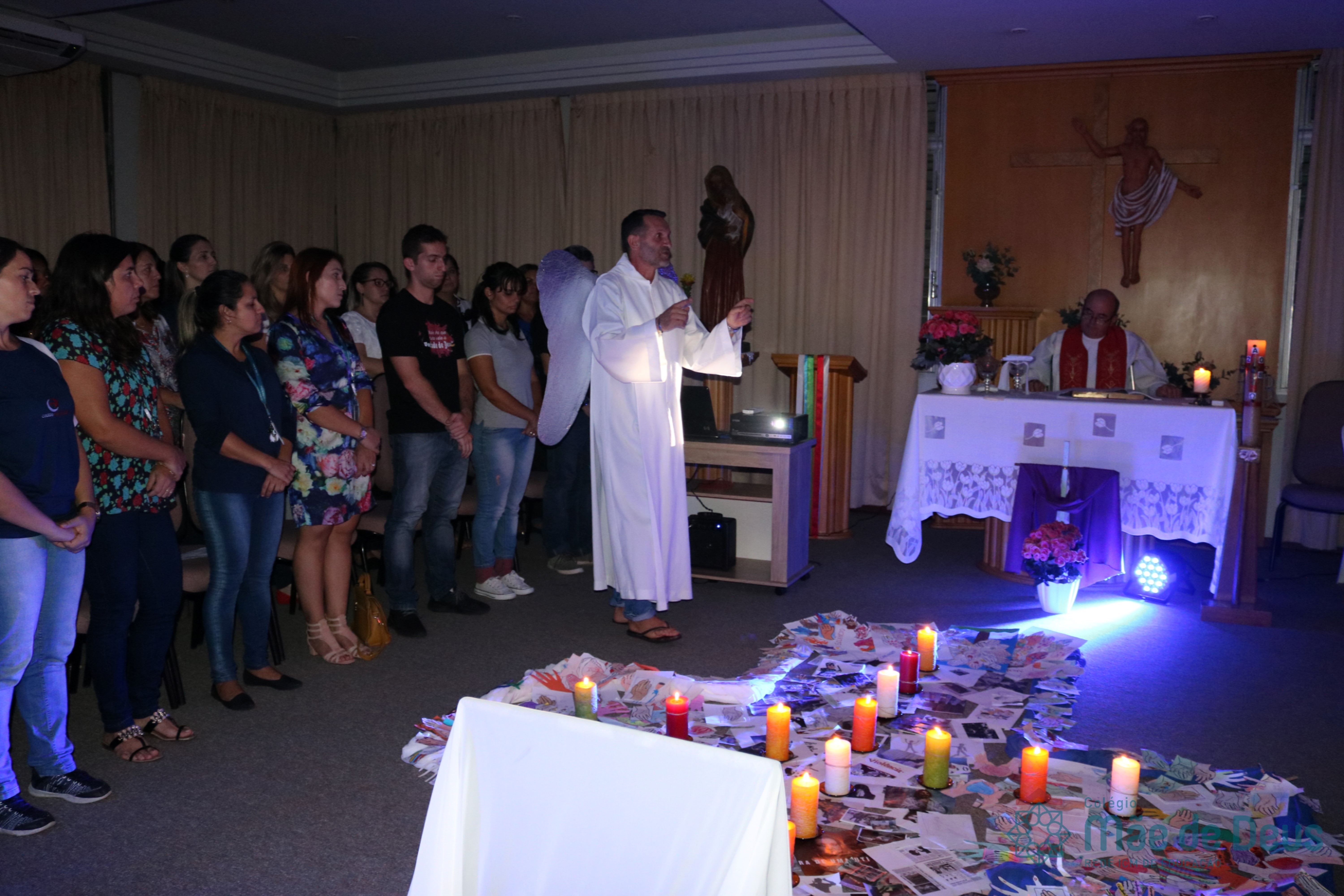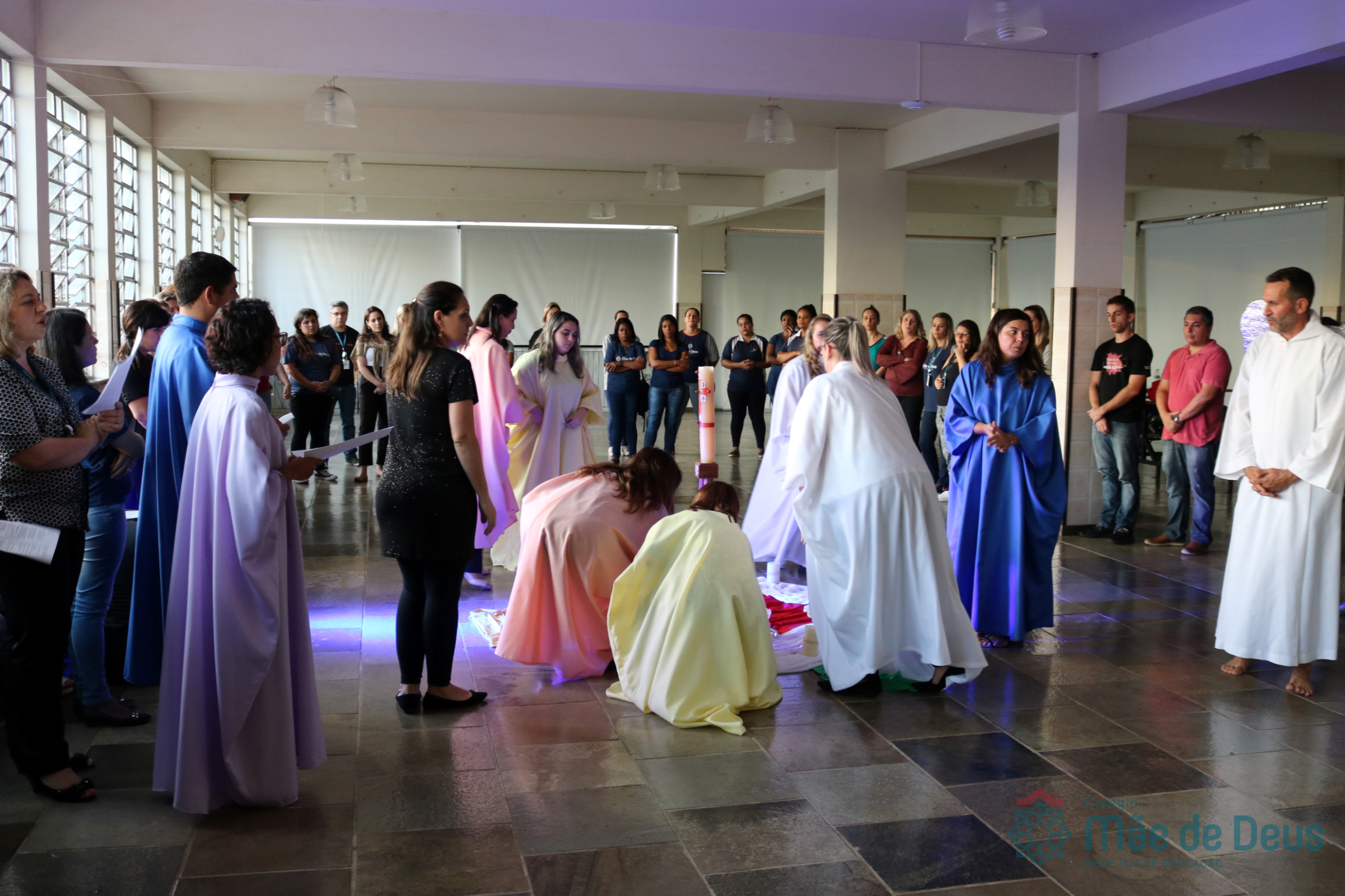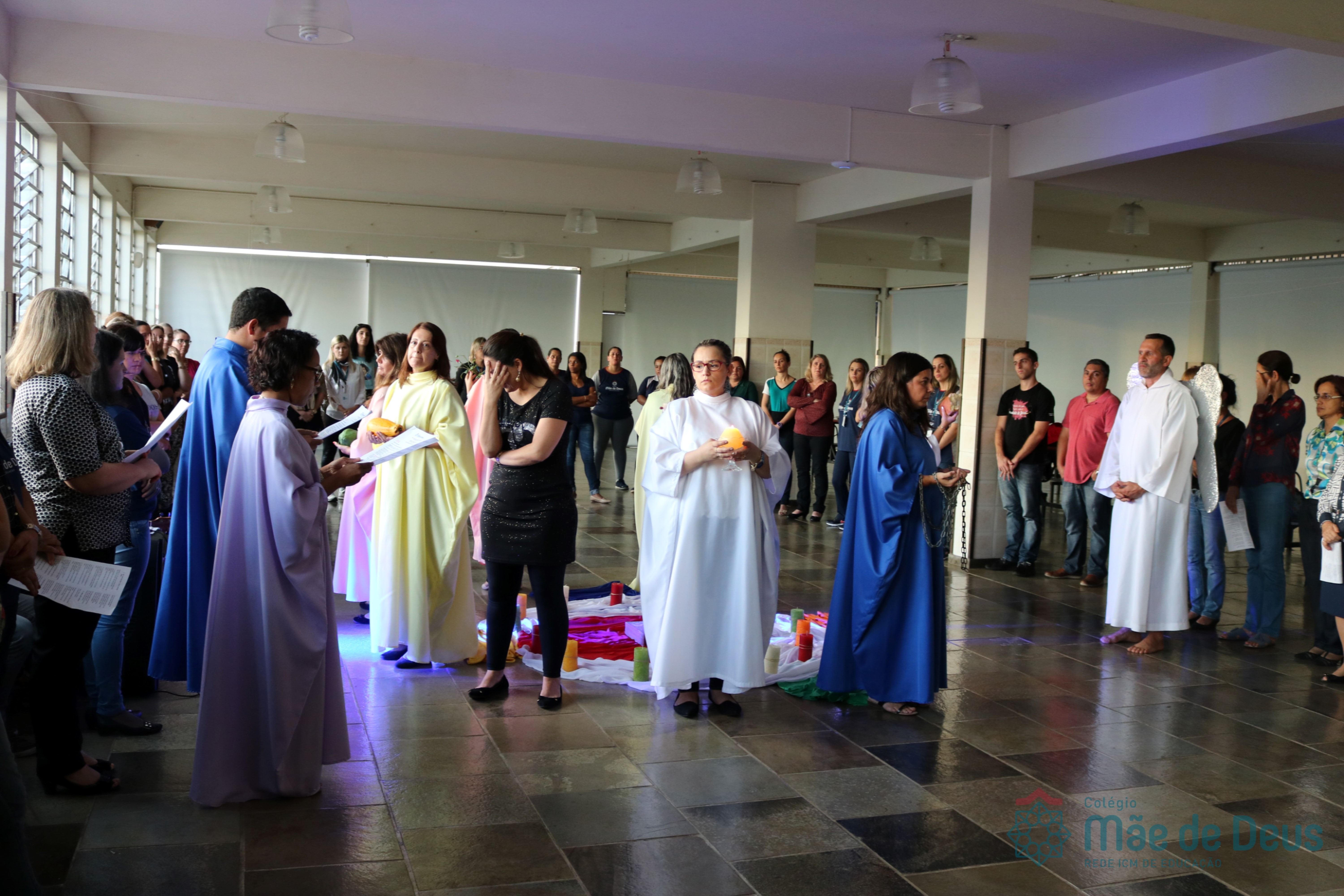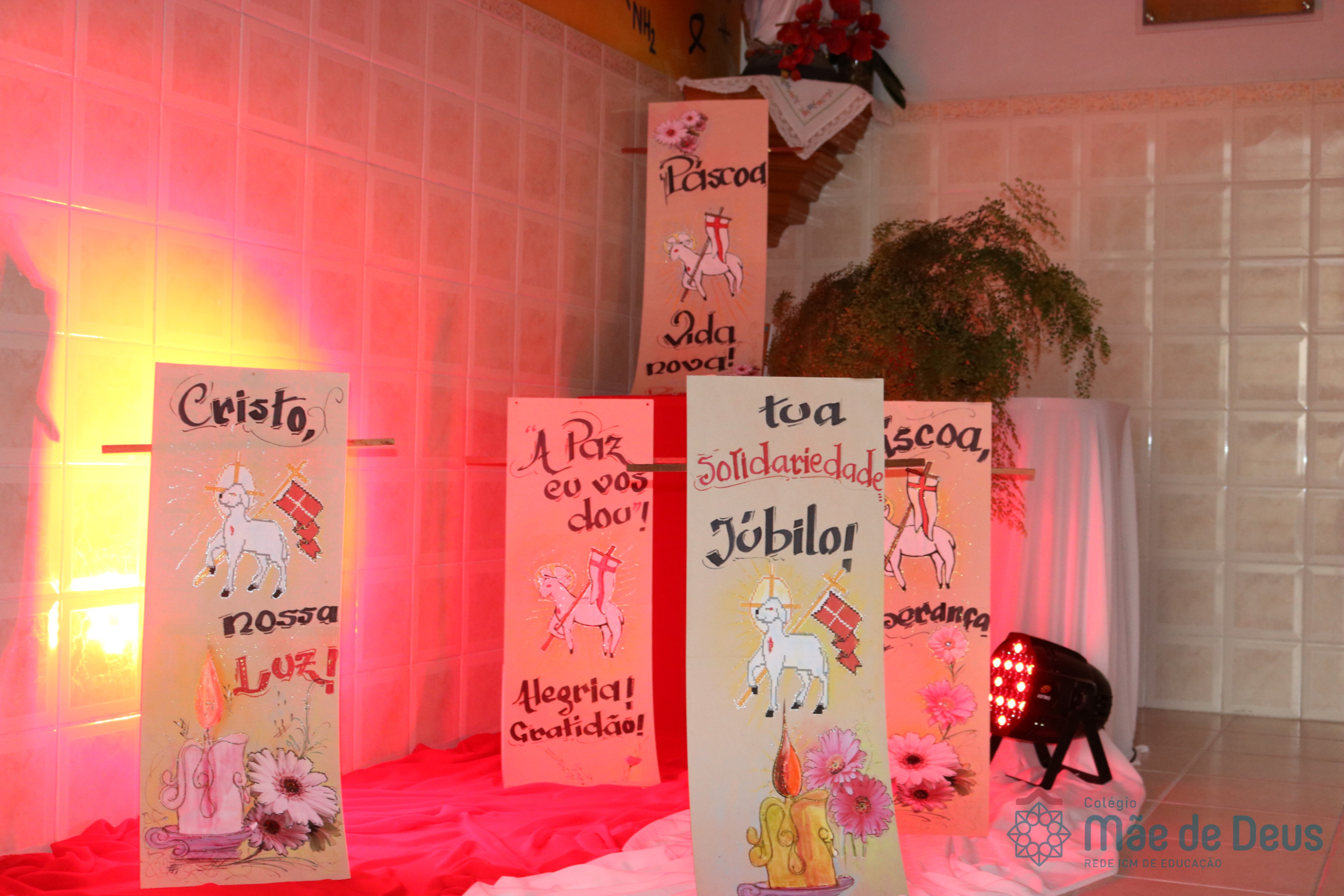 A celebração teve início no saguão 2 do Colégio, com símbolos e narração do Evangelho da Ressurreição, em que Maria Madalena anunciou que Jesus vive eternamente. Um dos momentos significativos, foi a partilha de sinais de ressurreição na vida de cada um de nós, realizada em pequenos grupos. Cada grupo acendeu uma vela no Círio Pascal e, em procissão, seguiu-se para a capela celebrando a Eucaristia.