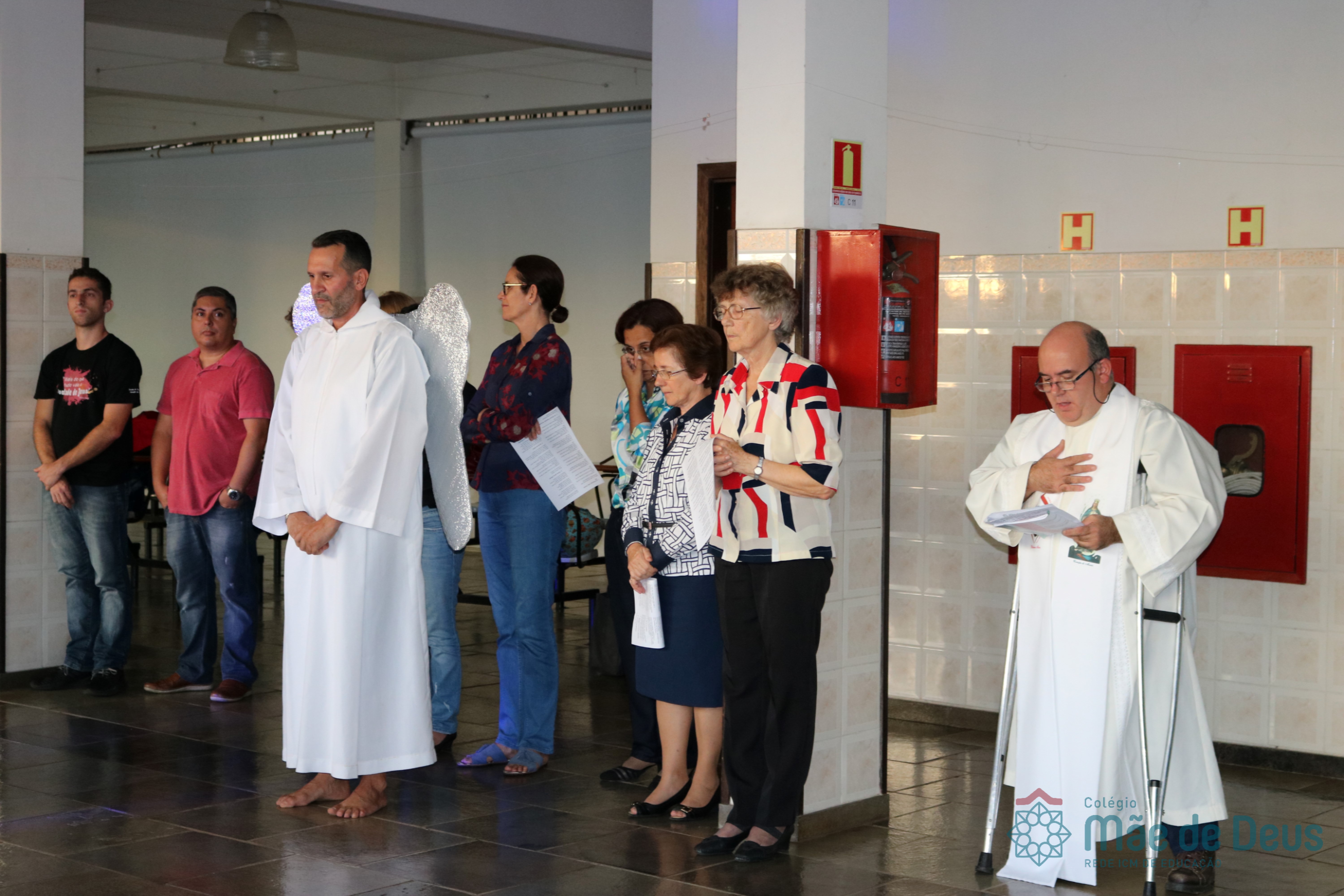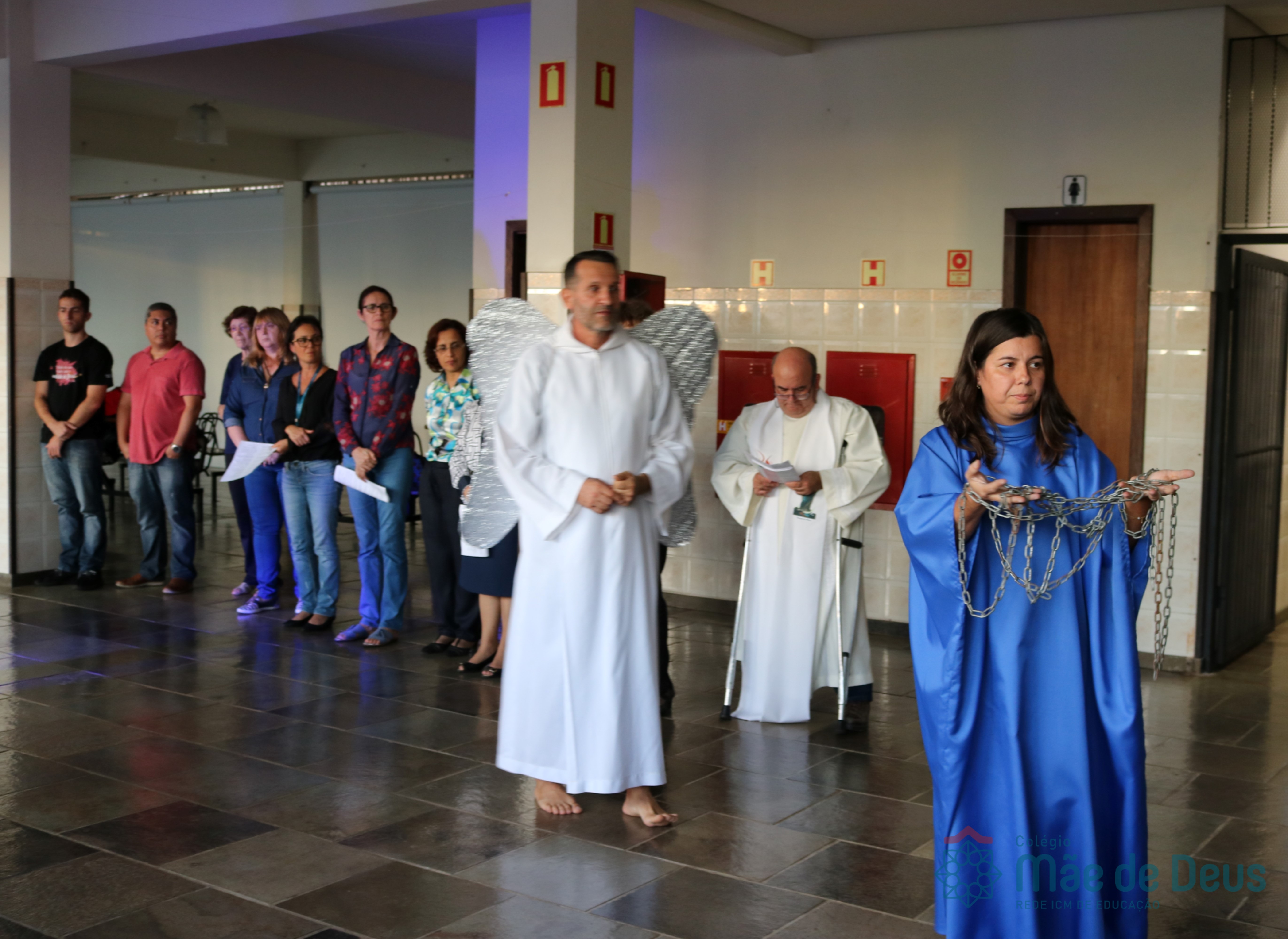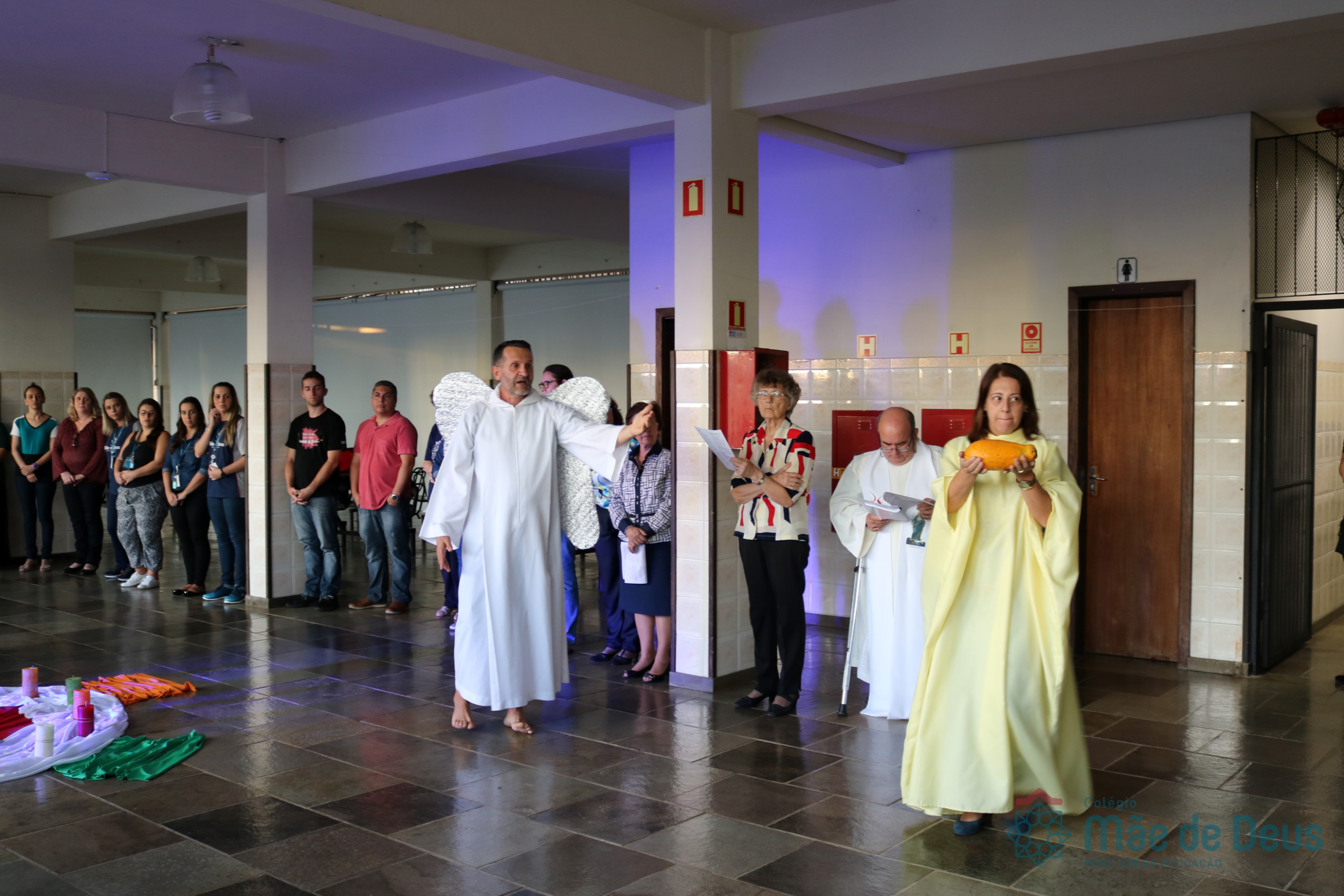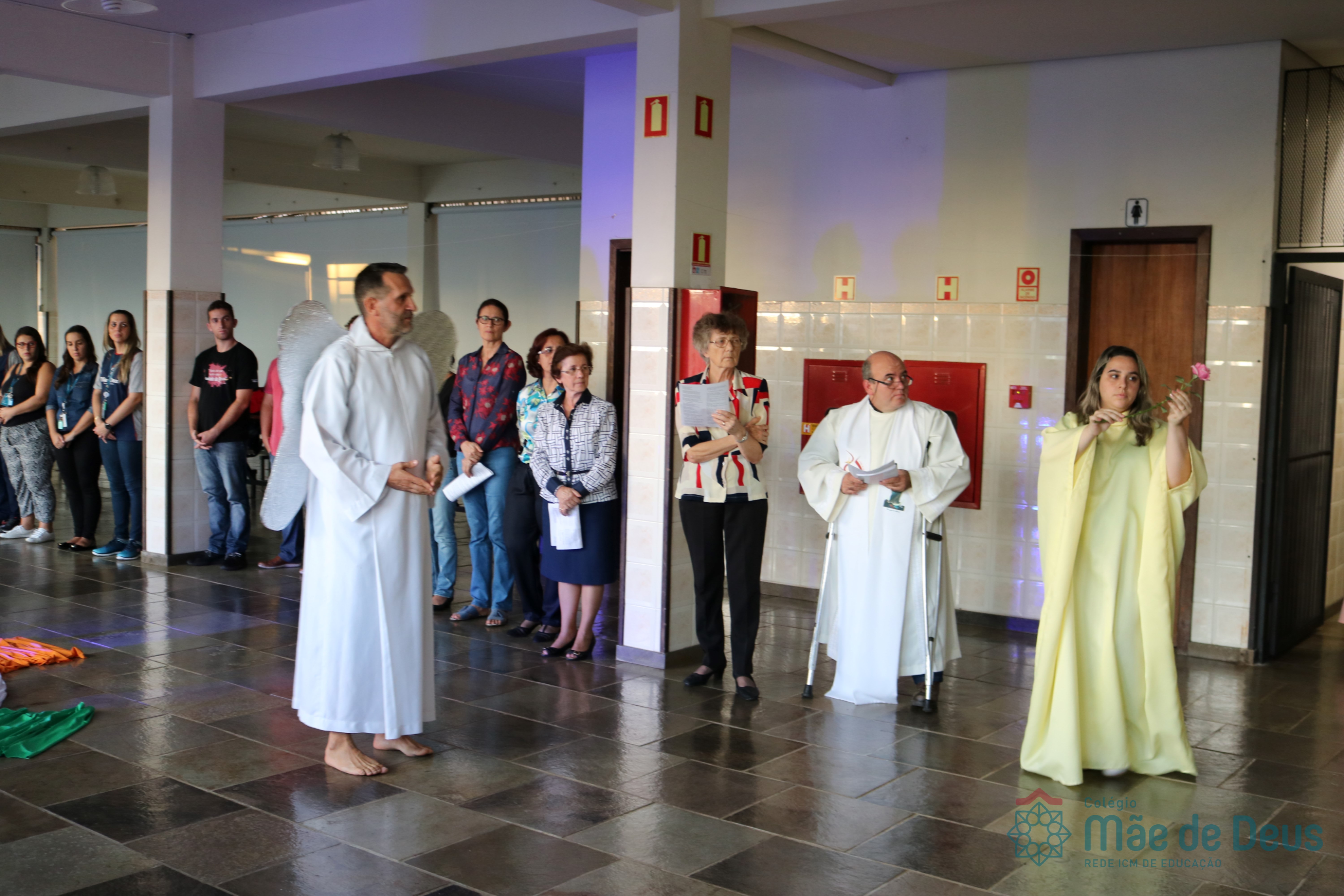 A celebração teve início no saguão 2 do Colégio, com símbolos e narração do Evangelho da Ressurreição, em que Maria Madalena anunciou que Jesus vive eternamente. Um dos momentos significativos, foi a partilha de sinais de ressurreição na vida de cada um de nós, realizada em pequenos grupos. Cada grupo acendeu uma vela no Círio Pascal e, em procissão, seguiu-se para a capela celebrando a Eucaristia.