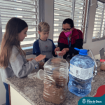 Os alunos realizaram o processo da decantação ou sedimentação. Após isso, realizaram o processo de filtração, onde constataram a rapidez do processo e que grande parte da areia ficou no filtro.