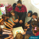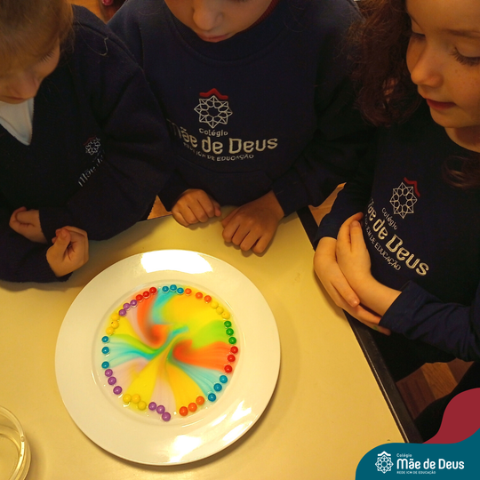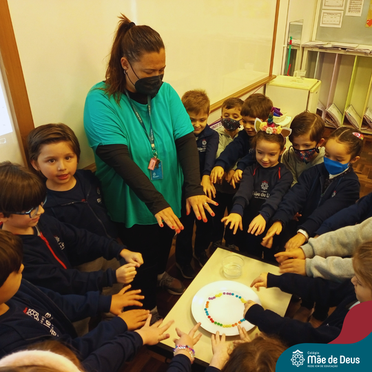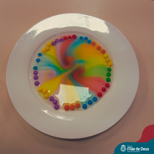 Os alunos do Pré2 realizaram a experiência de misturar chocolates coloridos e água, que resultou em um lindo arco-íris.