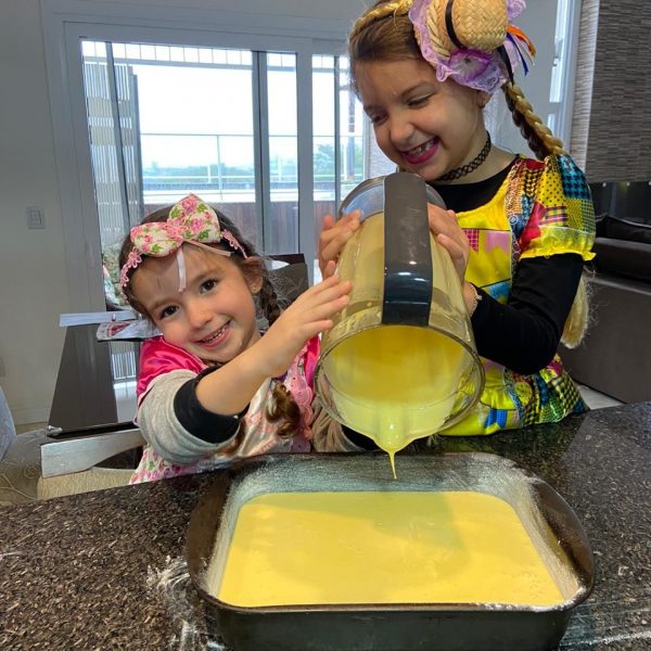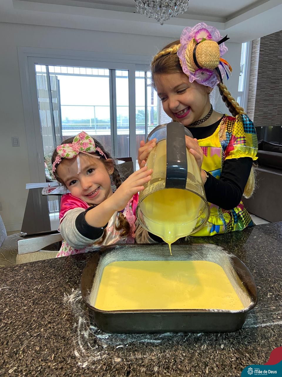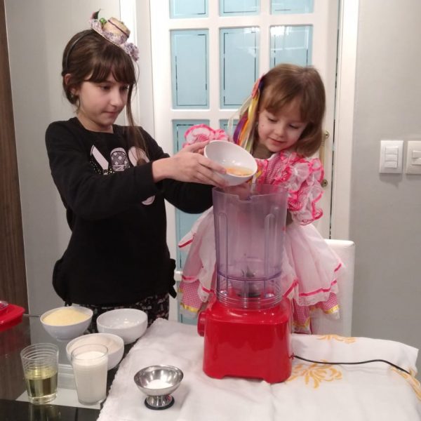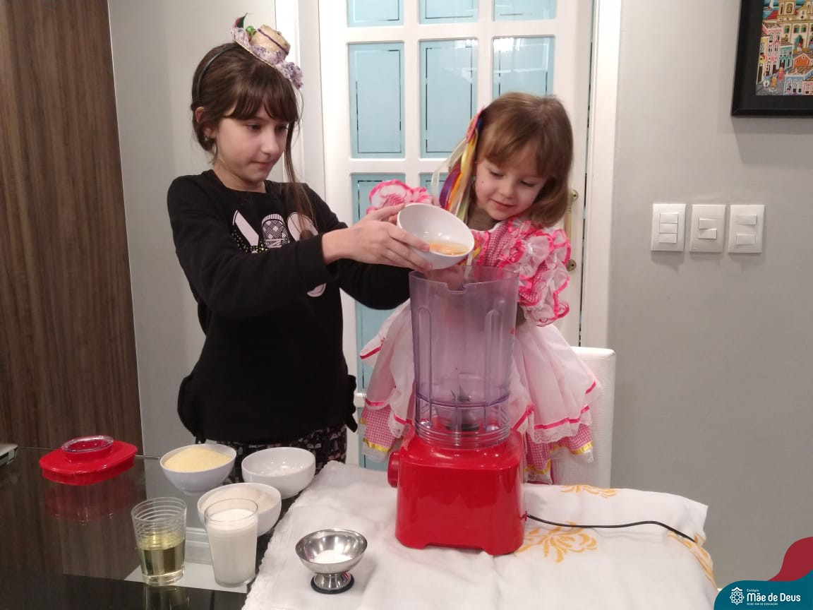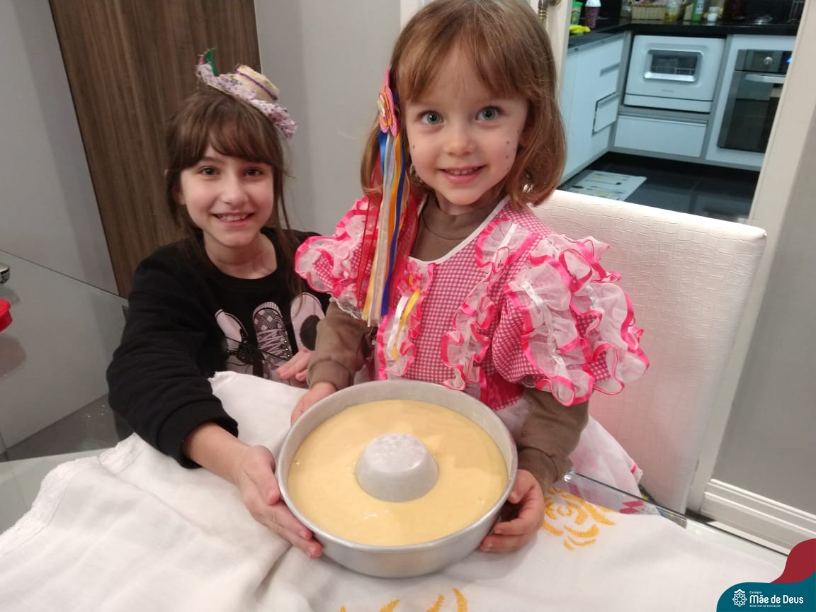 As alunas Catarina e Isabel do Maternal, a partir da proposta das atividades domiciliares, preparam um bolo de milho com sua família e compartilharam toda a gostosura desse prato típico.