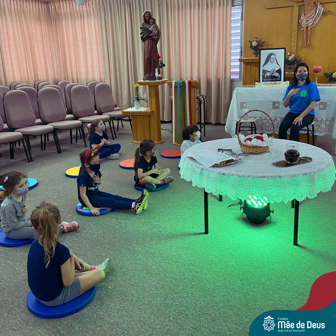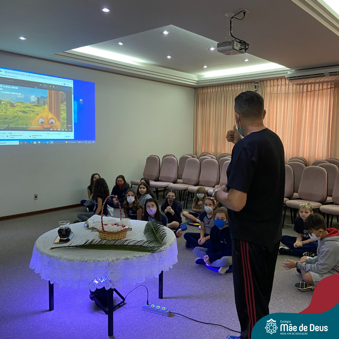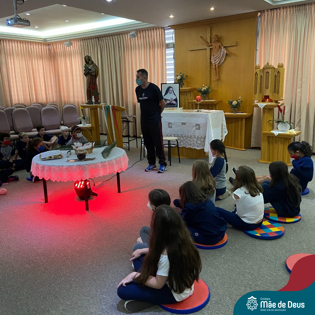 As turmas da Educação Infantil e dos Anos Iniciais do Ensino Fundamental participaram, na capela do colégio, do cultivo mensal, celebrando a preparação para a Páscoa. As crianças compreenderam melhor o sentido da morte e Ressurreição de Jesus e o significado do pão e do vinho partilhados entre os cristãos. A Páscoa é uma oportunidade de vivenciarmos gestos de partilha e solidariedade, na perspectiva de um mundo pleno de vida, esperança e paz.