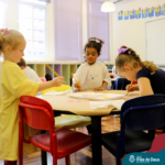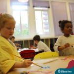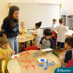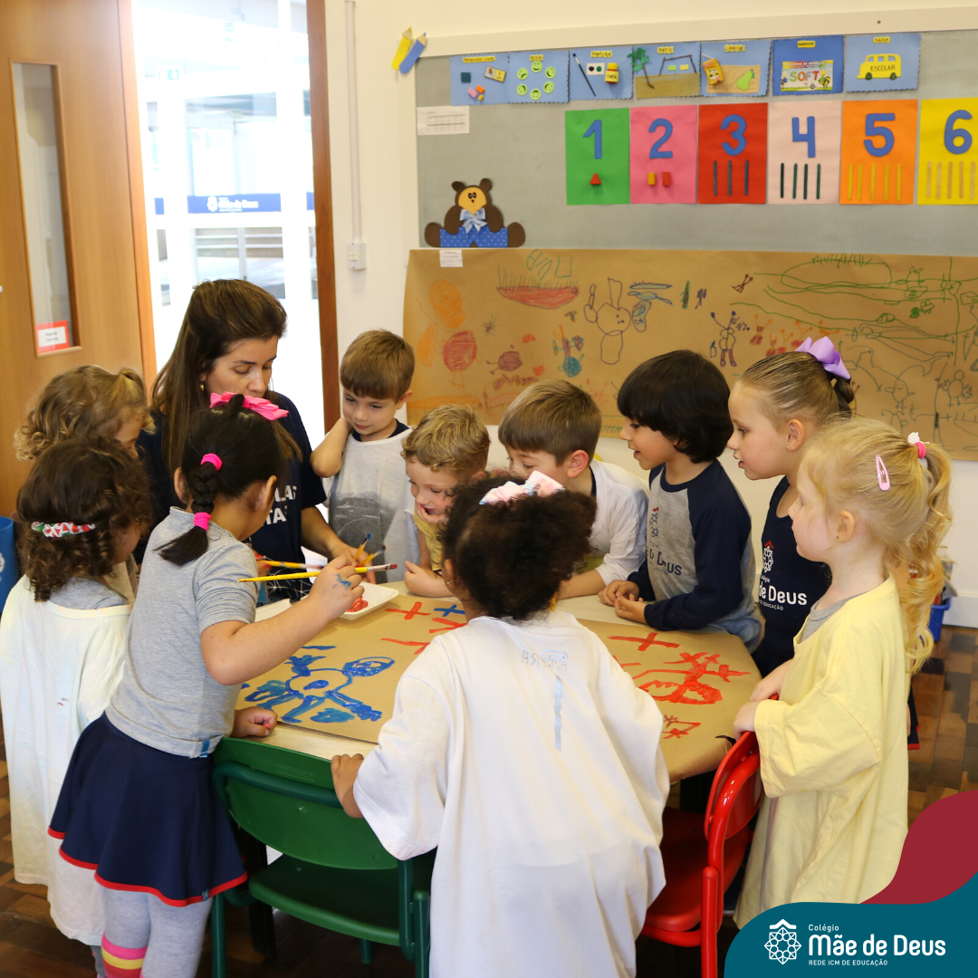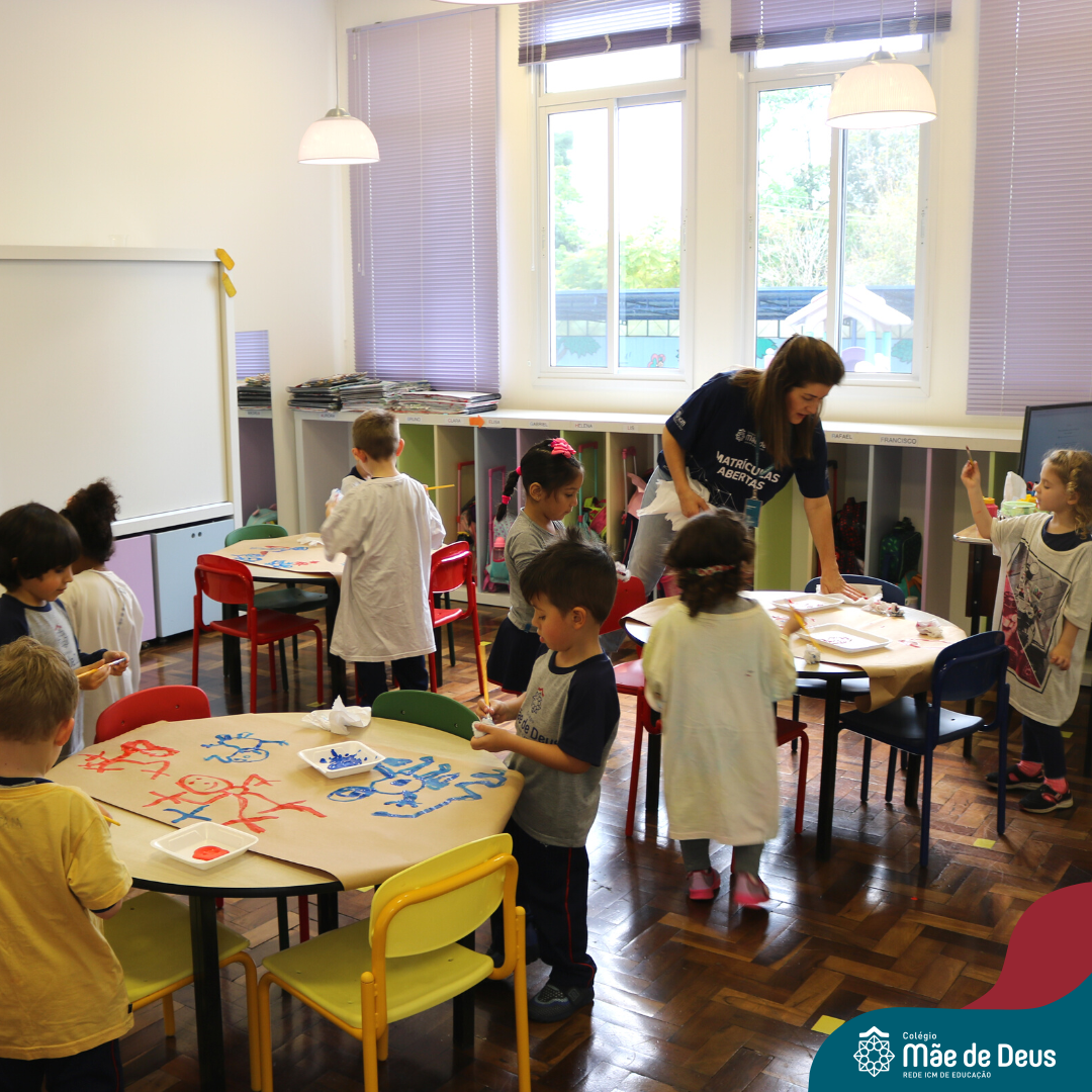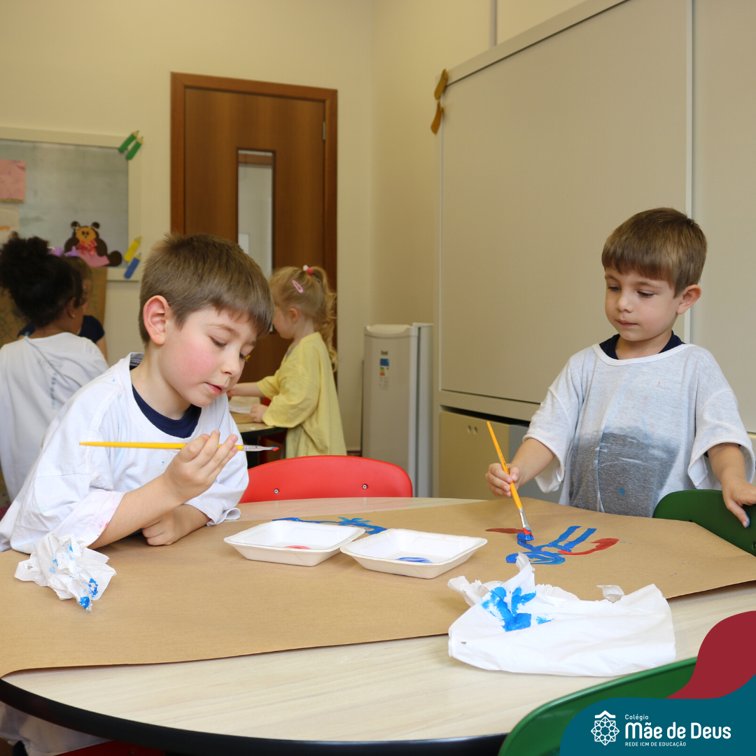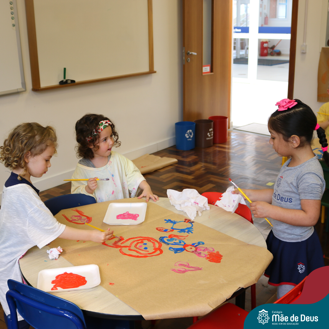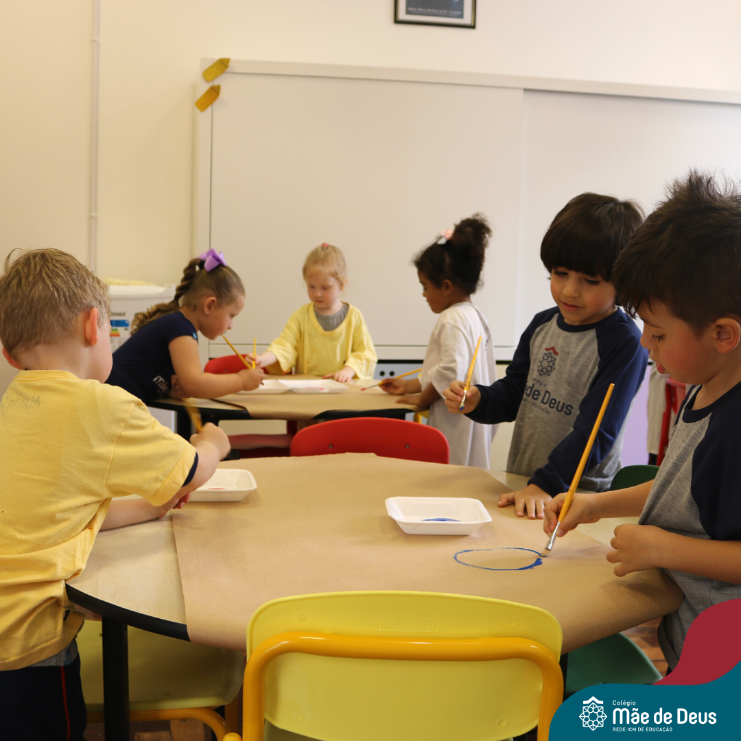 Os alunos do Maternal usaram tintas coloridas para desenhar figuras humanas.