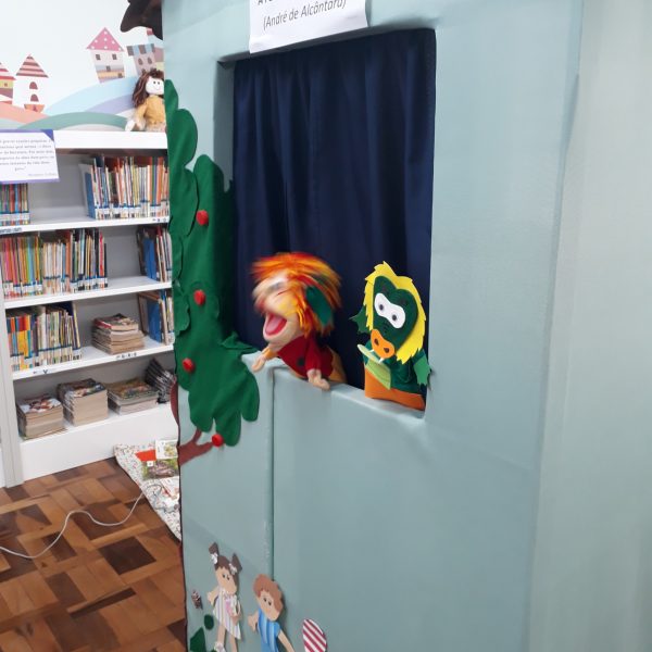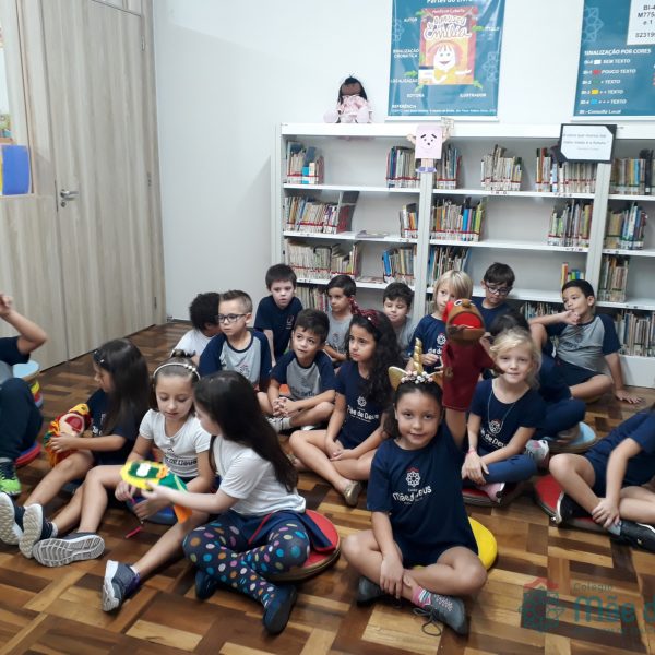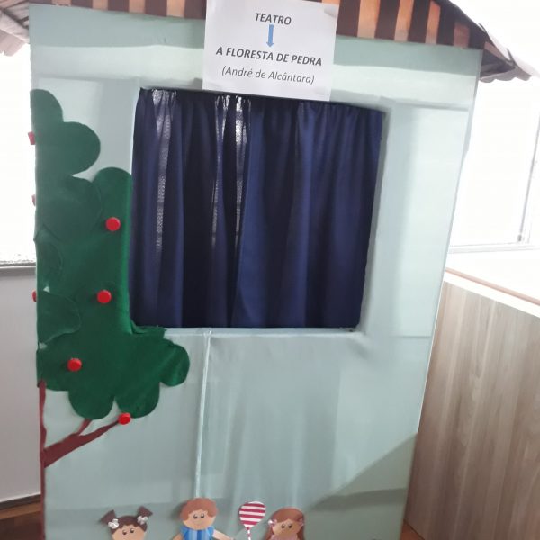 Para os alunos da Educação Infantil ao 1º ano, organizamos um teatro com a história “A Floresta de Pedra,” do autor André de Alcântara. Teve muita alegria e diversão durante a apresentação.