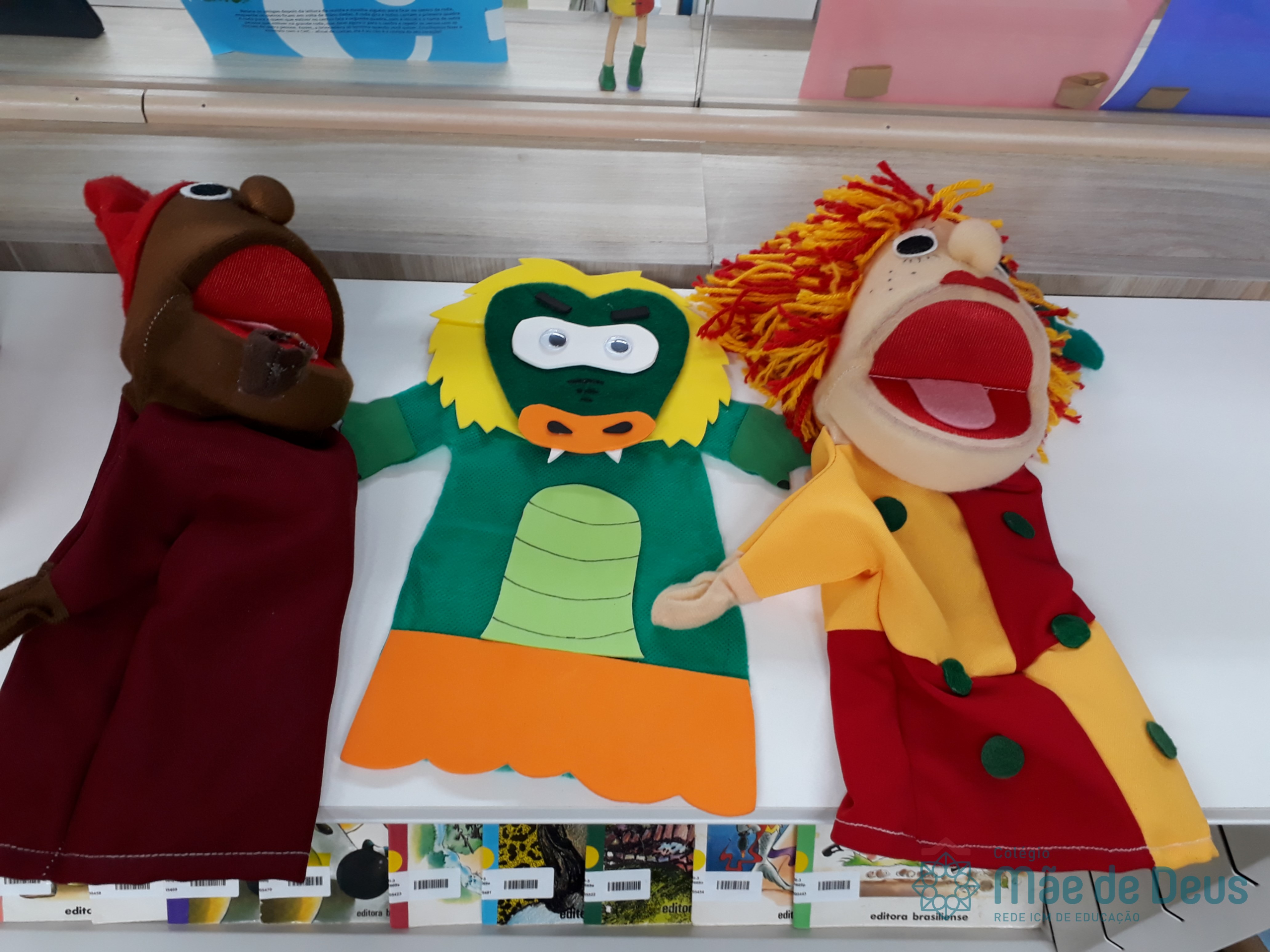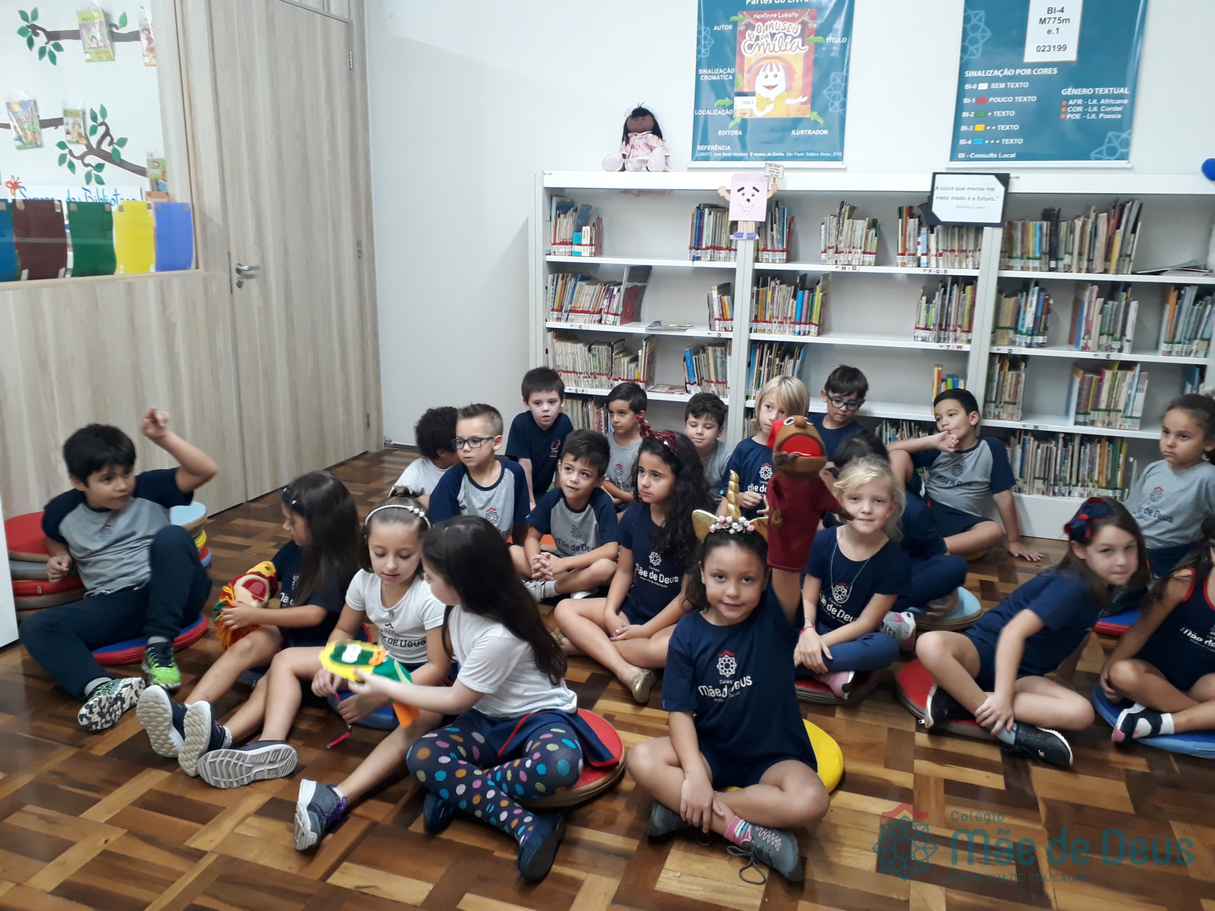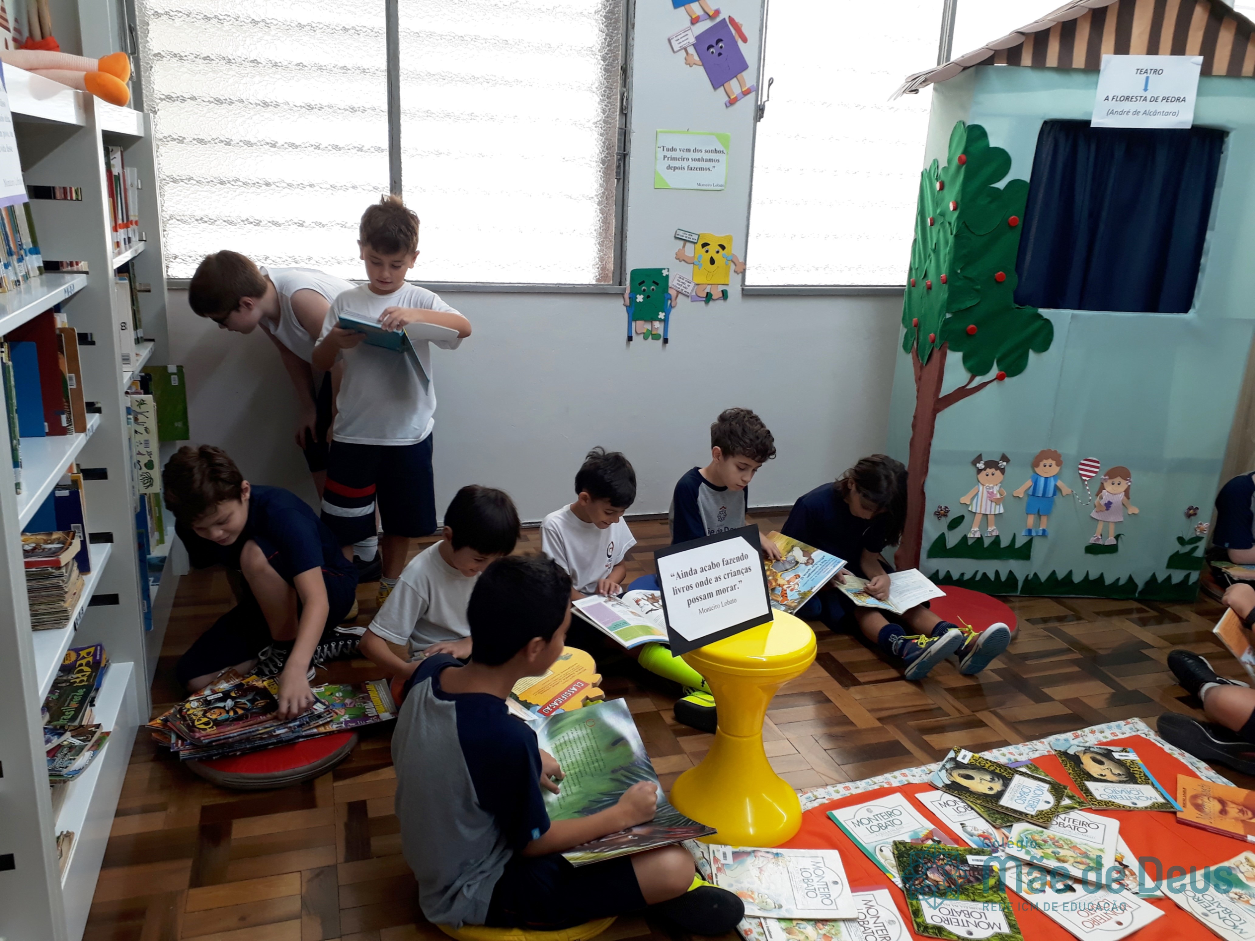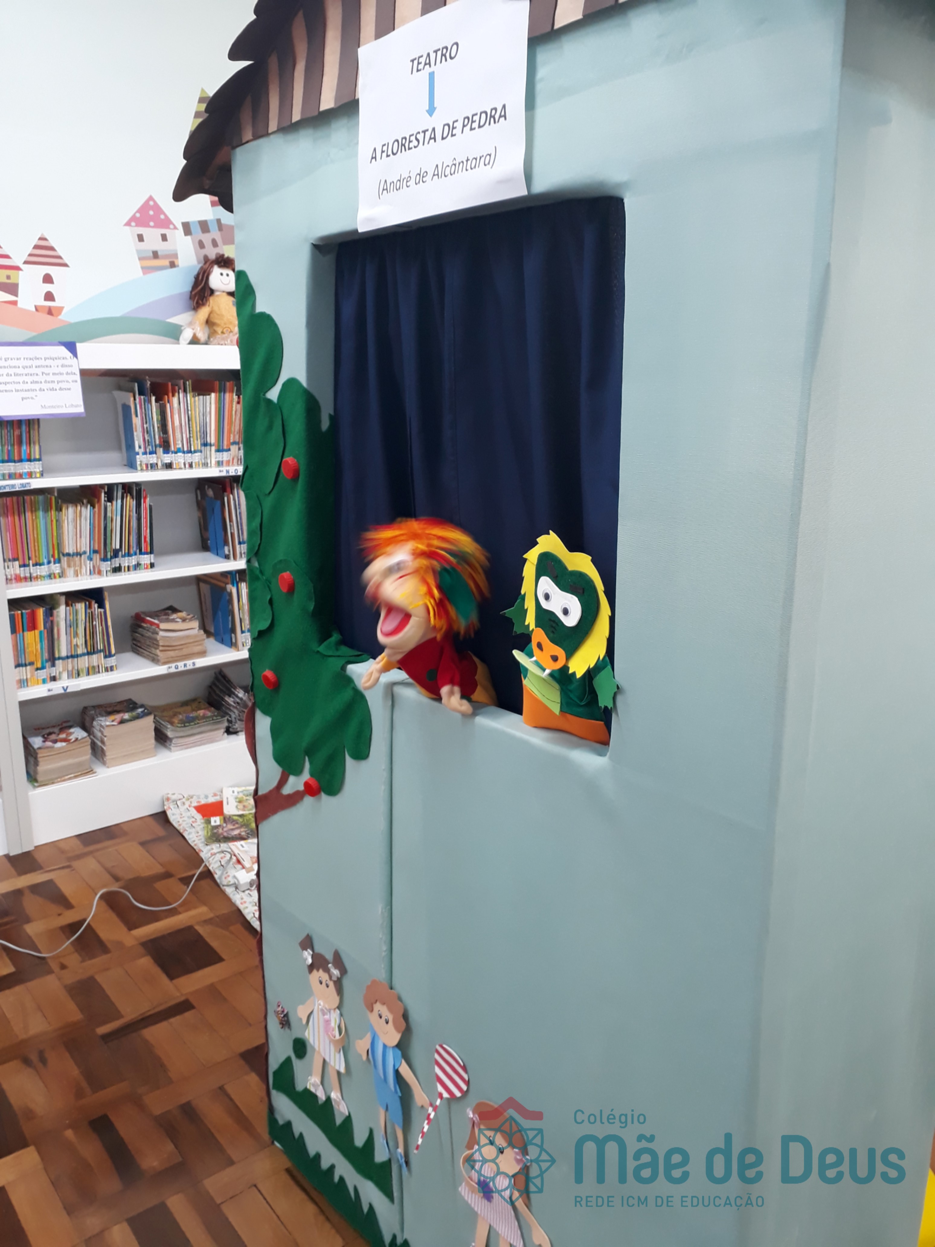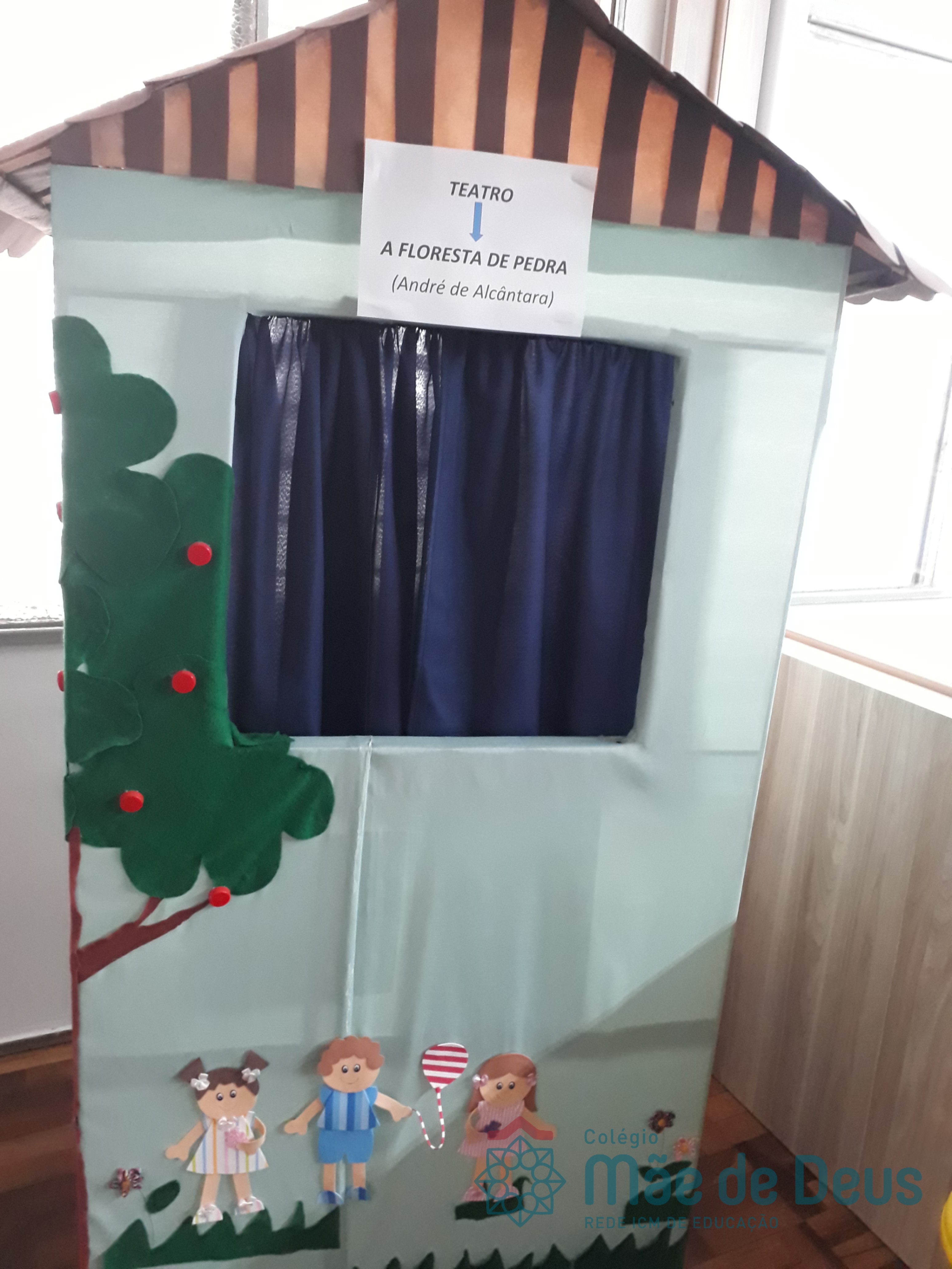 Para os alunos da Educação Infantil ao 1º ano, organizamos um teatro com a história “A Floresta de Pedra,” do autor André de Alcântara. Teve muita alegria e diversão durante a apresentação.