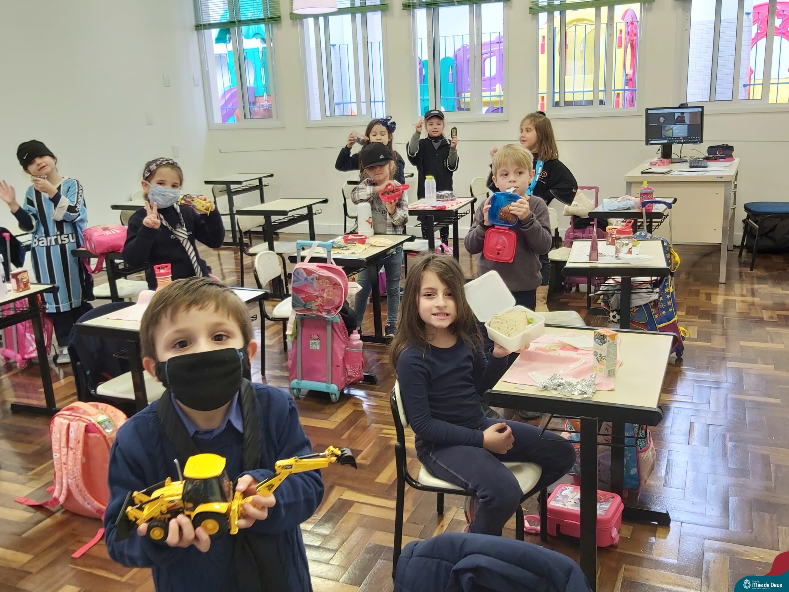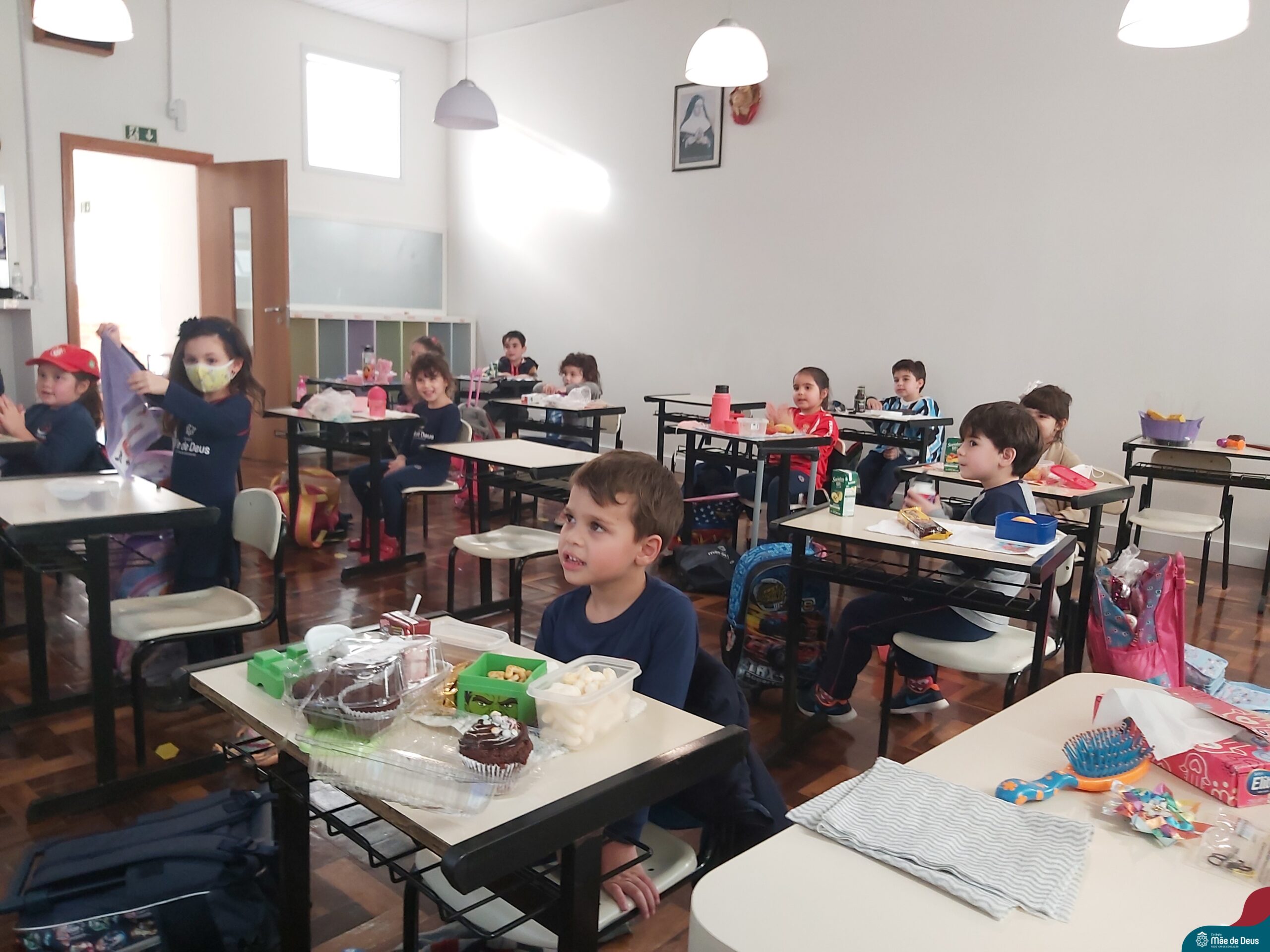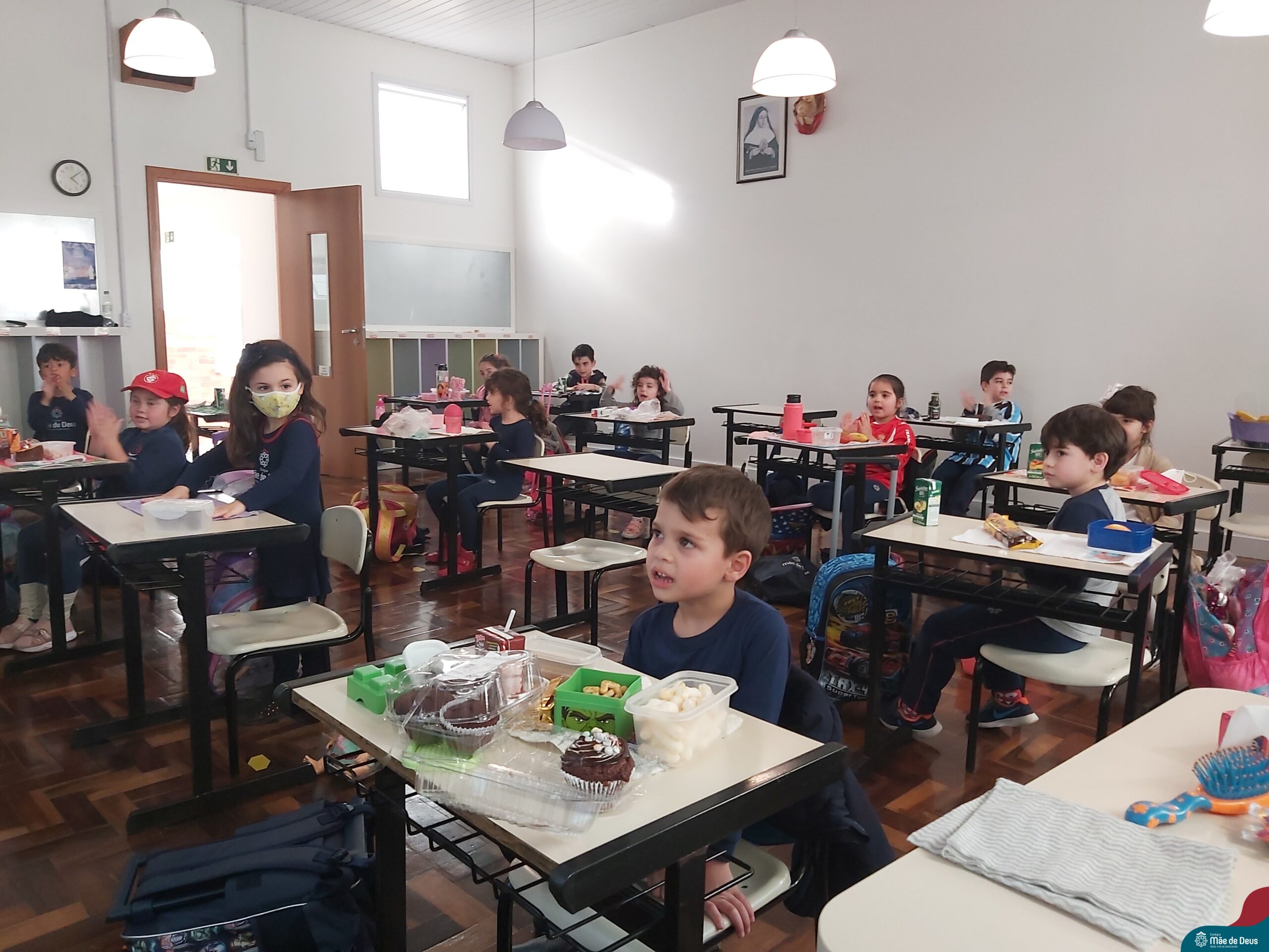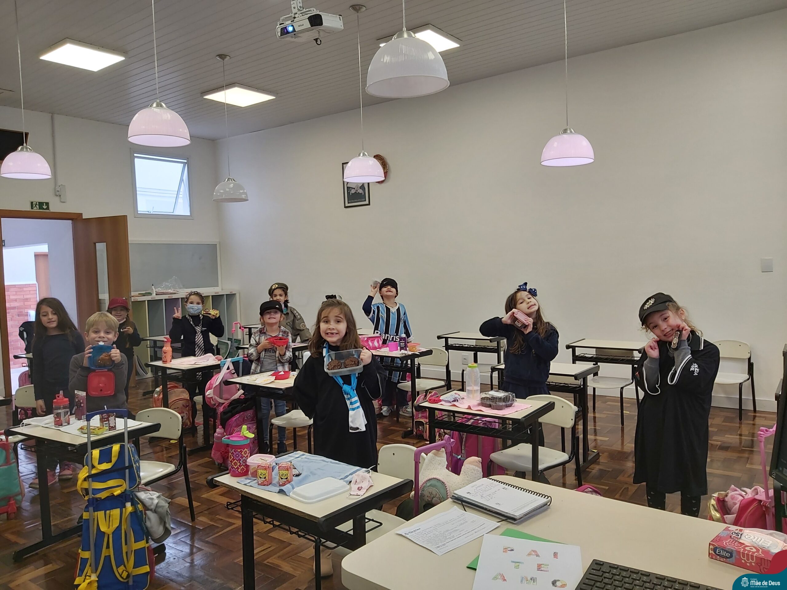 As turmas do Pré 2A e 2B da Educação Infantil, encerraram a semana dos pais comemorando essa data com um lanche especial, cantando parabéns e caracterizados de Papai!