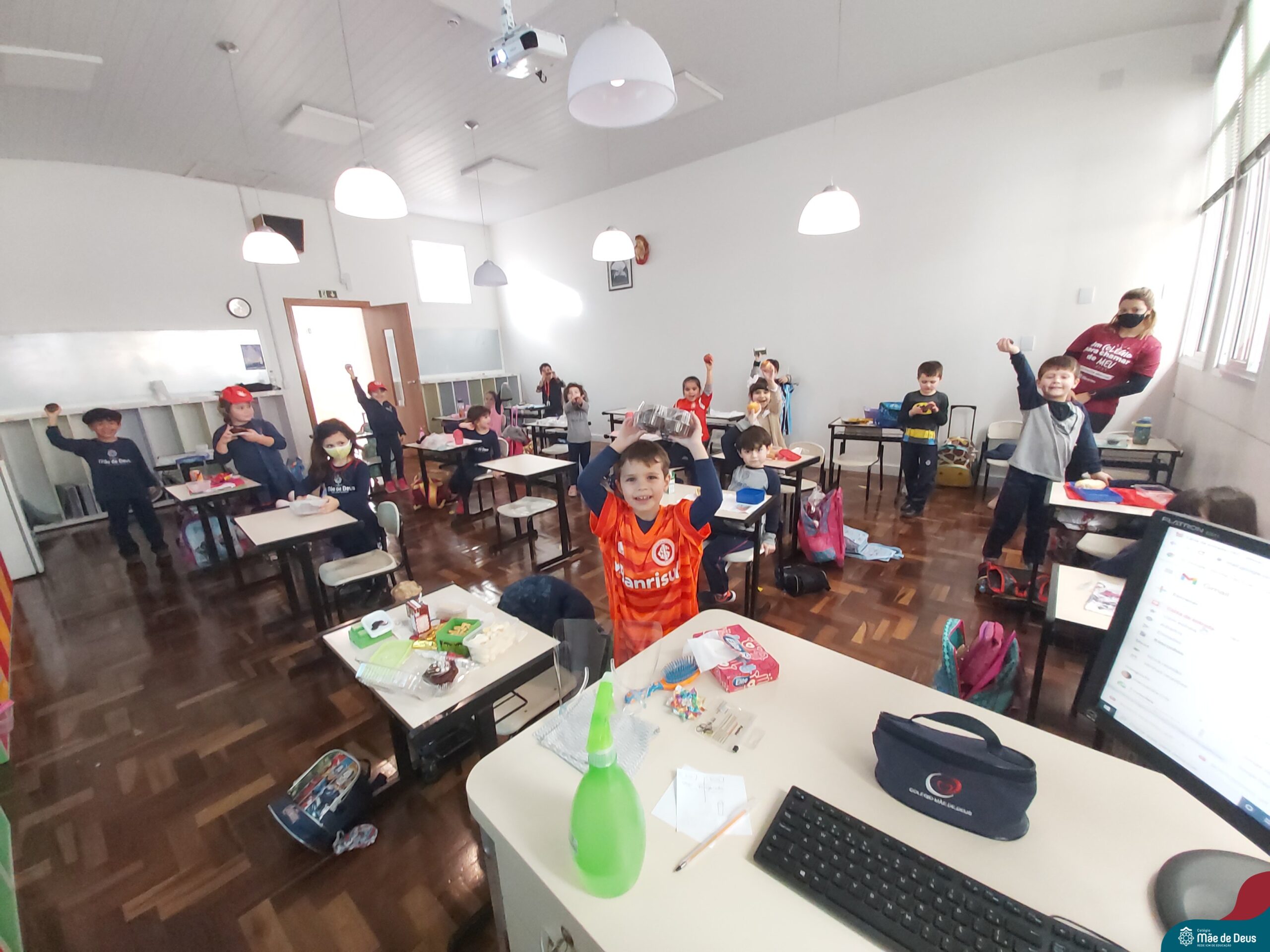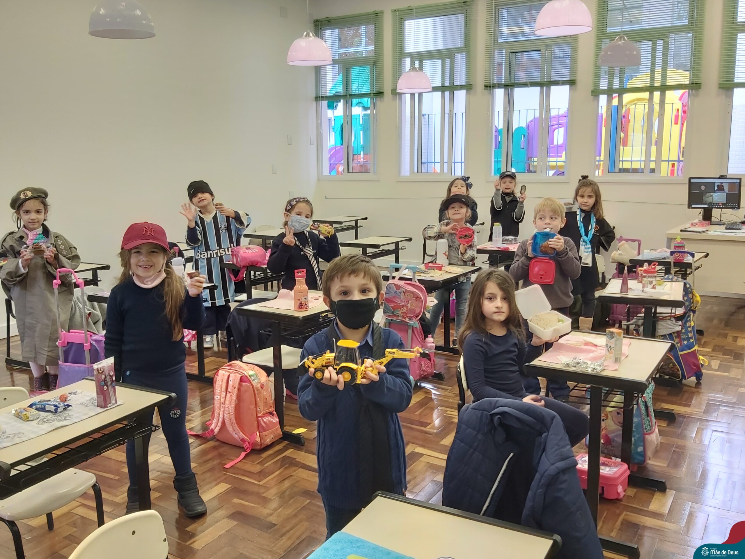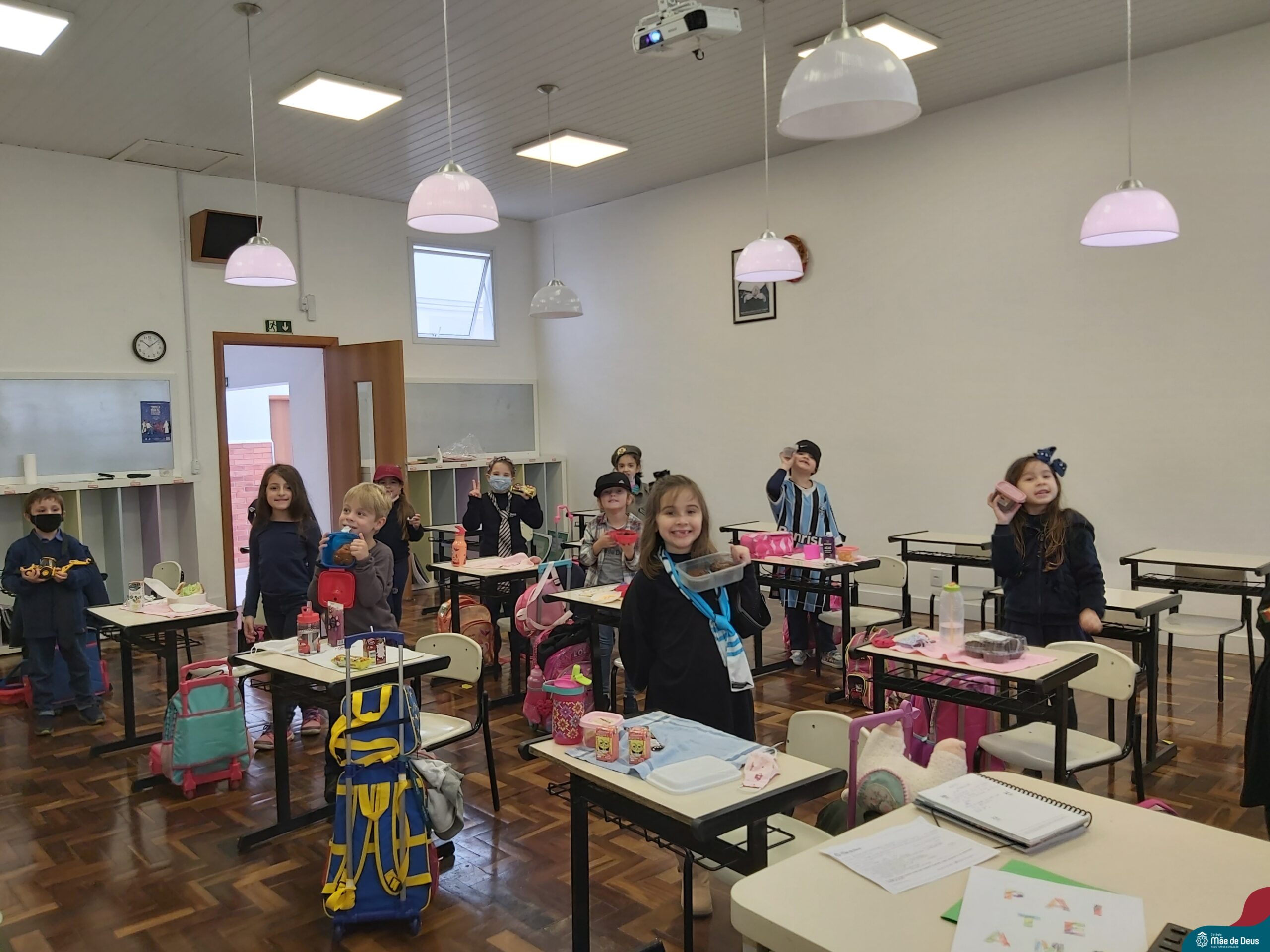 As turmas do Pré 2A e 2B da Educação Infantil, encerraram a semana dos pais comemorando essa data com um lanche especial, cantando parabéns e caracterizados de Papai!