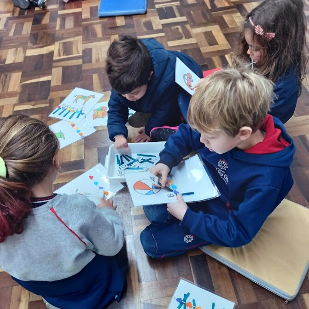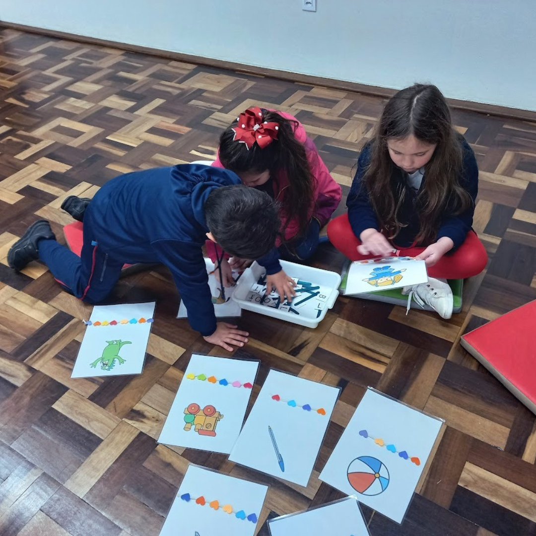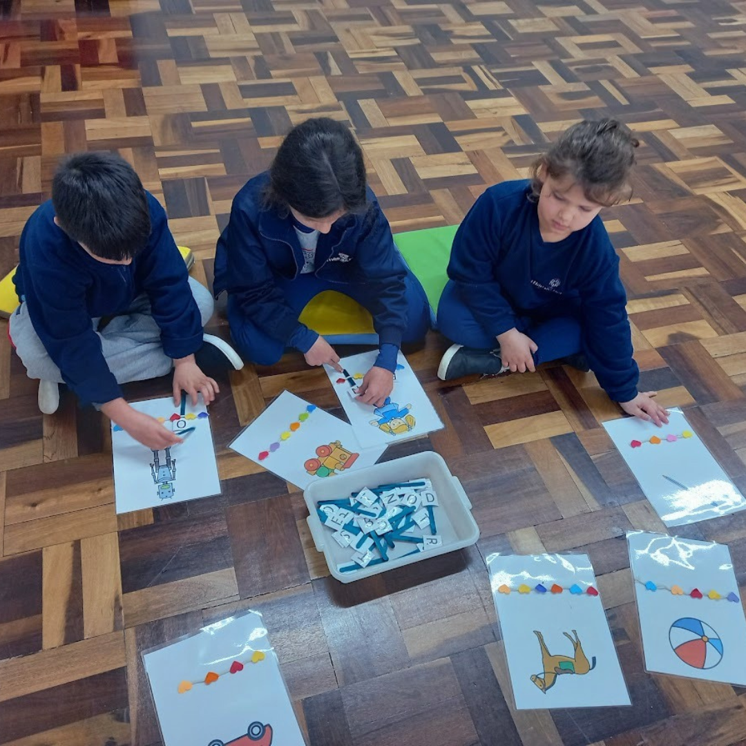 Os alunos do 1º Ano do Ensino Fundamental realizaram, com a teacher do bilíngue, uma dinâmica de letramento, a partir da metodologia da Rotação por Estação.