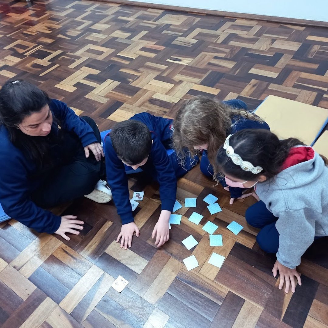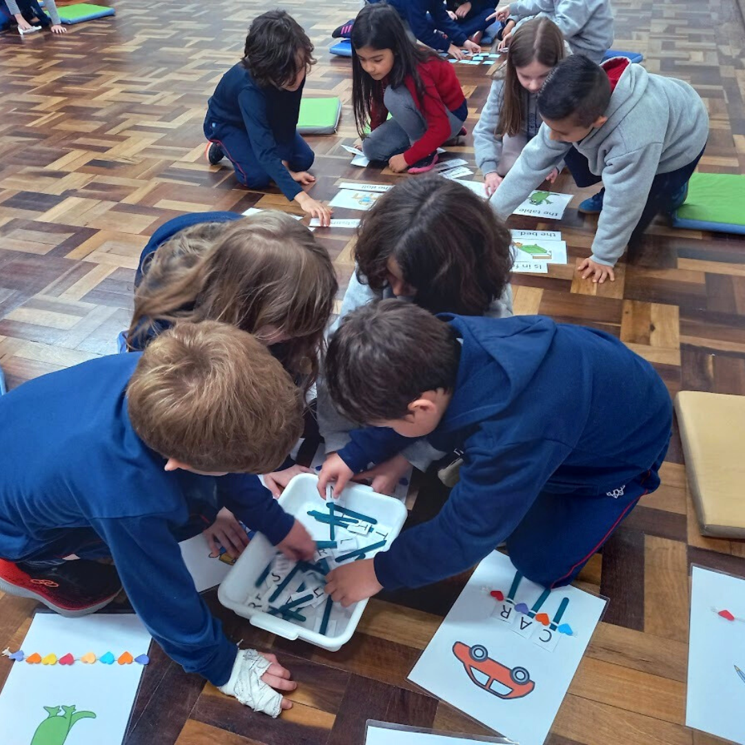 Divididos em seis grupos, os alunos realizaram três atividades: quebra-cabeça de frases, construção de palavras por letras embaralhadas e jogo da memória com o vocabulário do projeto Little Farm.