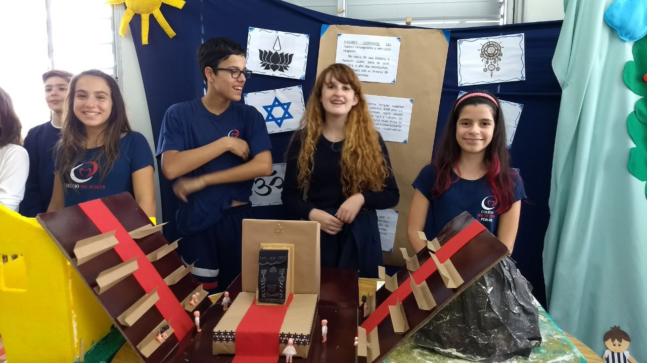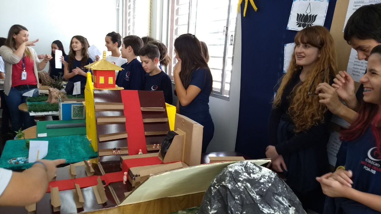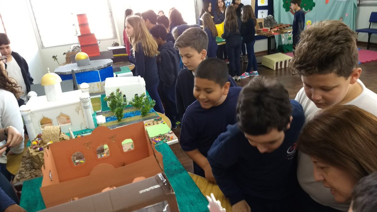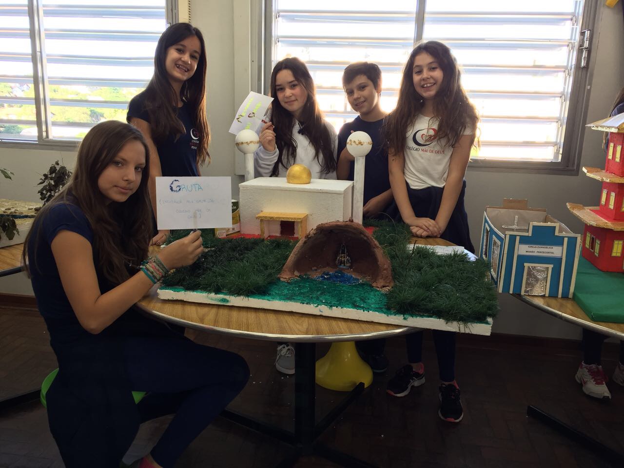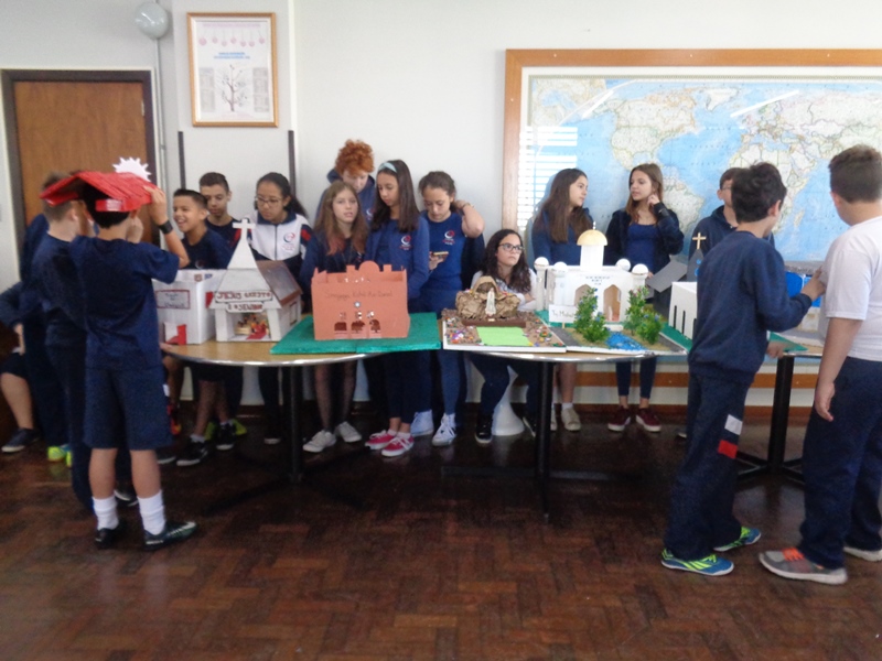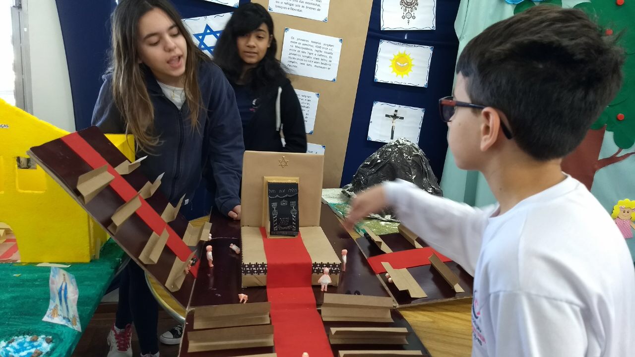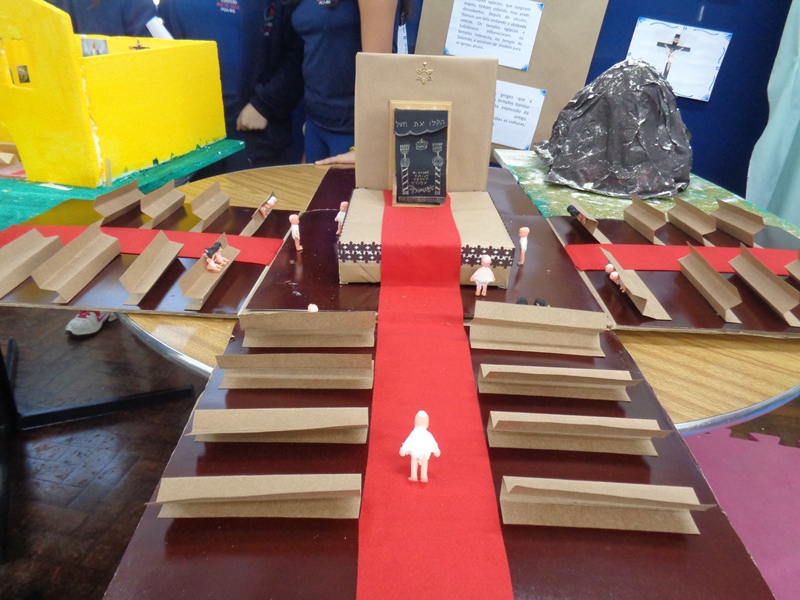 Após a realização dos estudos, os alunos construíram maquetes sobre os diferentes espaços sagrados, sendo eles, espaços construídos, como: Mesquitas, Igrejas, Sinagogas, Templos Budistas, Templos Indígenas e espaços da natureza, como: Rios, montanhas, grutas naturais, entre outras. Este trabalho foi apresentado na biblioteca para os alunos do 5º ano do Ensino Fundamental e à comunidade escolar por meio de exposição no saguão.