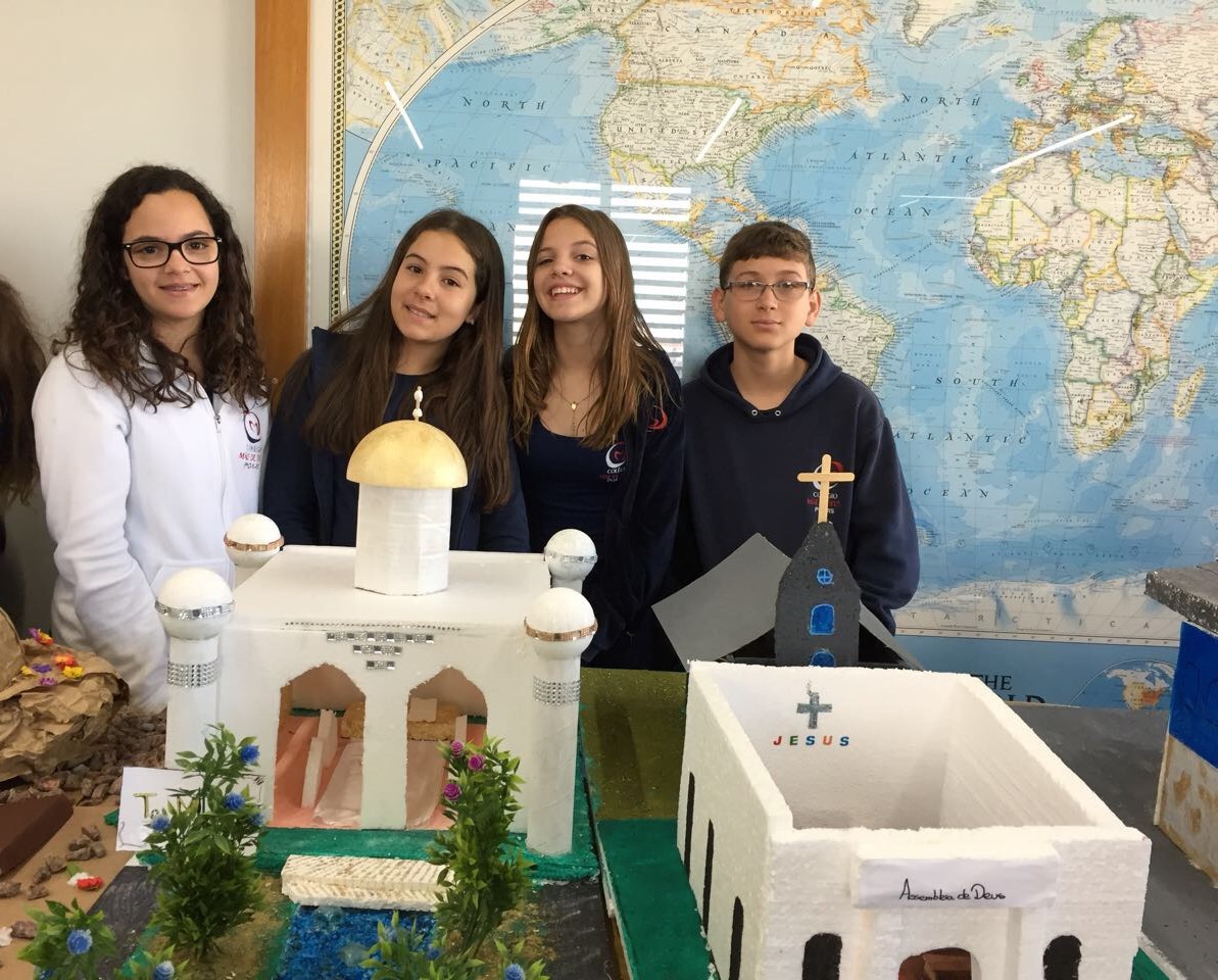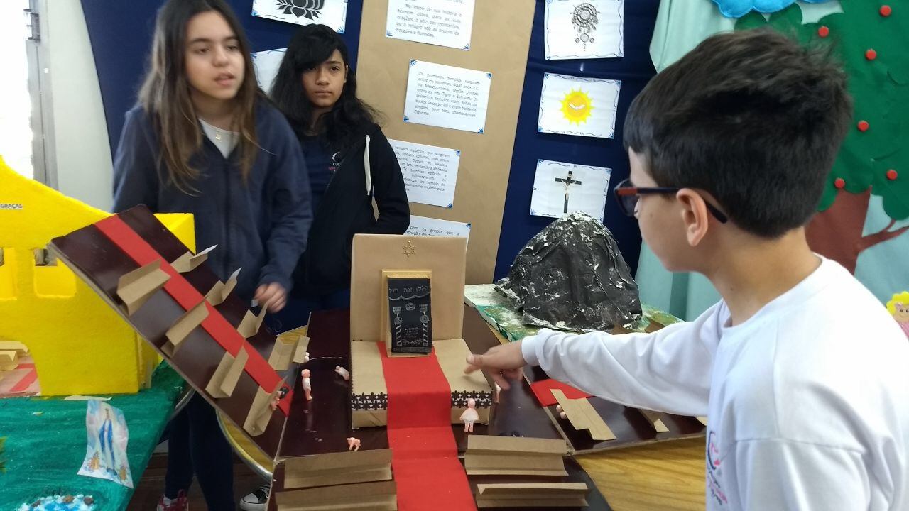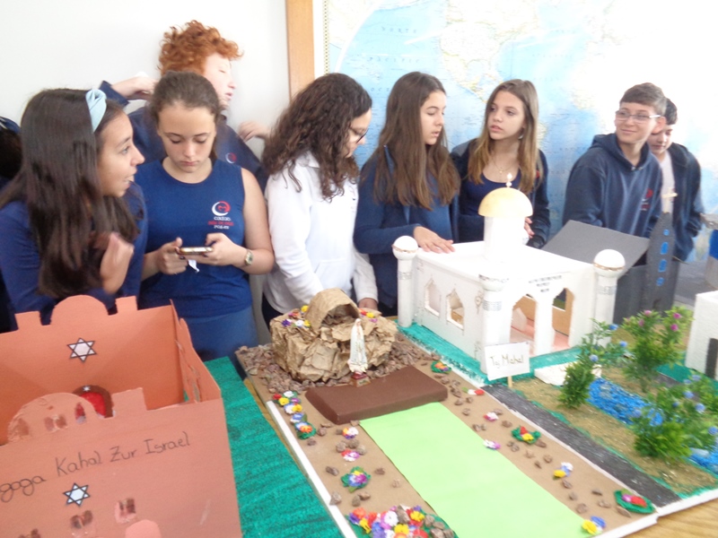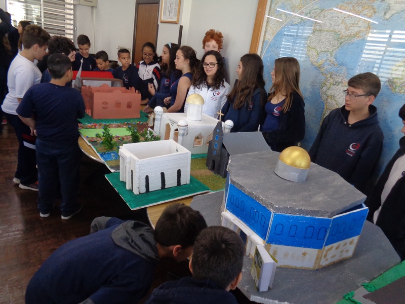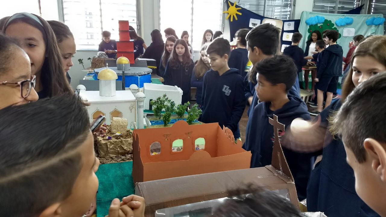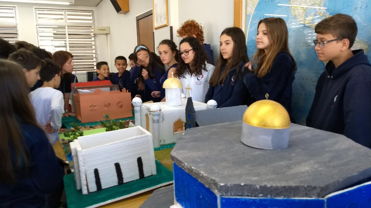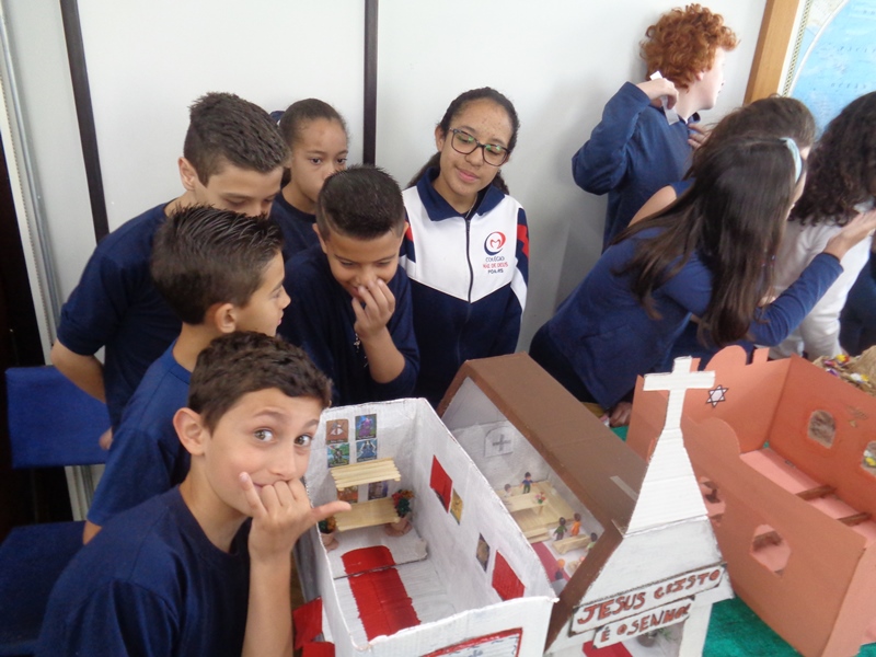 Após a realização dos estudos, os alunos construíram maquetes sobre os diferentes espaços sagrados, sendo eles, espaços construídos, como: Mesquitas, Igrejas, Sinagogas, Templos Budistas, Templos Indígenas e espaços da natureza, como: Rios, montanhas, grutas naturais, entre outras. Este trabalho foi apresentado na biblioteca para os alunos do 5º ano do Ensino Fundamental e à comunidade escolar por meio de exposição no saguão.