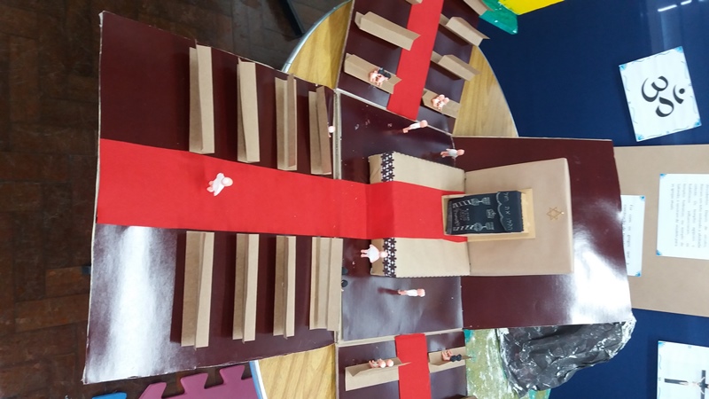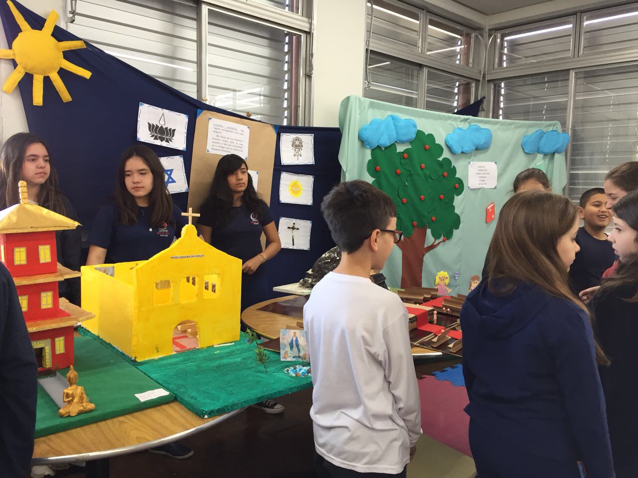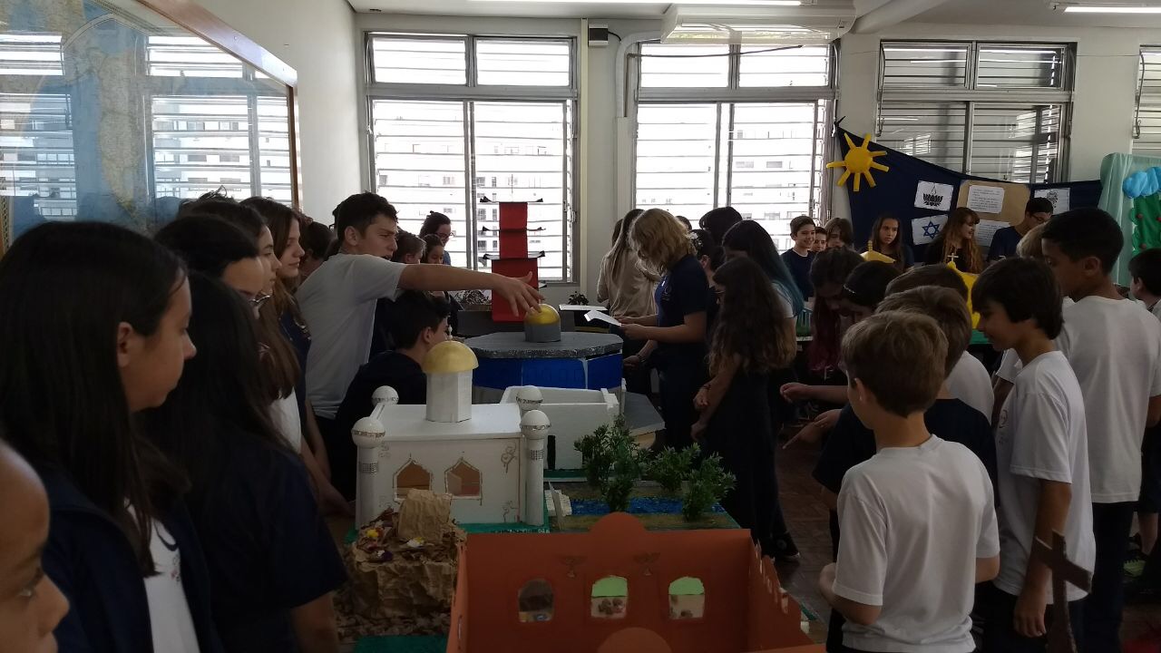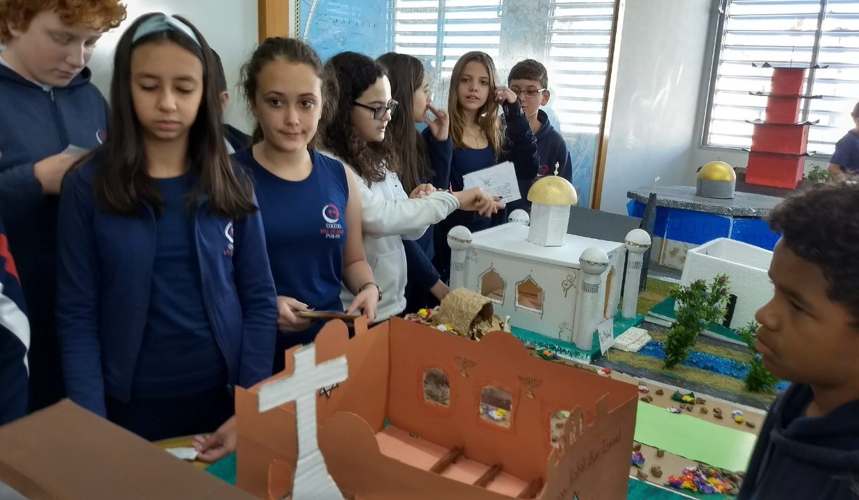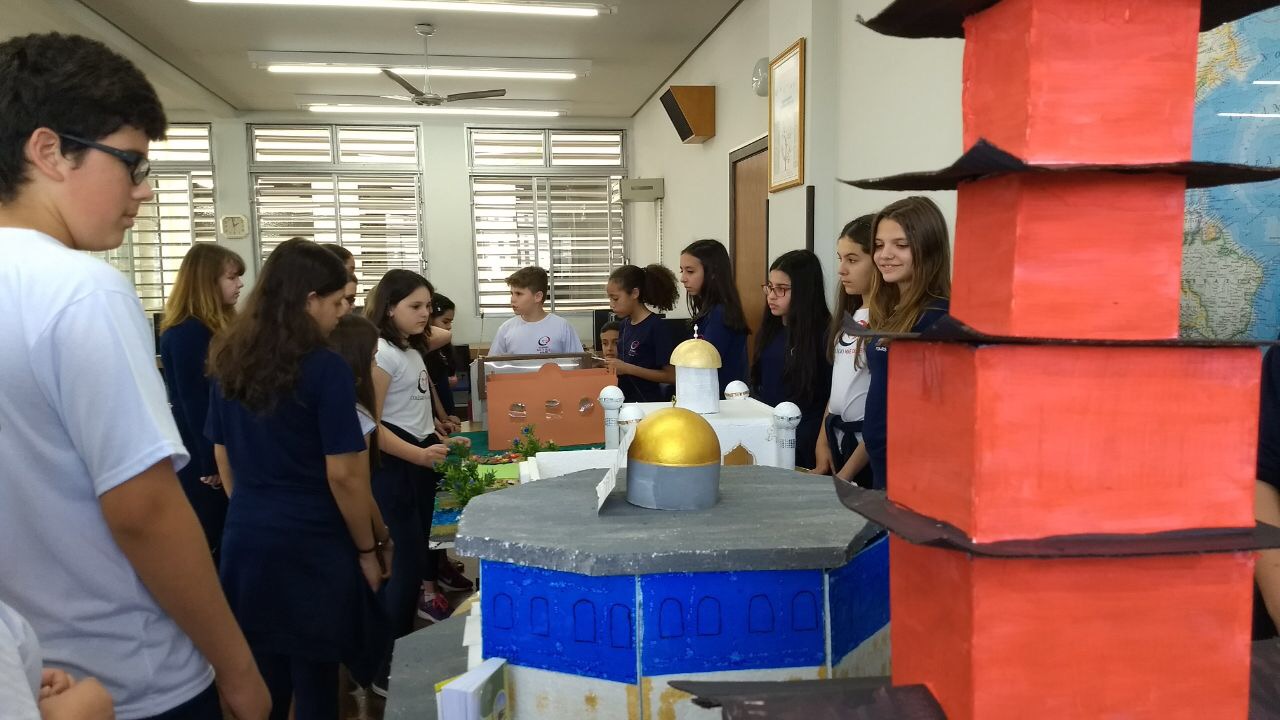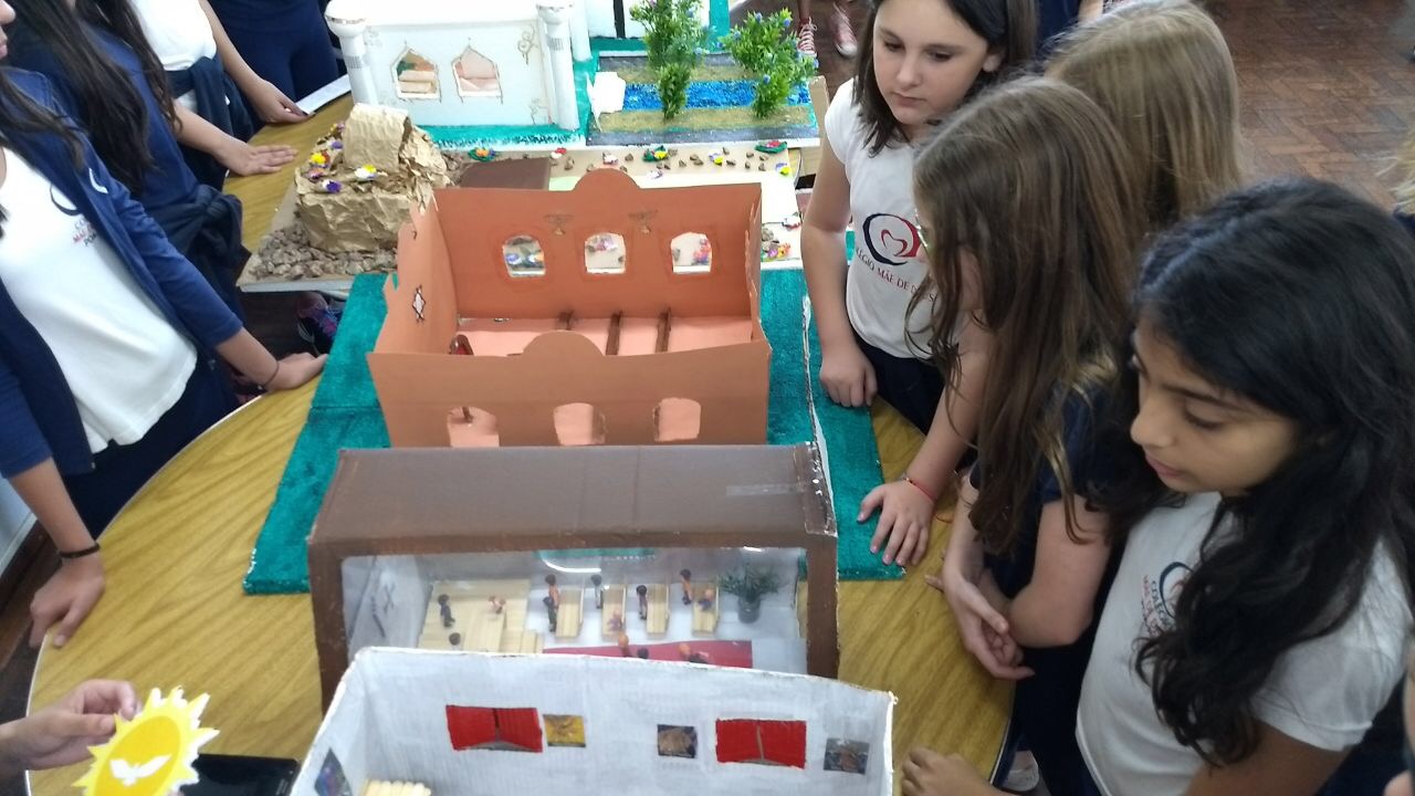 Após a realização dos estudos, os alunos construíram maquetes sobre os diferentes espaços sagrados, sendo eles, espaços construídos, como: Mesquitas, Igrejas, Sinagogas, Templos Budistas, Templos Indígenas e espaços da natureza, como: Rios, montanhas, grutas naturais, entre outras. Este trabalho foi apresentado na biblioteca para os alunos do 5º ano do Ensino Fundamental e à comunidade escolar por meio de exposição no saguão.