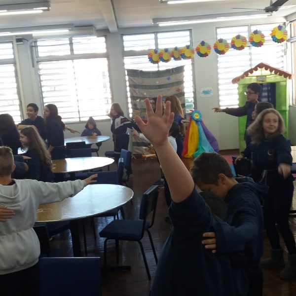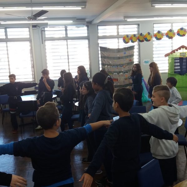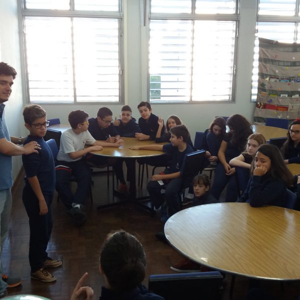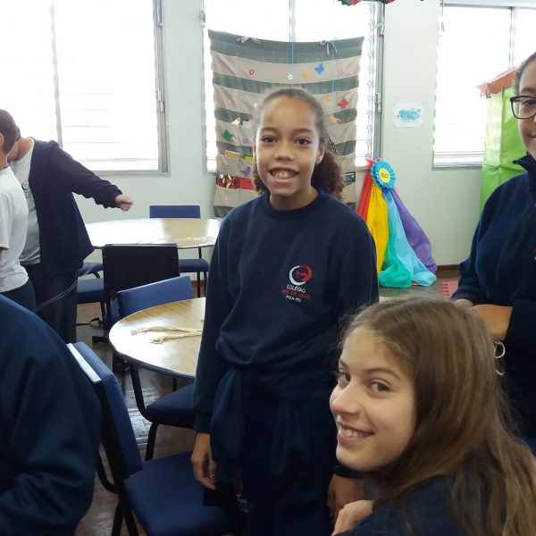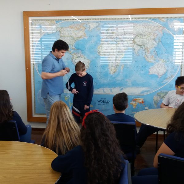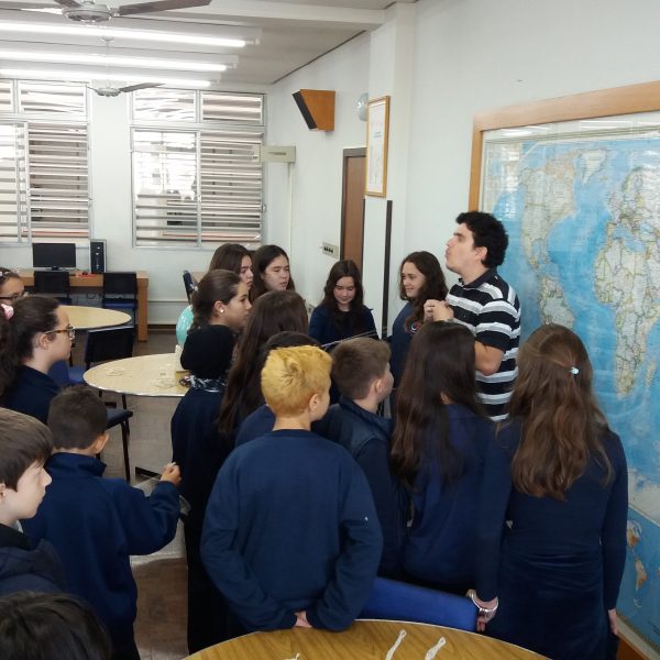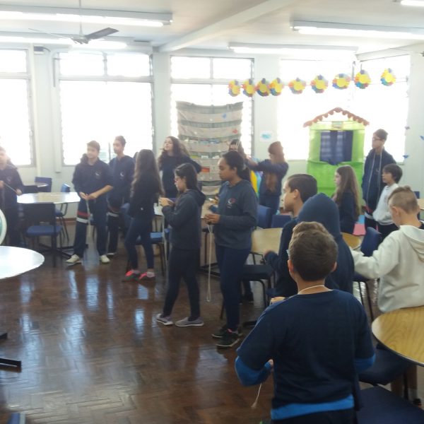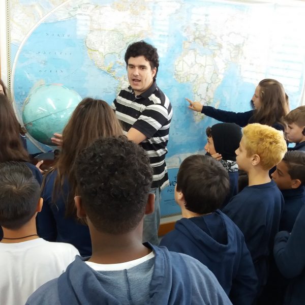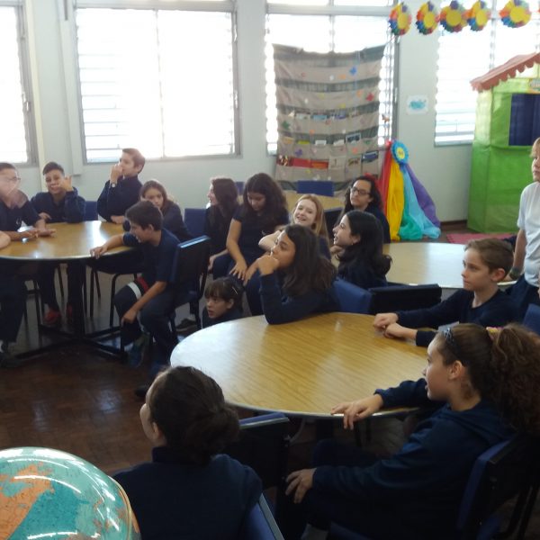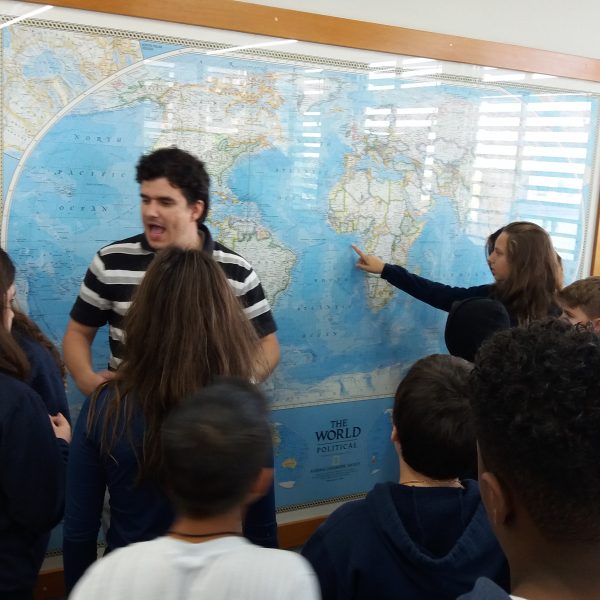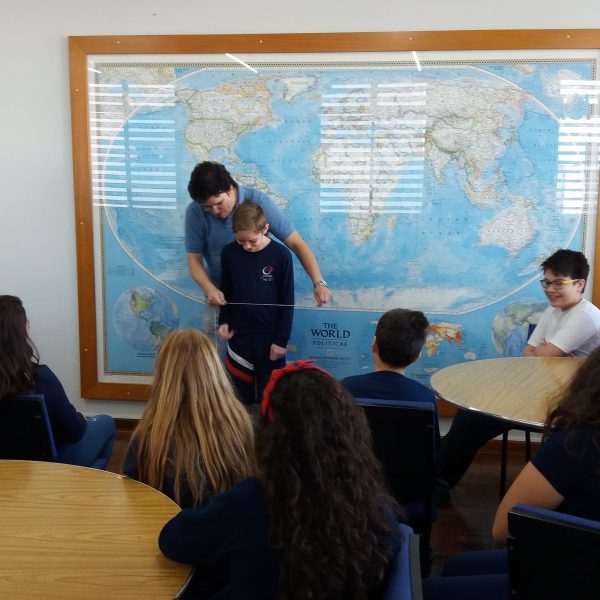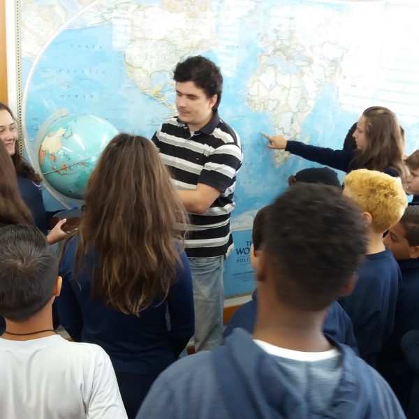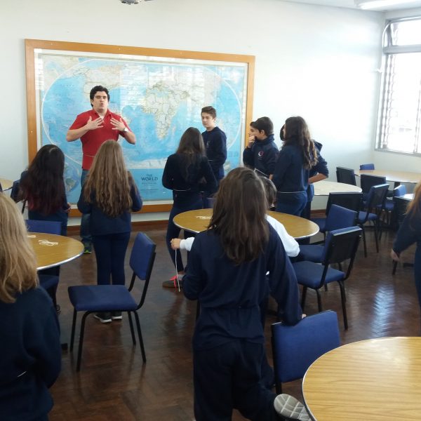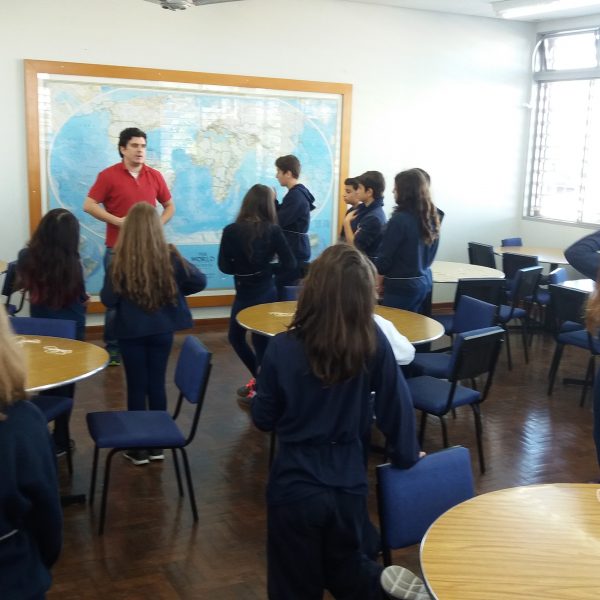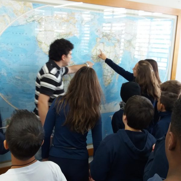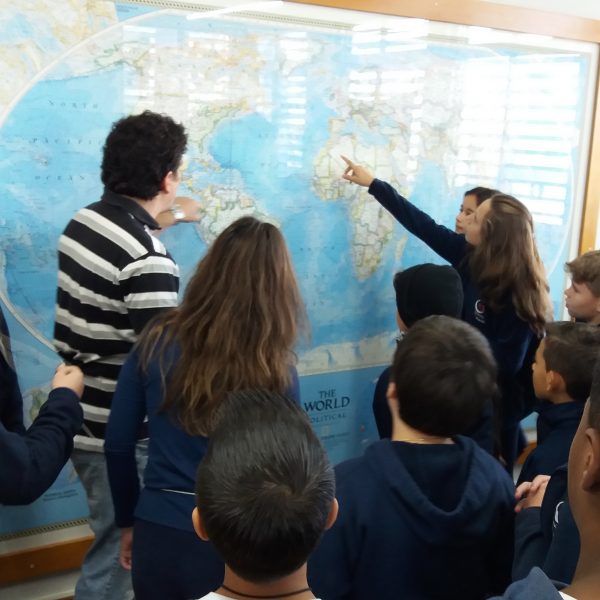 Nas aulas de geografia as turmas do 6º ano do Ensino Fundamental foram convidadas a desenvolver uma atividade junto ao “Mapa Mundi” localizado na sala de pesquisa da biblioteca.