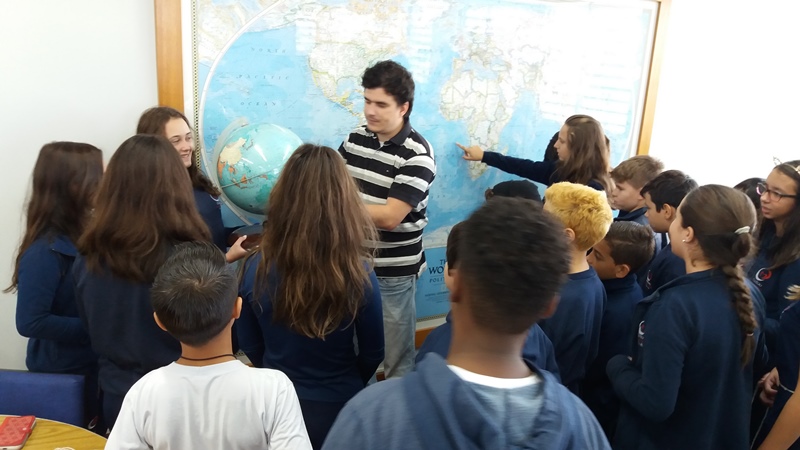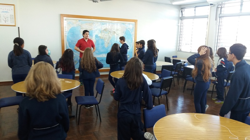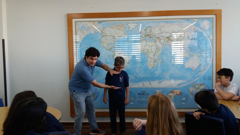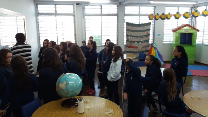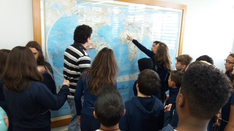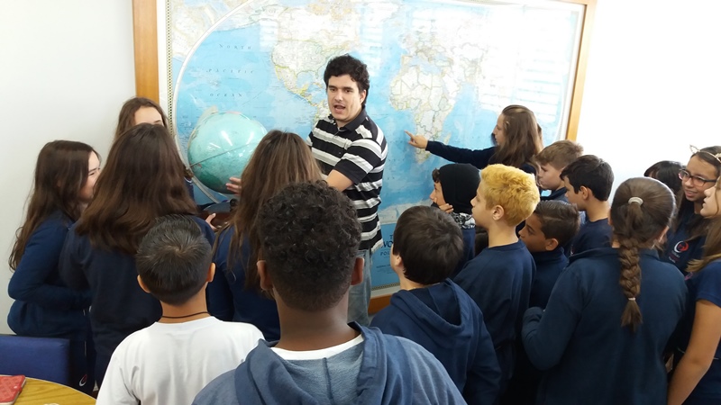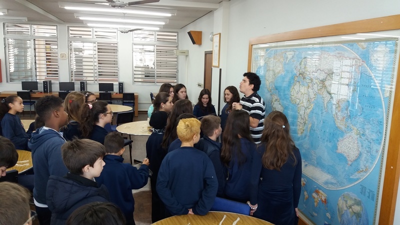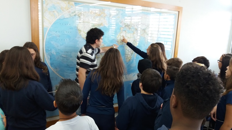 Nas aulas de geografia as turmas do 6º ano do Ensino Fundamental foram convidadas a desenvolver uma atividade junto ao “Mapa Mundi” localizado na sala de pesquisa da biblioteca.