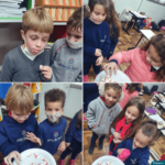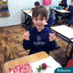 As turmas do 1º Ano do Ensino Fundamental fizeram uma experiência, a partir do livro “O grande rabanete”, contextualizado com os estudos sobre os cinco sentidos do corpo humano e as lições aprendidas no Programa Líder em Mim.